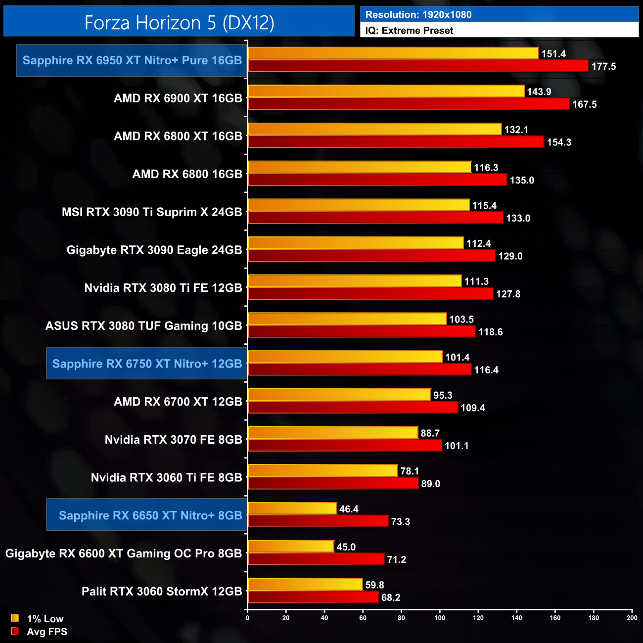 Despite not being sponsored by AMD, Forza Horizon 5 sees a massive performance swing in favour of the Radeon GPUs. Even the RX 6800 is faster than the RTX 3090 Ti at 1080p, so it's no surprise to see the RX 6950 XT dominating at every resolution tested. The RX 6750 XT is also fiercely competitive, out-doing the RTX 3070 at every resolution, too.