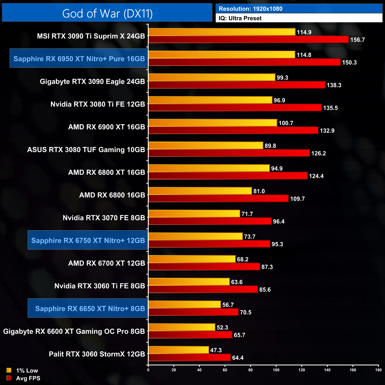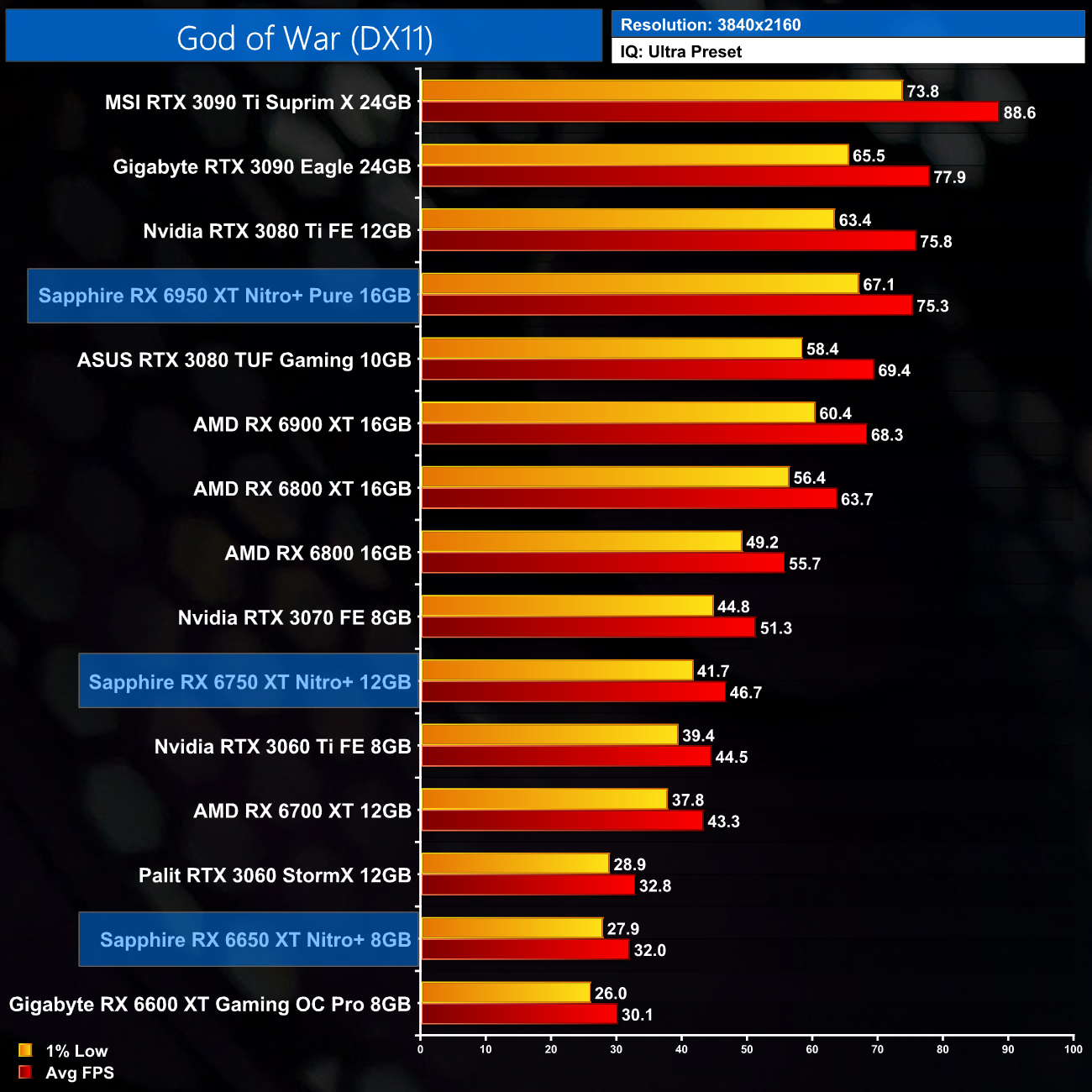 God of War is more favourable to Nvidia graphics cards, but we can still see the kind of performance improvements we have come to expect from the RX650 series – the RX 6650 XT is 7% faster than its predecessor, while the 6750 XT adds 8-9% performance over the RX 6700 XT. Compared to its Nvidia rivals however, the RX 6950 XT is underperforming, falling just short of the RTX 3080 Ti at 4K.