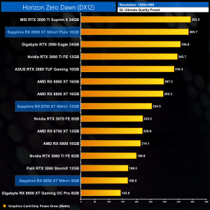 Moving onto Red Dead Redemption 2, this is one of the better games for the RX650 series of cards. At 1080p, we are looking at an 8% performance improvement for the RX 6650 XT, when compared against the 6600 XT, while the 6750 XT is 7% ahead of the RX 6700 XT. The Nitro+ 6950 XT is once more top of the chart however, just edging ahead of the RTX 3090 Ti.