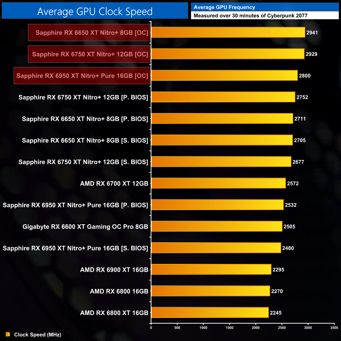 All three overclocks resulted in pretty sizeable increases to the average clock speed of the cards in question, though most impressive is the RX 6950 XT, which ran almost 300MHz faster than it did out of the box.
