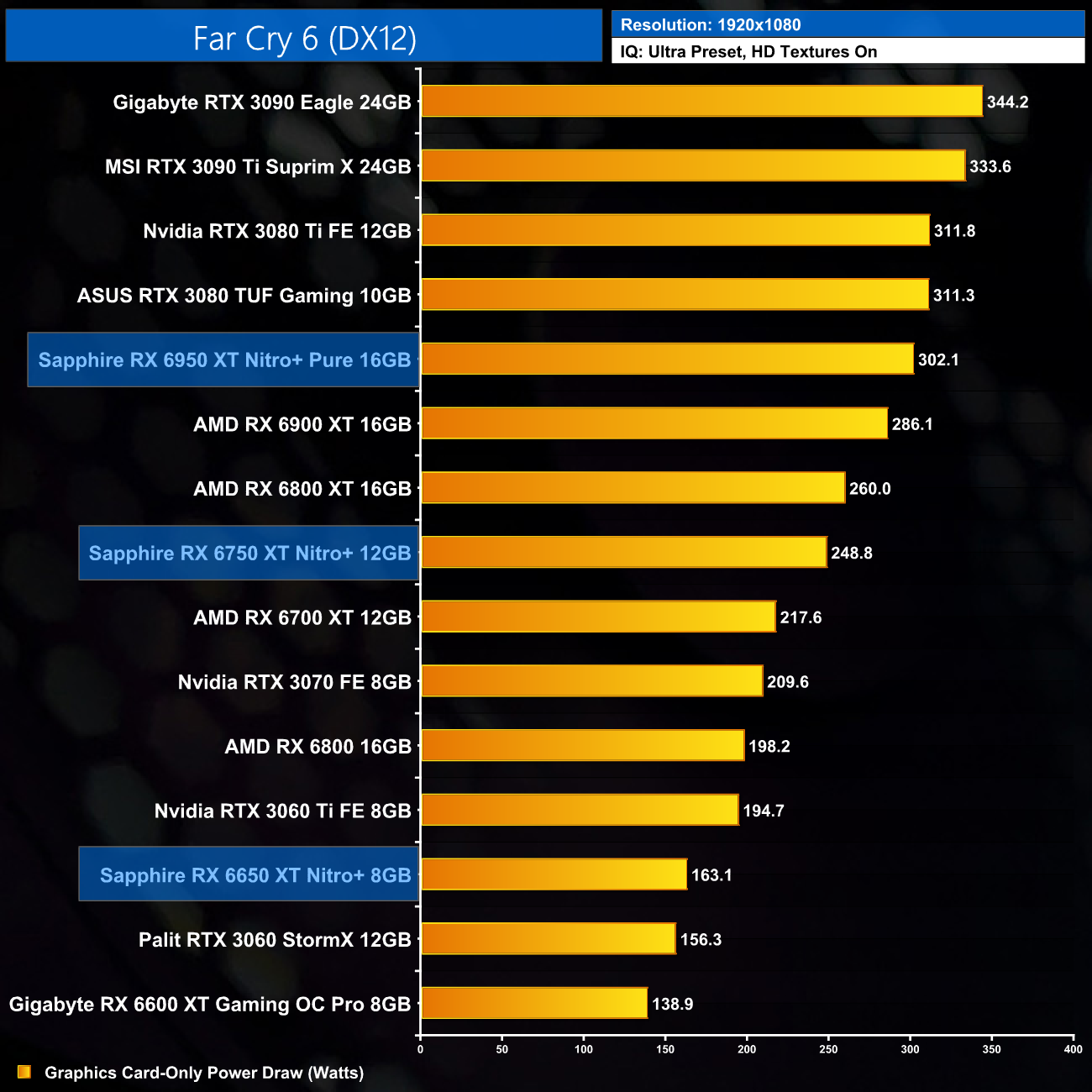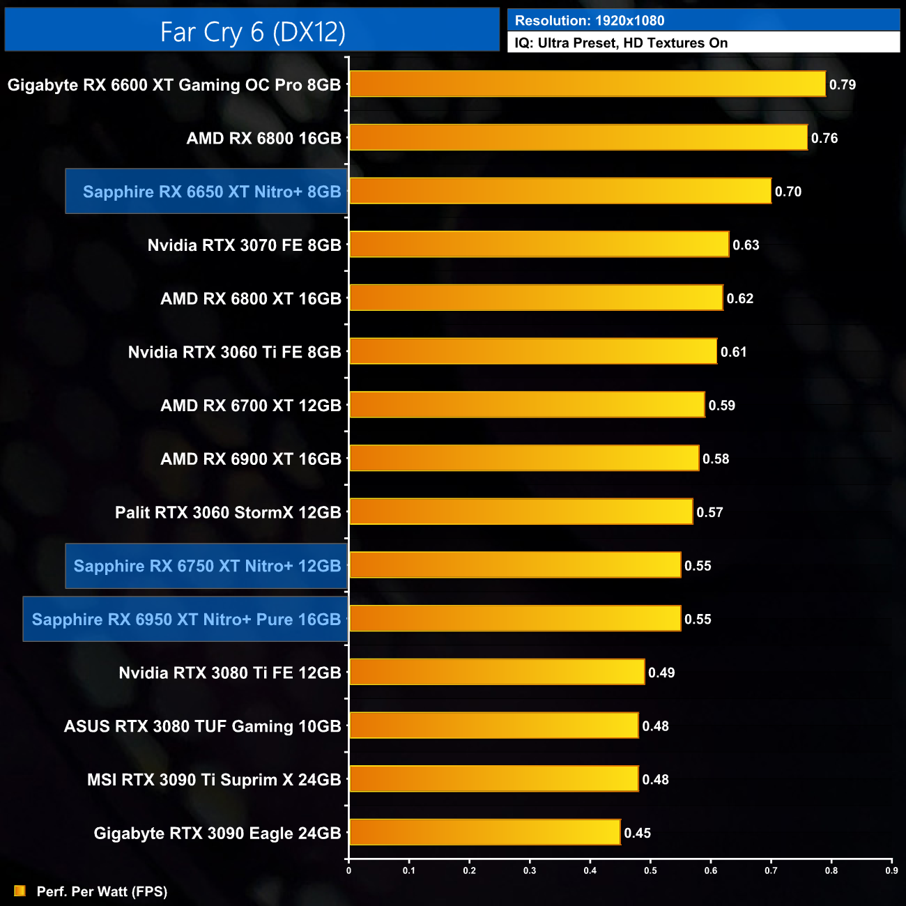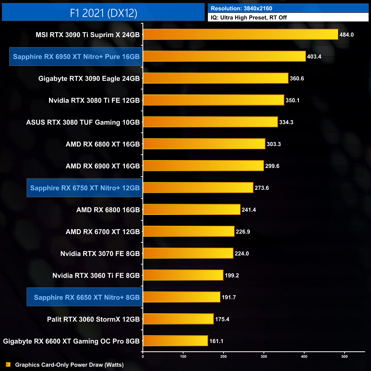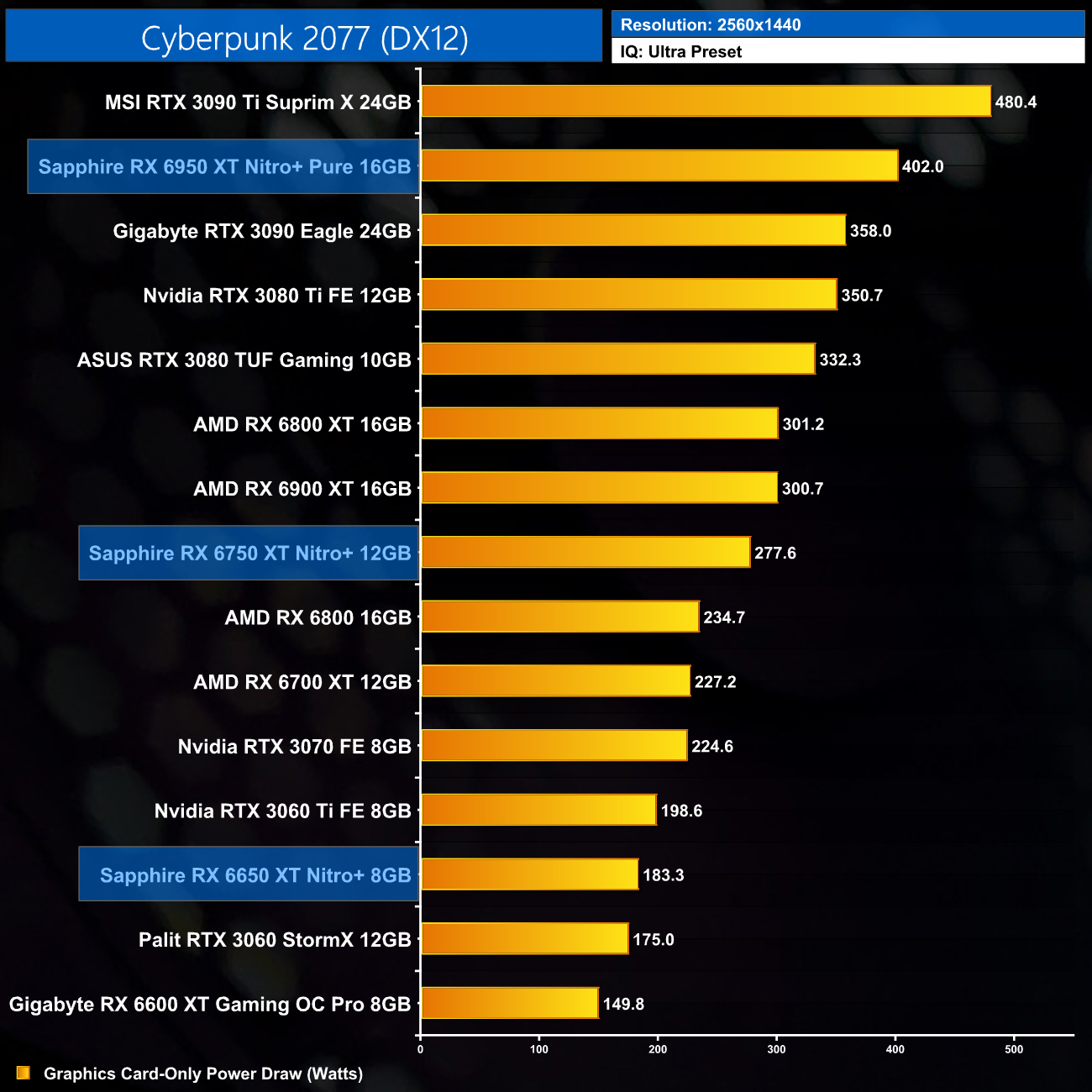 I have already mentioned this, but I do just want to stress that these results are very much a best case scenario for the RX 6X50 series, as we are testing Sapphire's heavily overclocked Nitro+ cards. The RX 6950 XT Nitro+ Pure, for instance, ships with an 11% factory overclock compared to the reference RX 6950 XT. As ever other card we have tested, bar the MSI RTX 3090 Ti, has been benchmarked at reference clock speed, this will slightly skew the data. If we were comparing reference models against reference models, I would expect smaller margins than what is shown here.