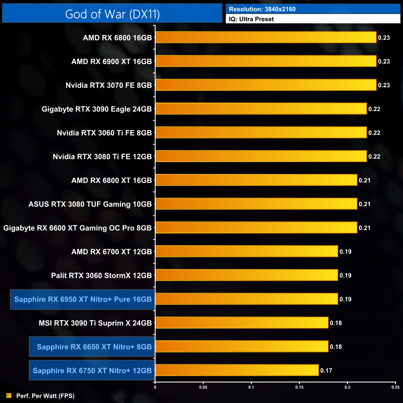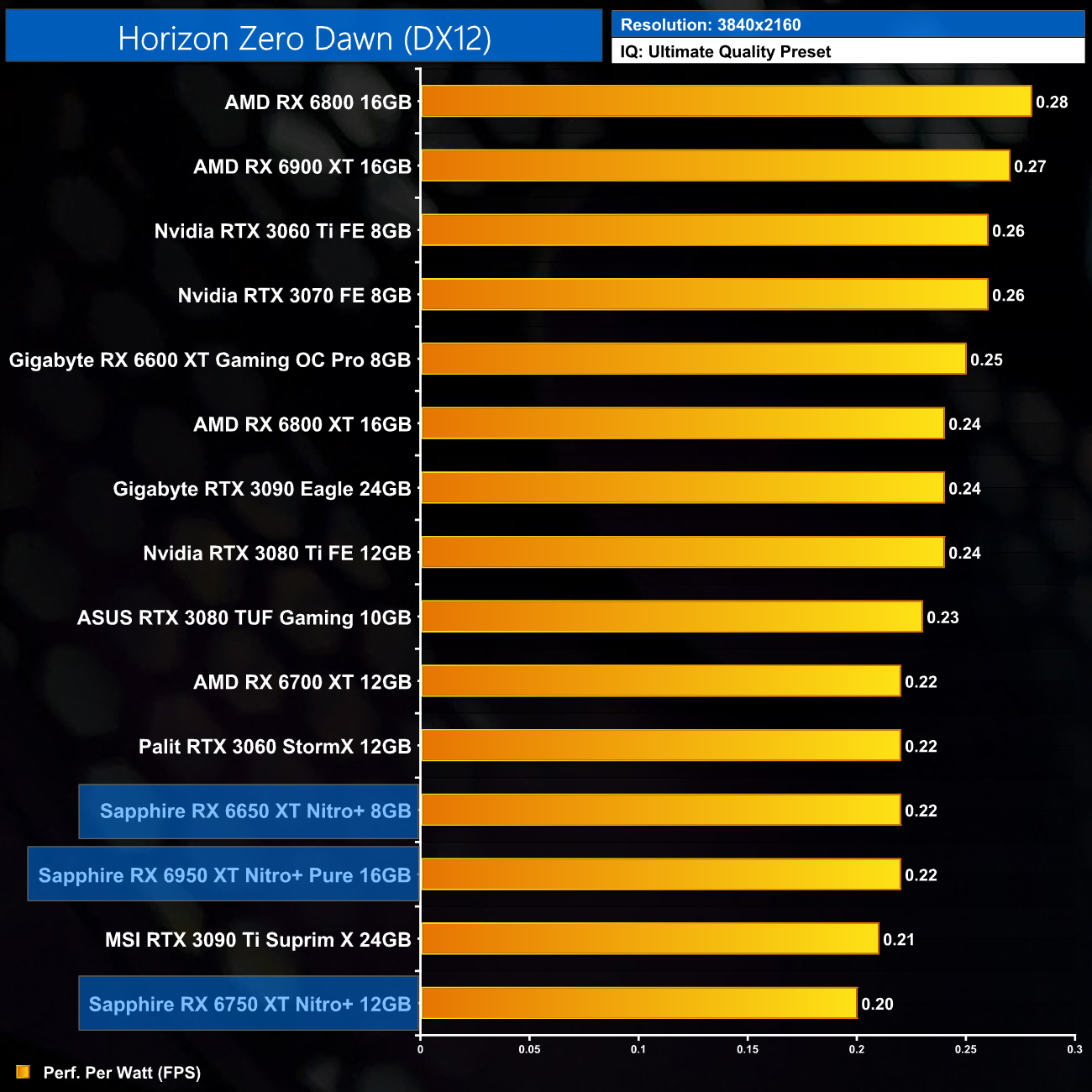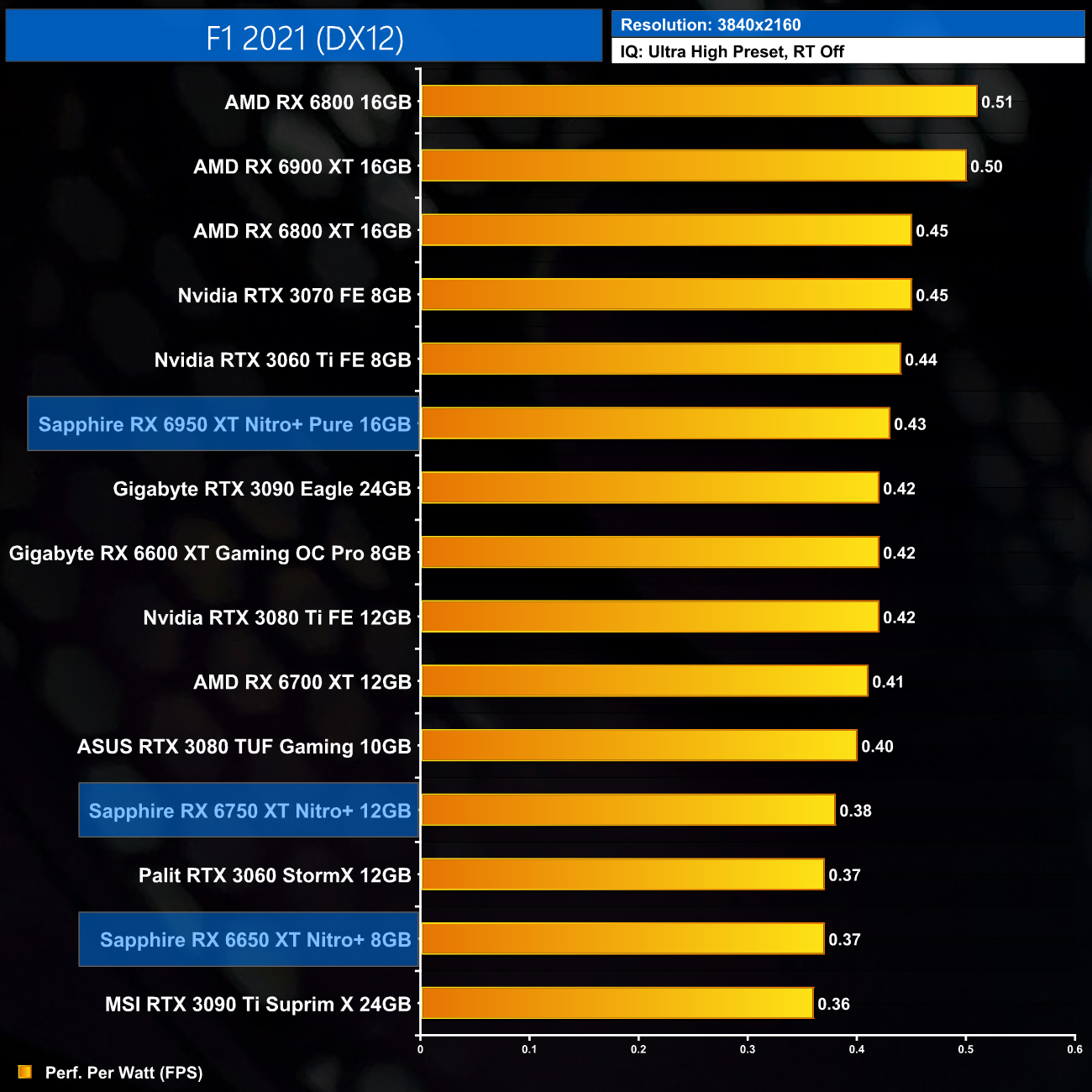 And then at 4K, we can see the RX 6950 XT Nitro+ is now 19% less efficient than the original RX 6900 XT. That's the price you pay to push clock speeds that bit higher, as we quickly run into diminishing returns.