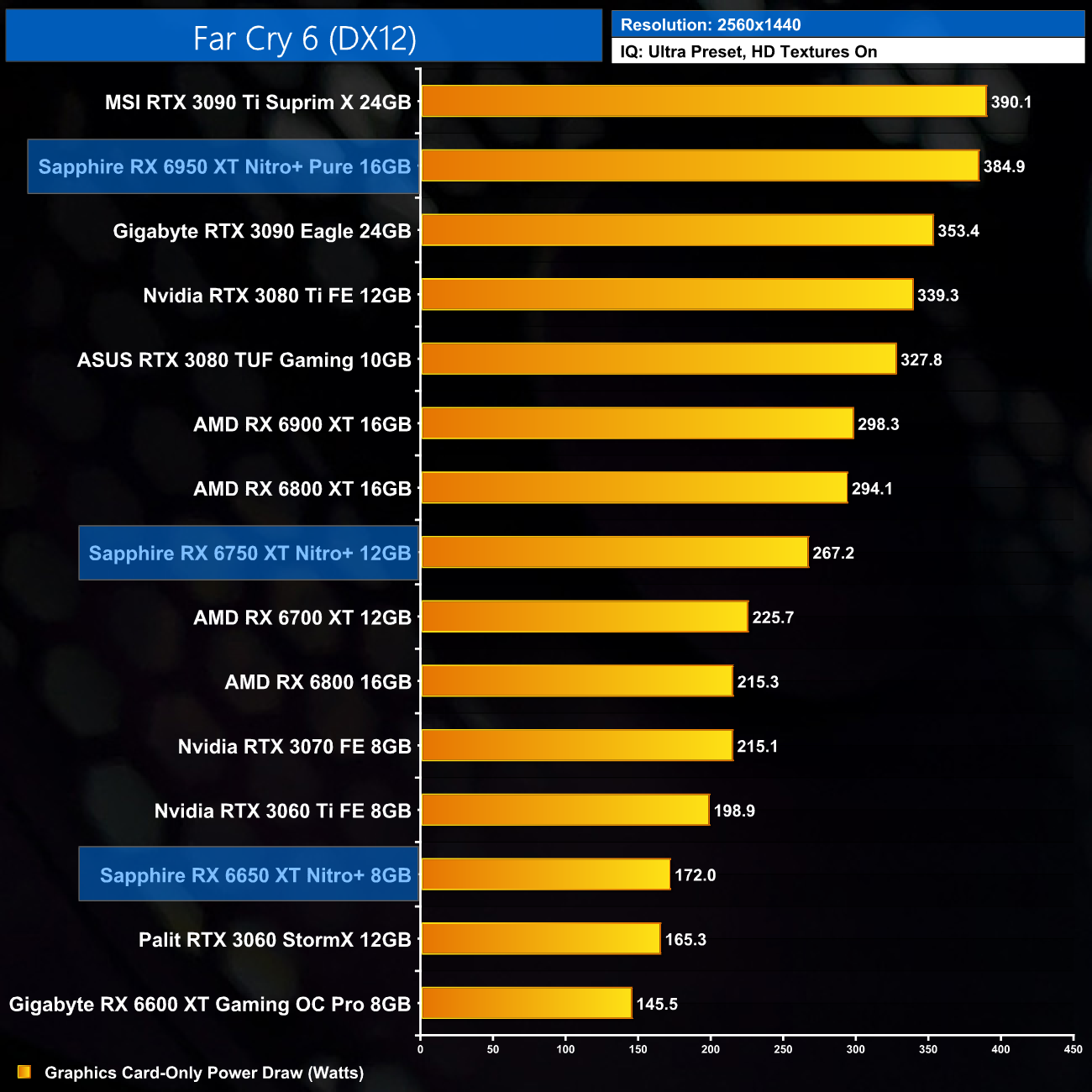 Meanwhile, at 1440p, those performance differentials are almost exactly the same. The RX 6950 XT does drop off a bit more however, coming in short of the RTX 3080 Ti, and the 6750 XT is beaten by the RTX 3060 Ti, though do remember this game does prefer Nvidia GPUs.