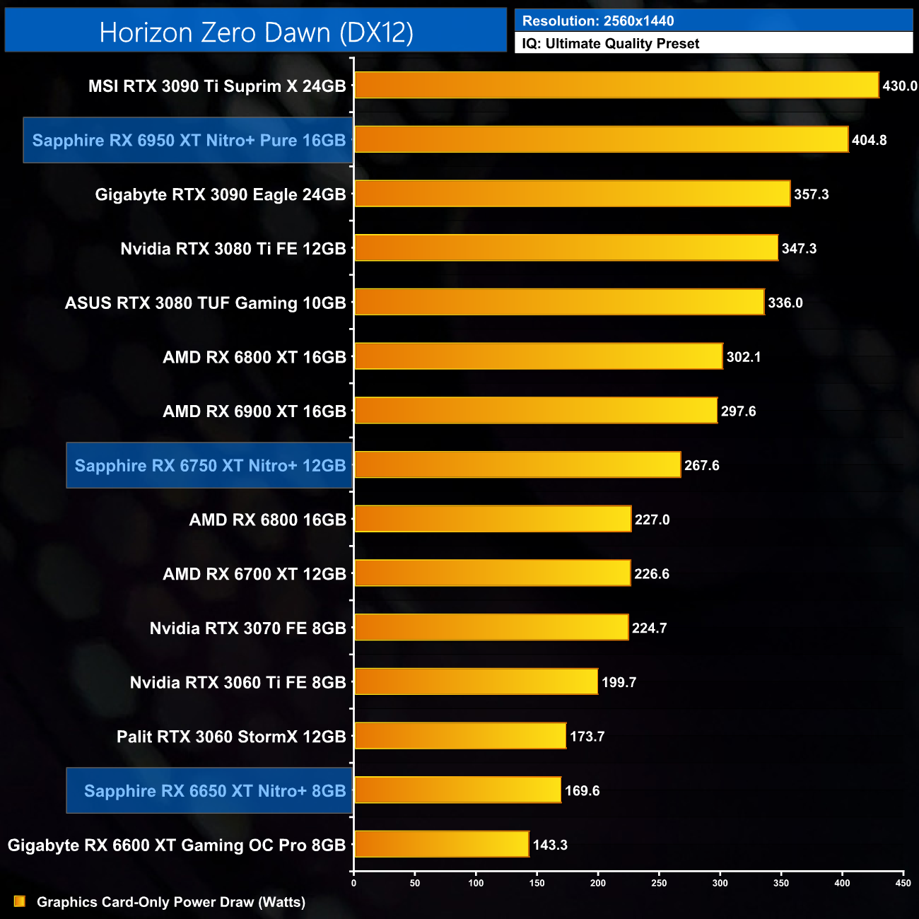 Just to re-iterate as well, these numbers don't take into account the fact that we tested three heavily factory overclocked models from the the Sapphire Nitro+ series, while our comparison cards were all tested at reference clocks. That means, if we were testing reference models against reference models, I would expect smaller margins than what is shown here – the Nitro+ Pure RX 6950 XT has an 11% factory overclock for instance, which would definitely boost performance by a decent chunk compared to a reference card.