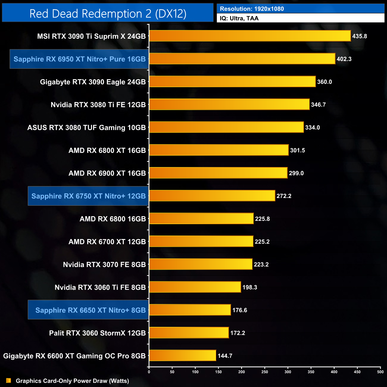 Moving onto Red Dead Redemption 2, this is one of the better games for the RX650 series of cards. At 1080p, we are looking at an 8% performance improvement for the RX 6650 XT, when compared against the 6600 XT, while the 6750 XT is 7% ahead of the RX 6700 XT. The Nitro+ 6950 XT is once more top of the chart however, just edging ahead of the RTX 3090 Ti.