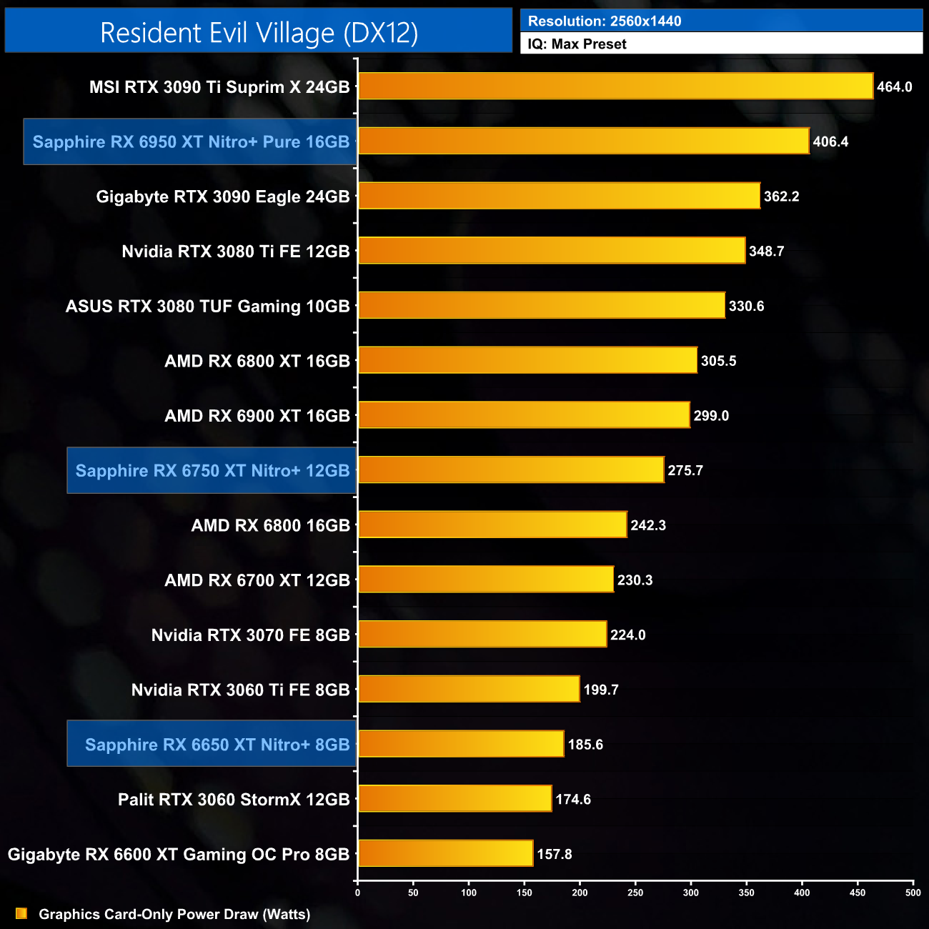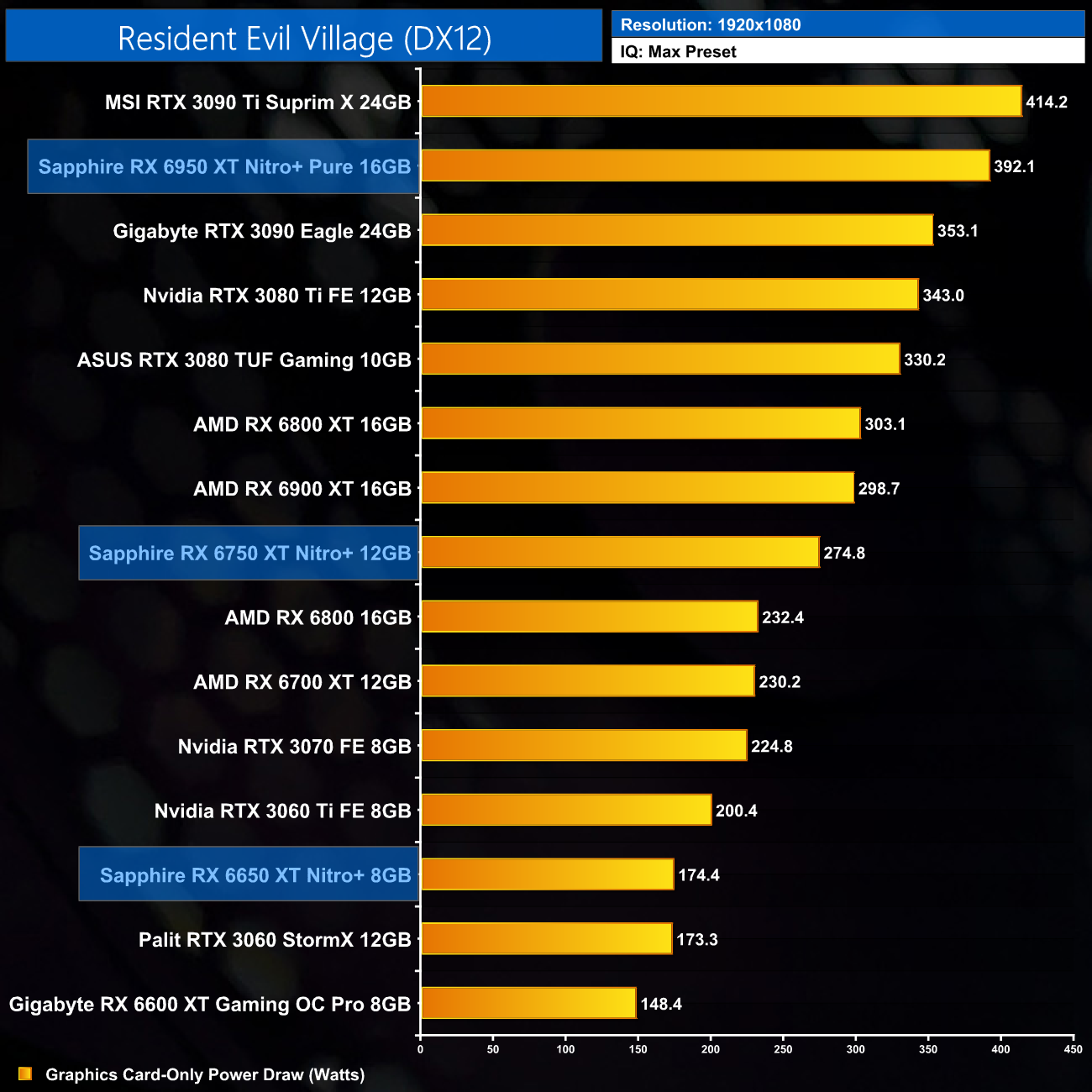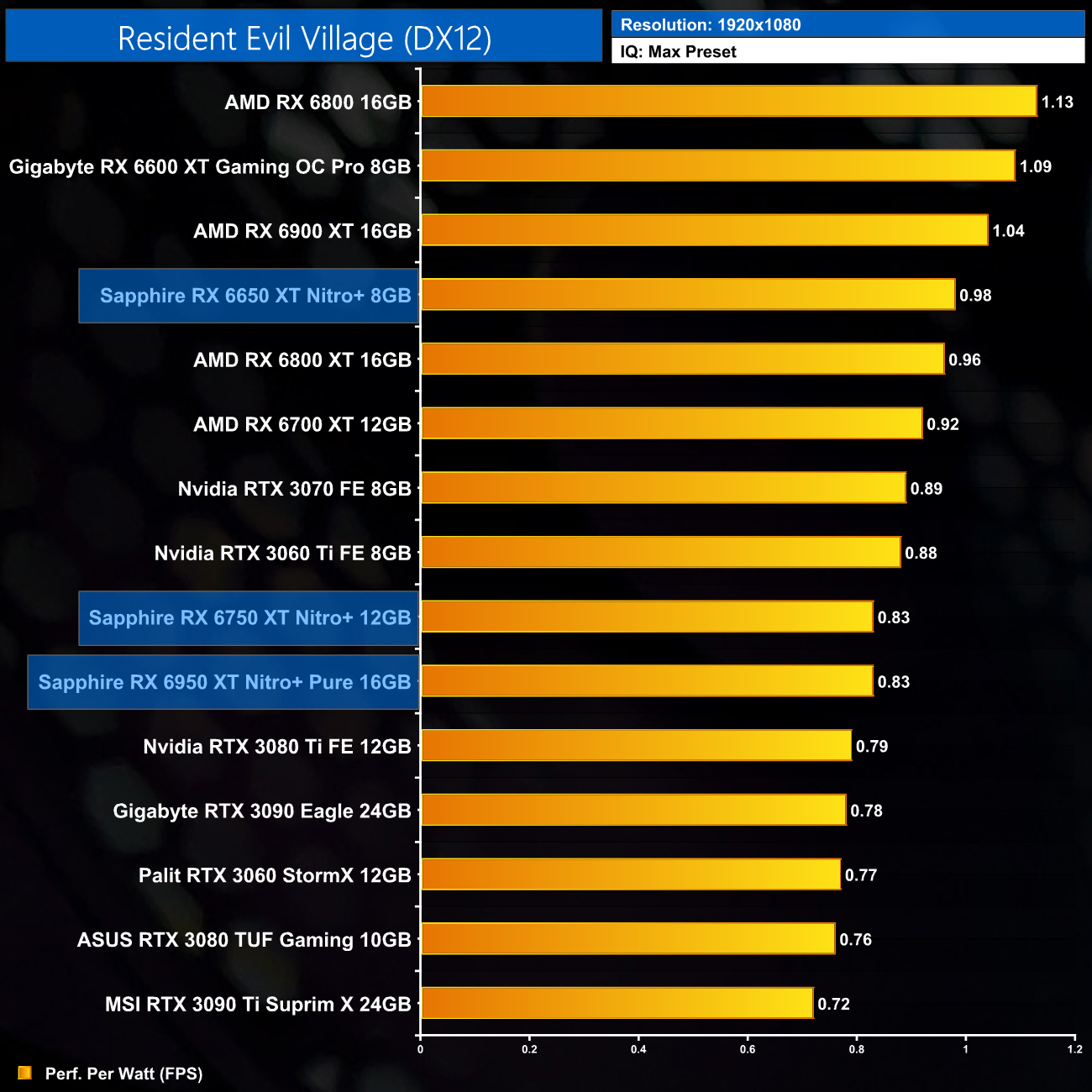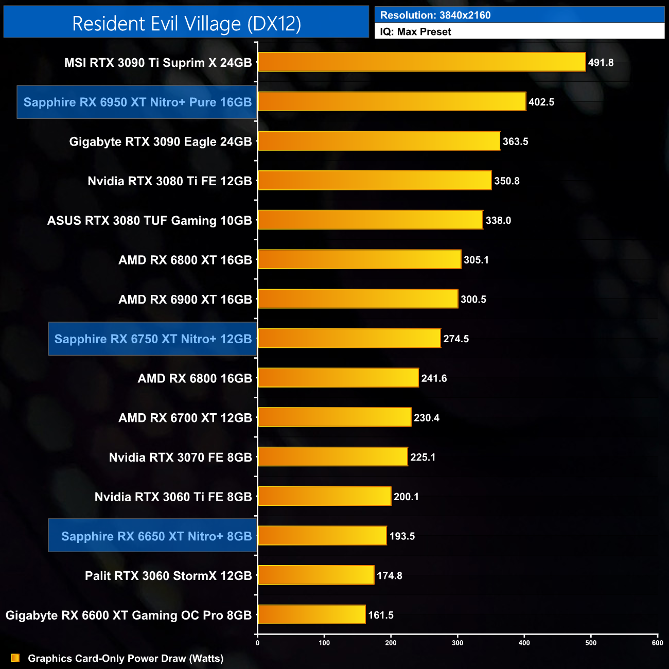 As for Resident Evil Village, this AMD-sponsored title has a heavy bias towards Team Red, and we can see the RX 6X50 cards performing strongly at every resolution. Even at 4K, the 6950 XT proves faster than the RTX 3090 Ti, and the 6750 XT is comfortably faster than the RTX 3070 at 1440p.