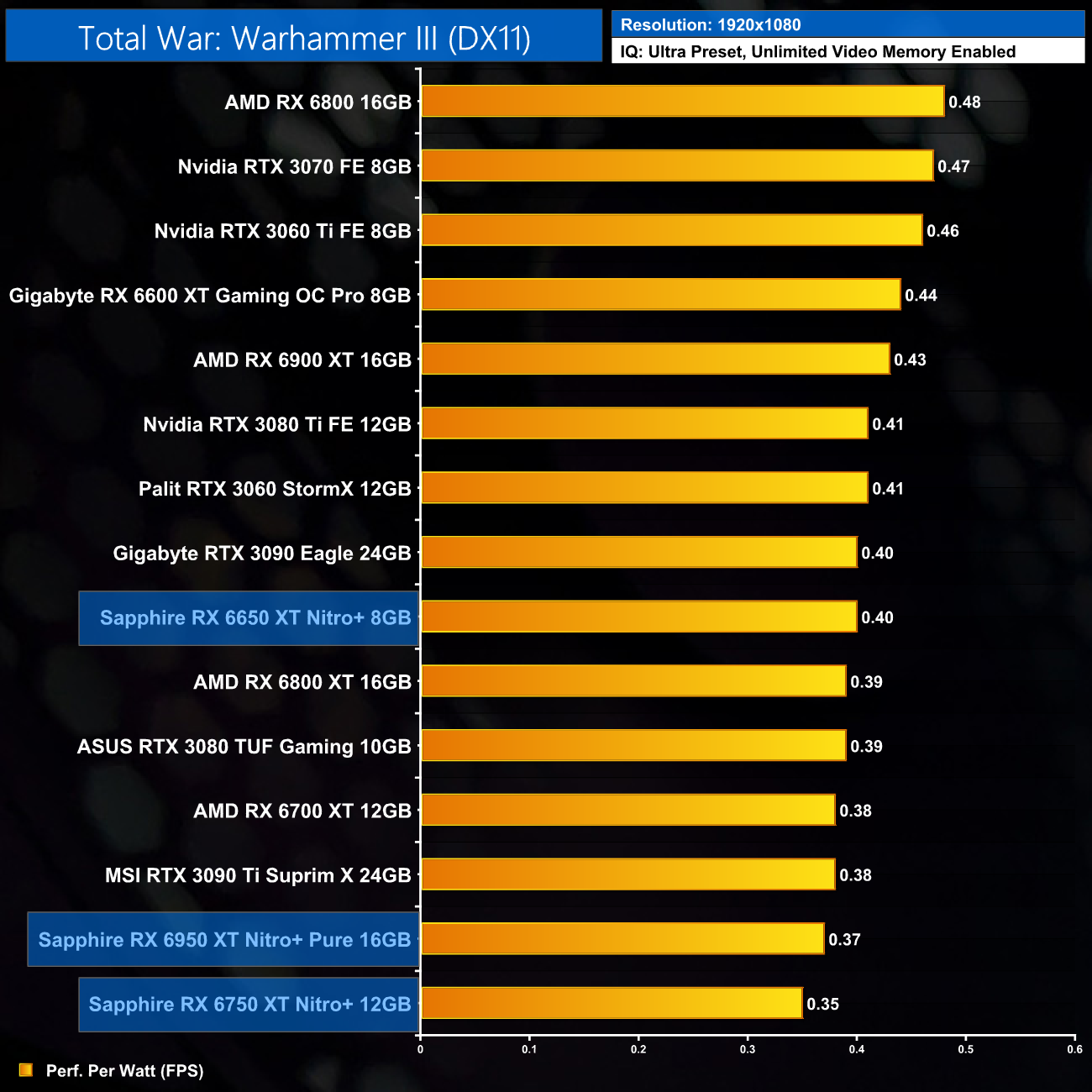 Using the graphics card-only power draw figures presented earlier in the review, here we present performance per Watt on a per-game basis for all twelve games we tested at 1080p.