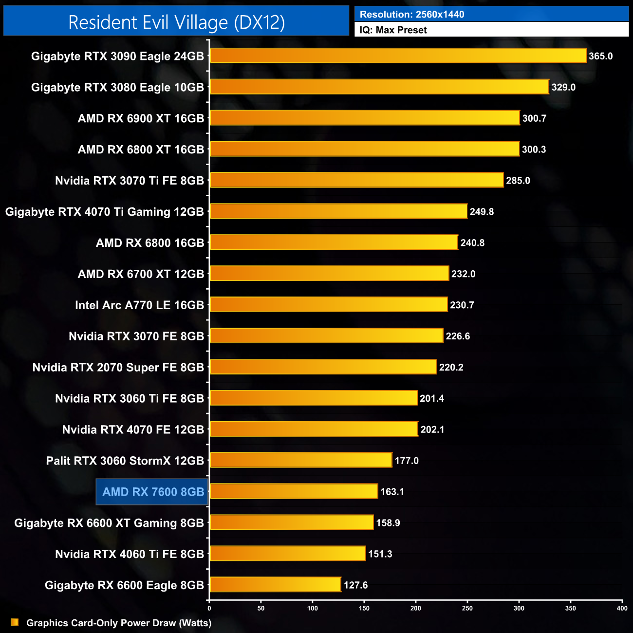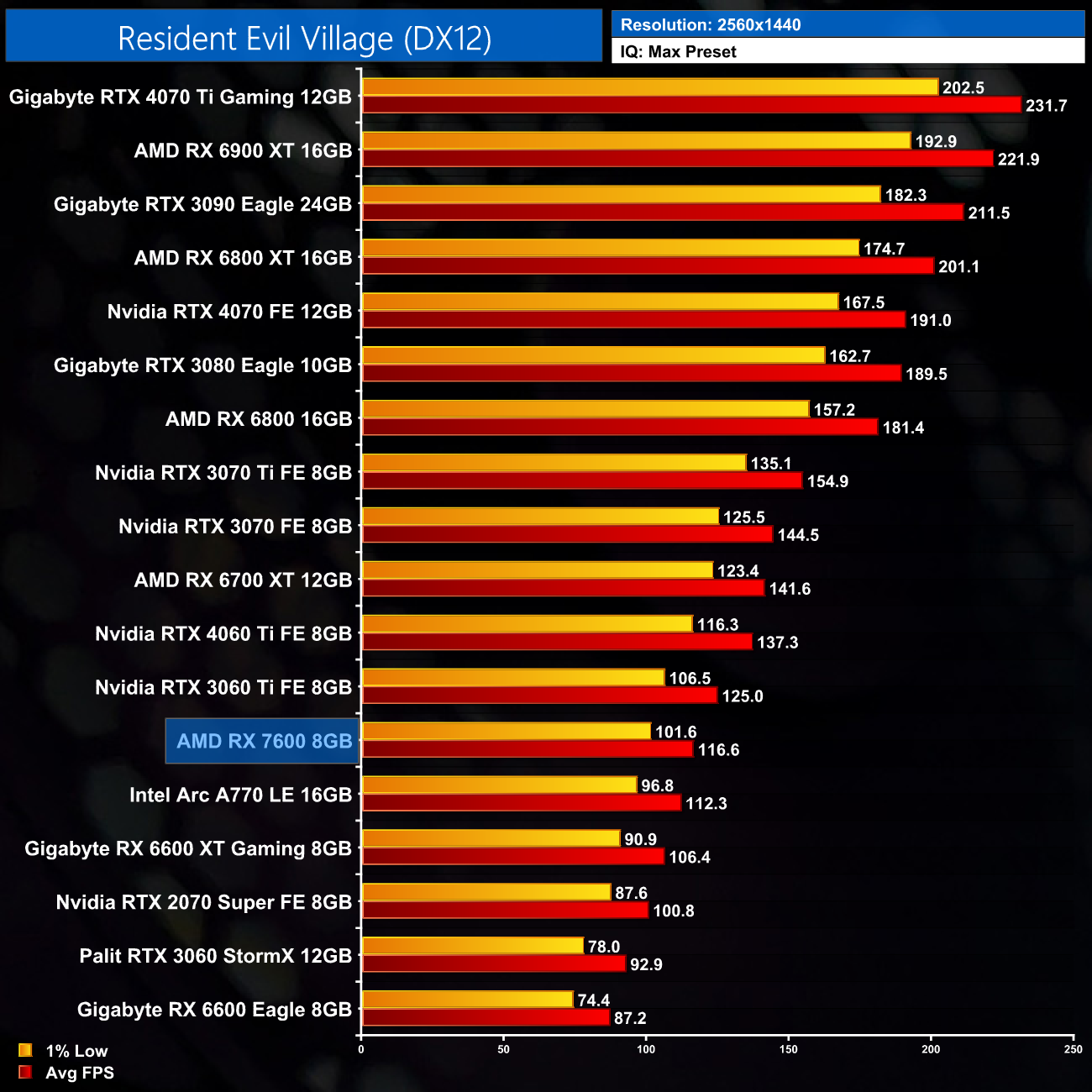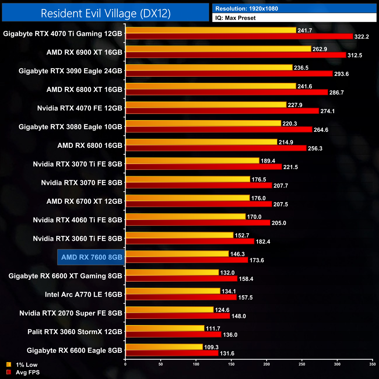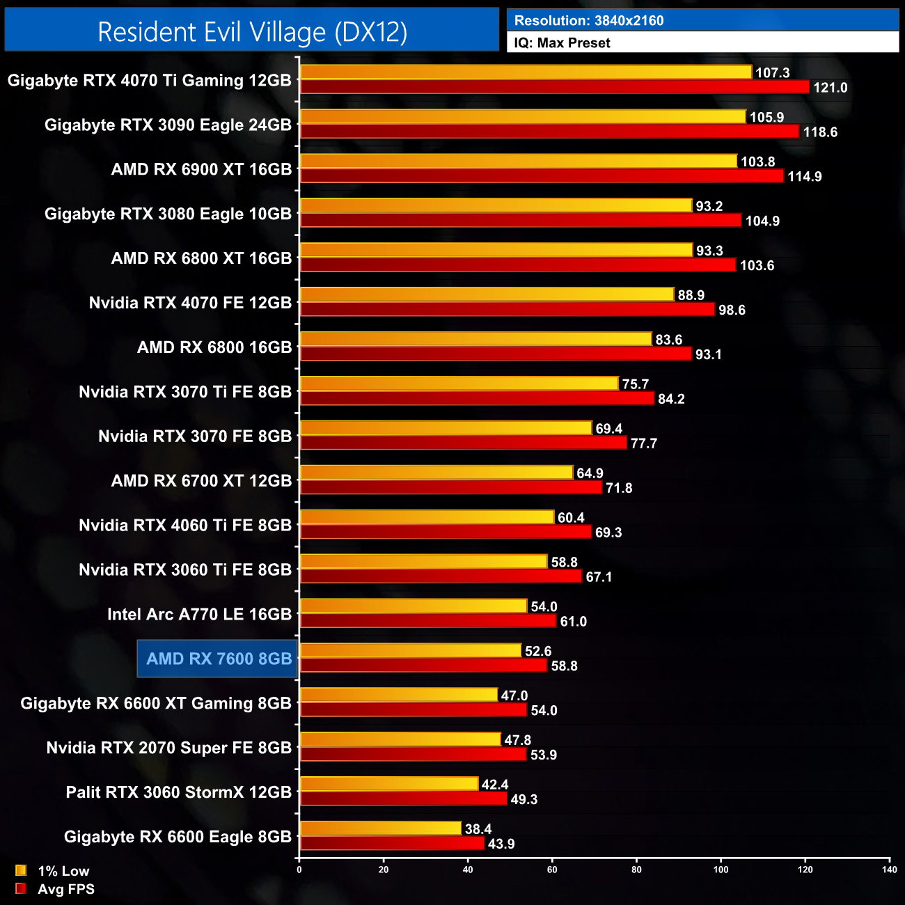 Resident Evil Village continues the impressive scaling, with the 7600 once more within touching distance of the more expensive 3060 Ti. It's also delivering 32% more performance than the RX 6600.