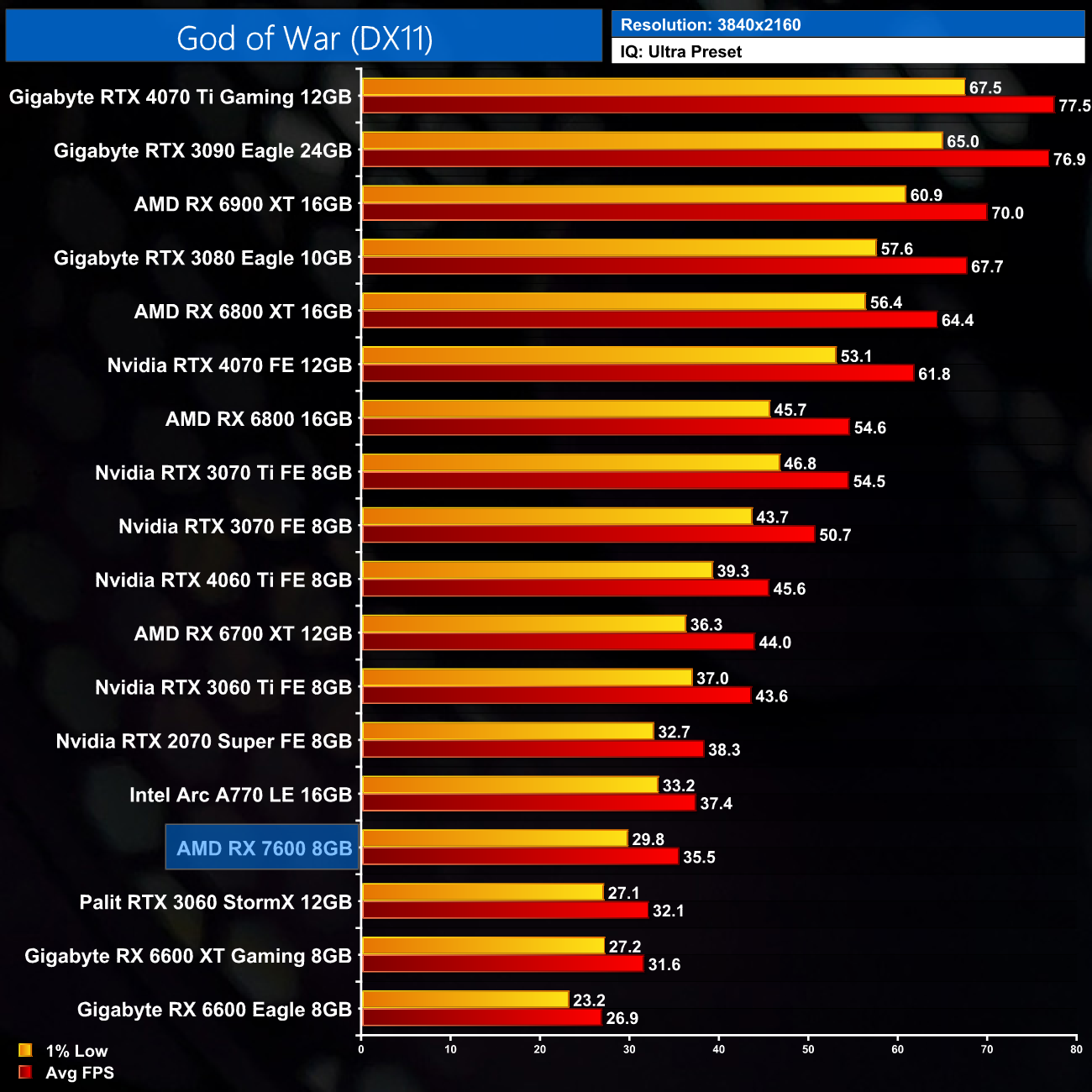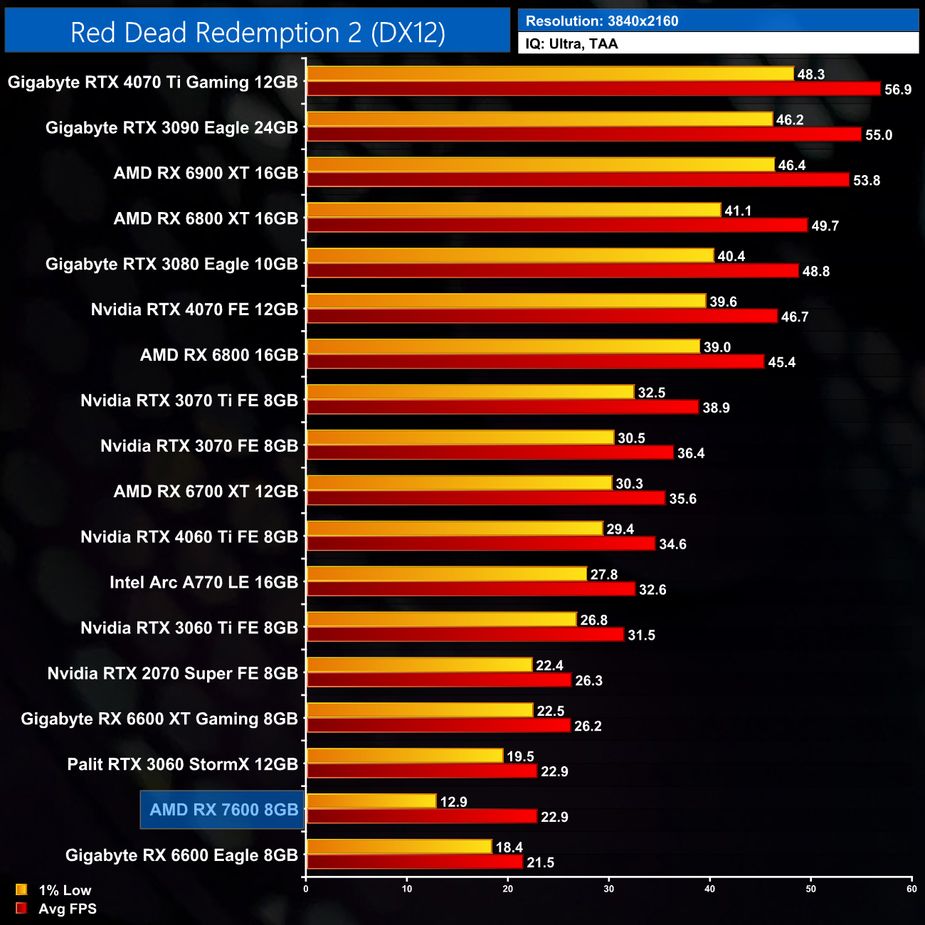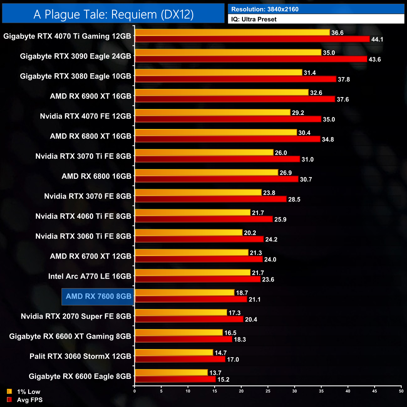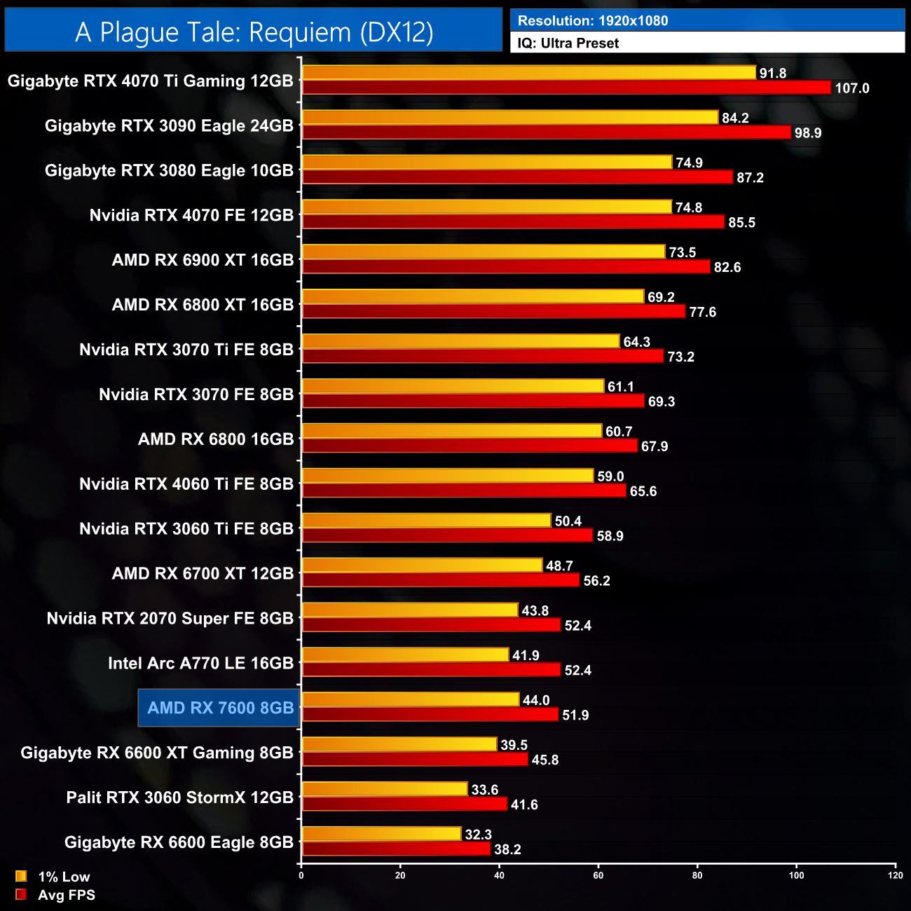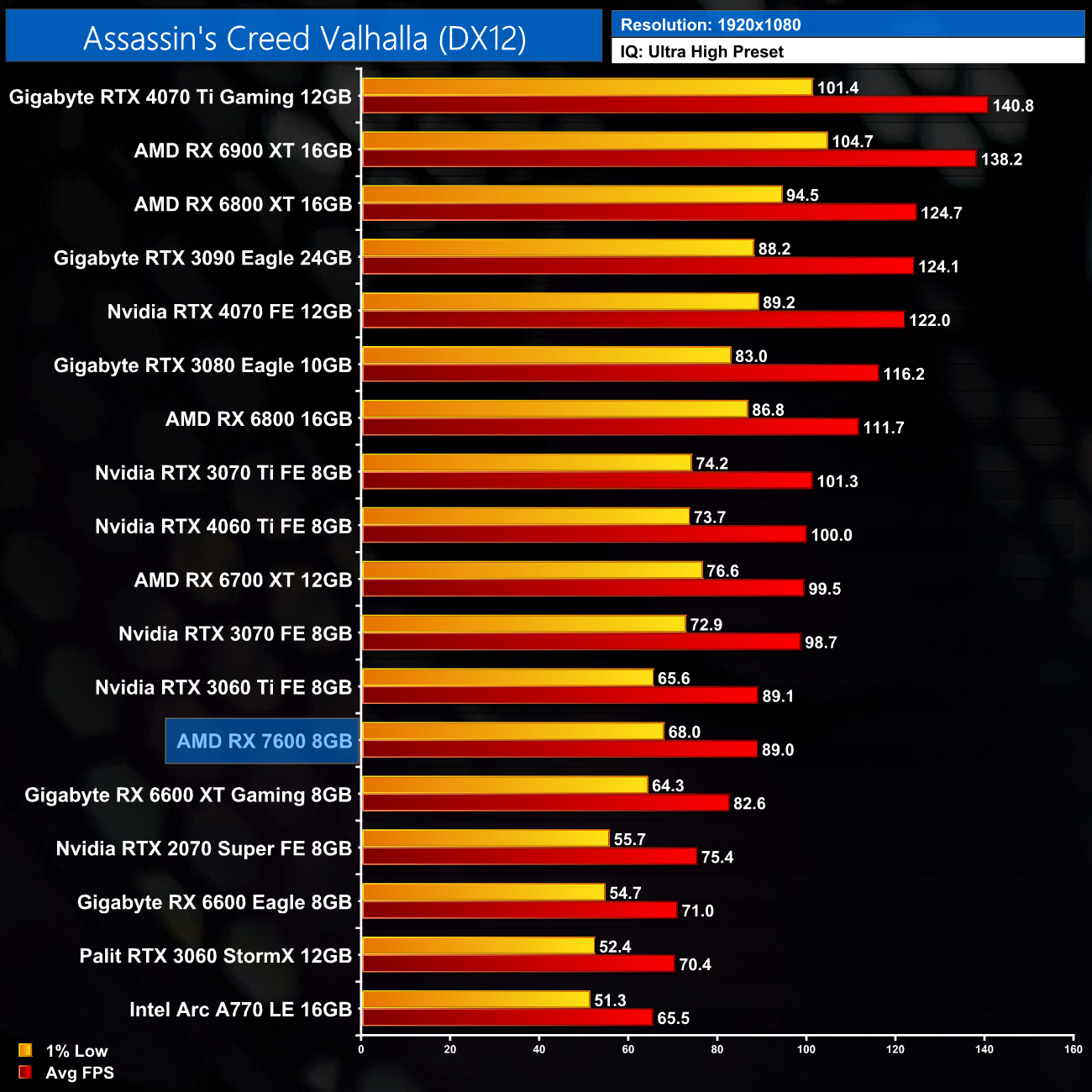 Resident Evil Village continues the impressive scaling, with the 7600 once more within touching distance of the more expensive 3060 Ti. It's also delivering 32% more performance than the RX 6600.
