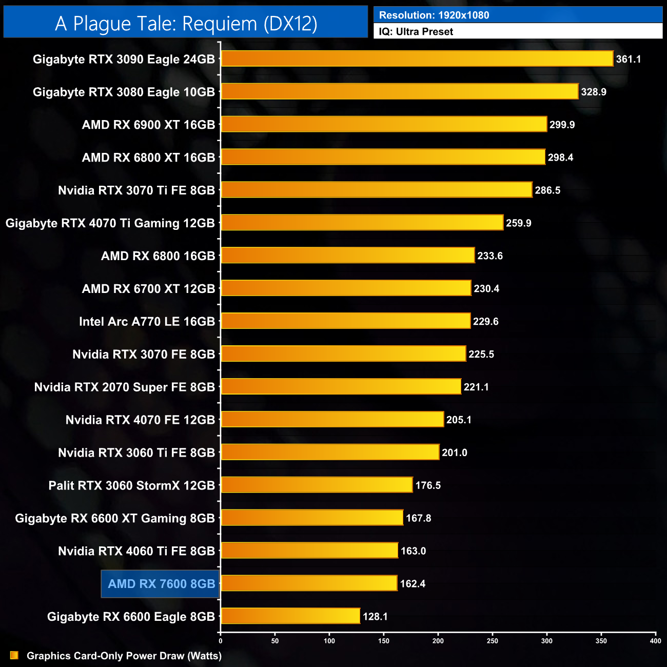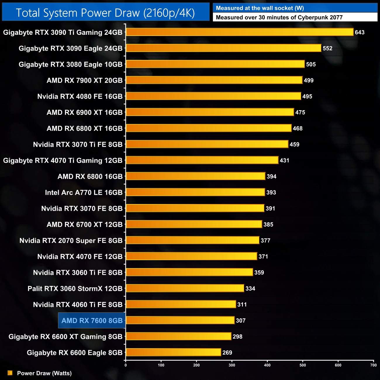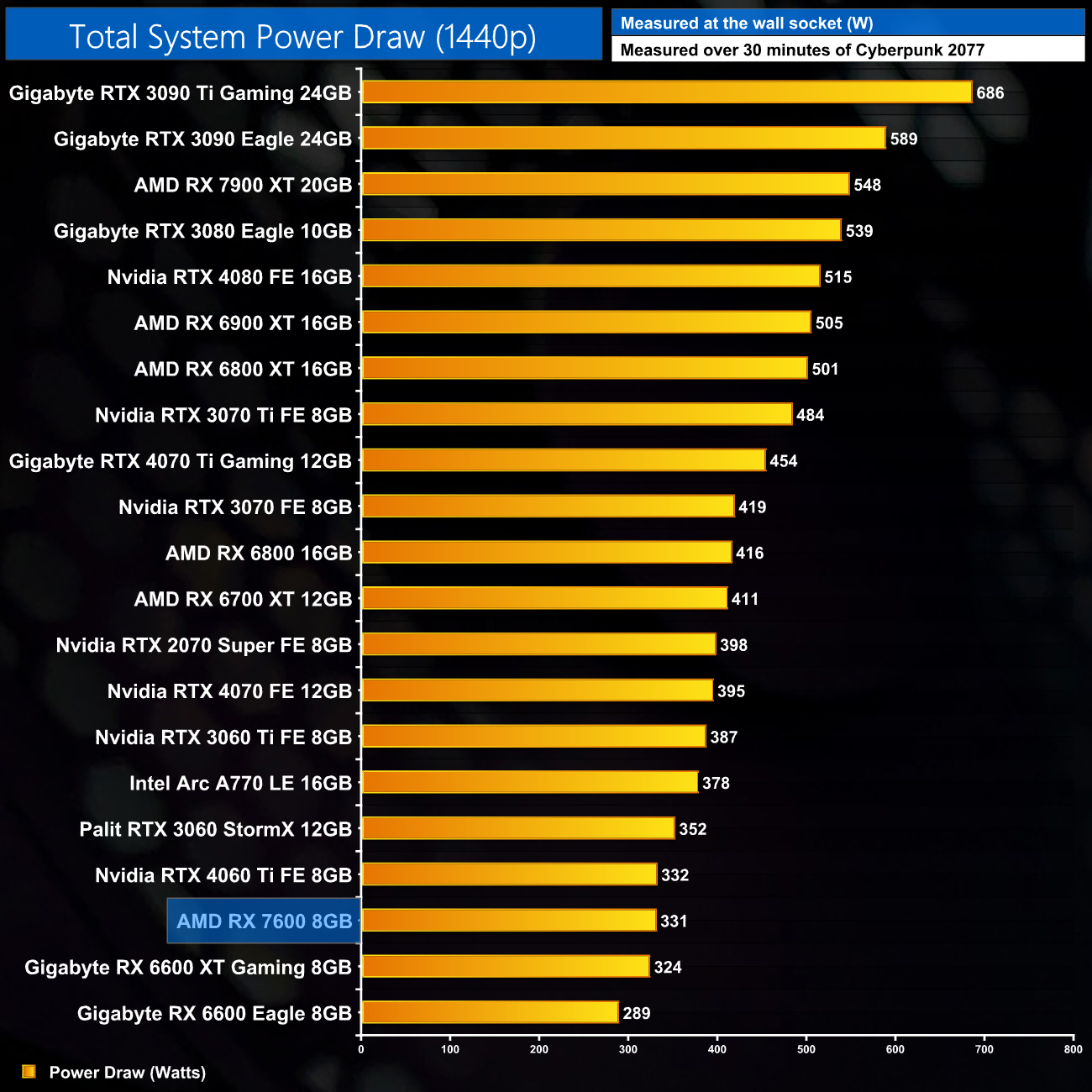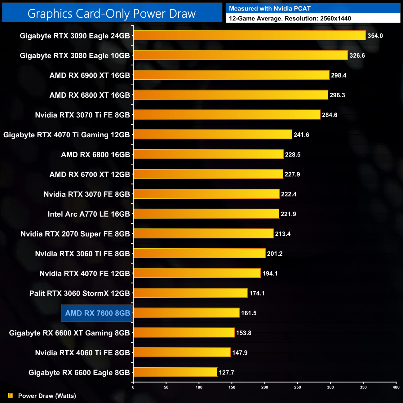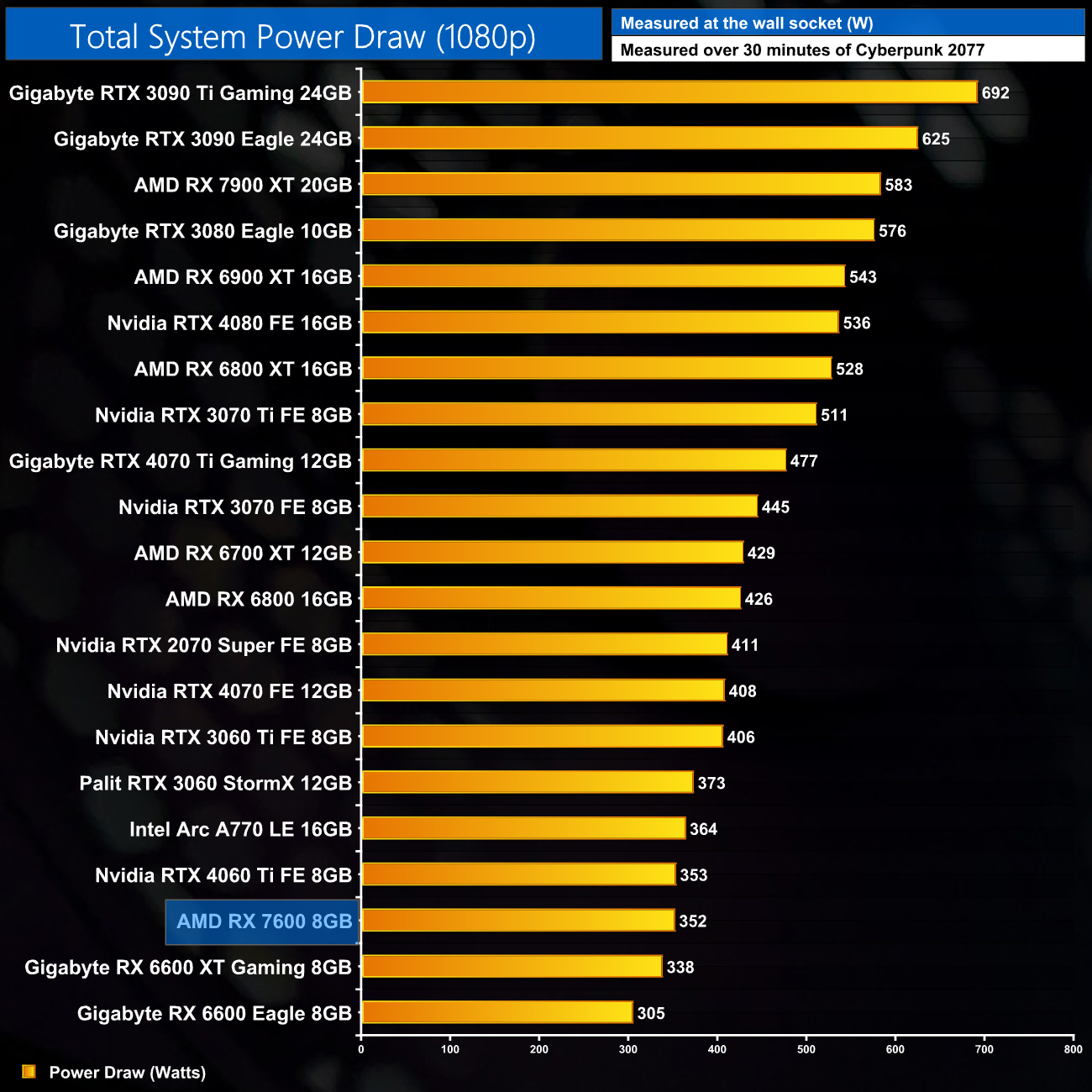 Total system power draw is similar to the RTX 4060 Ti at all resolutions, we see a peak reading of 352W at 1080p for the RX 7600. AMD officially recommends a 550W PSU, which does seem on the high side considering most users will likely pair this GPU with a mid-range CPU, and not a gas-guzzling i9-13900KS like we have here.