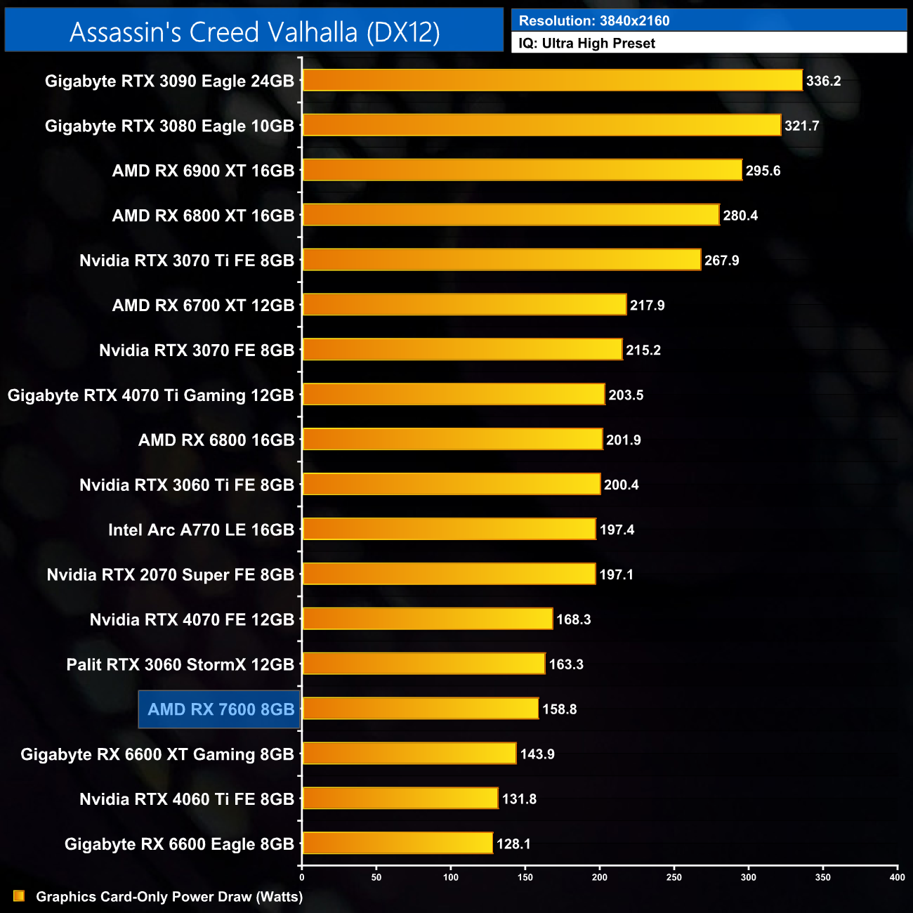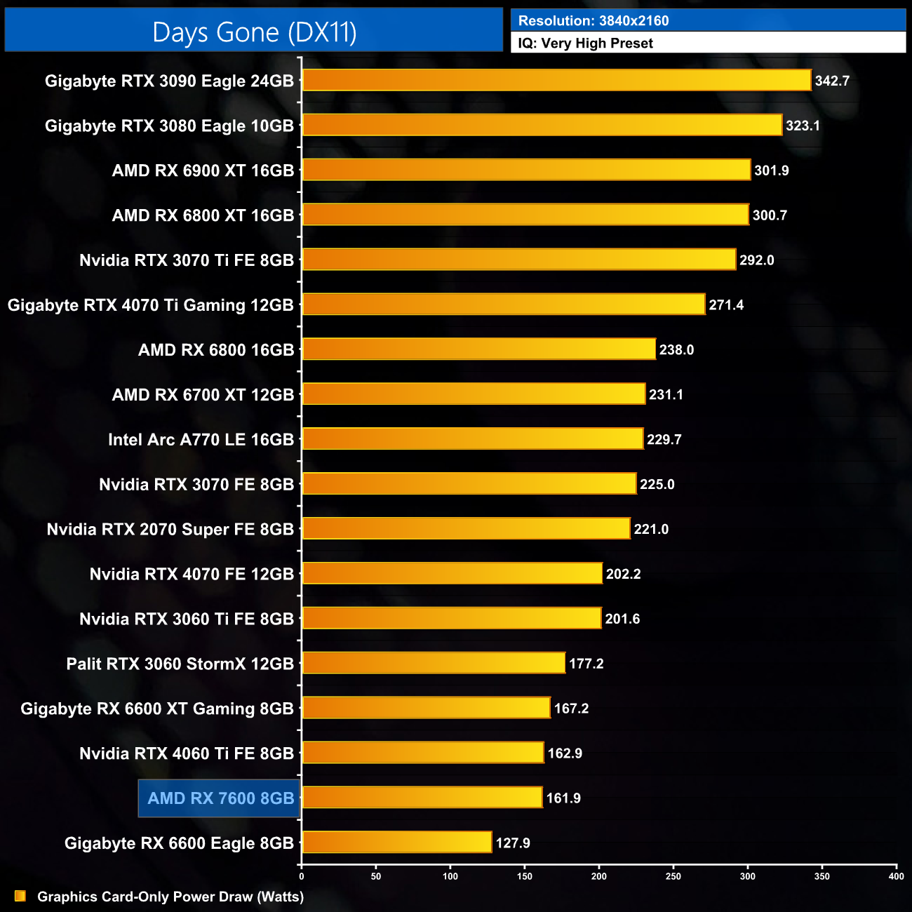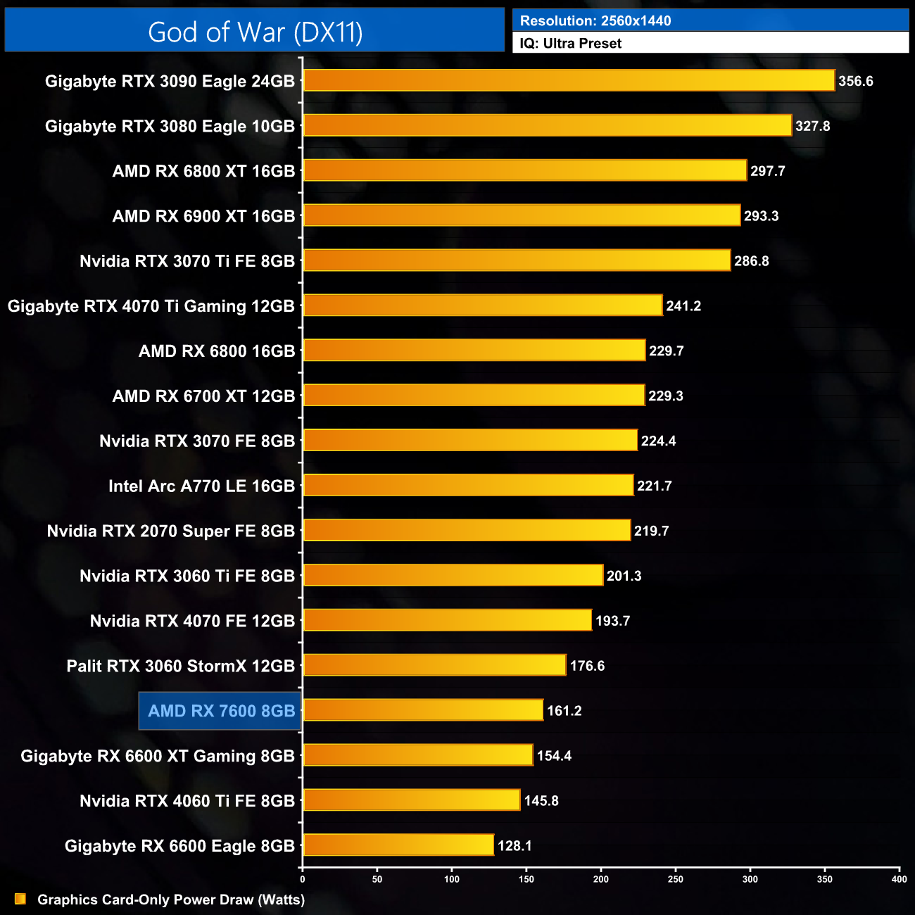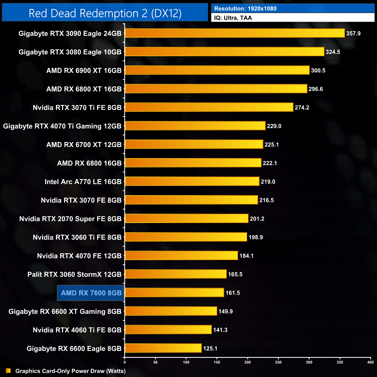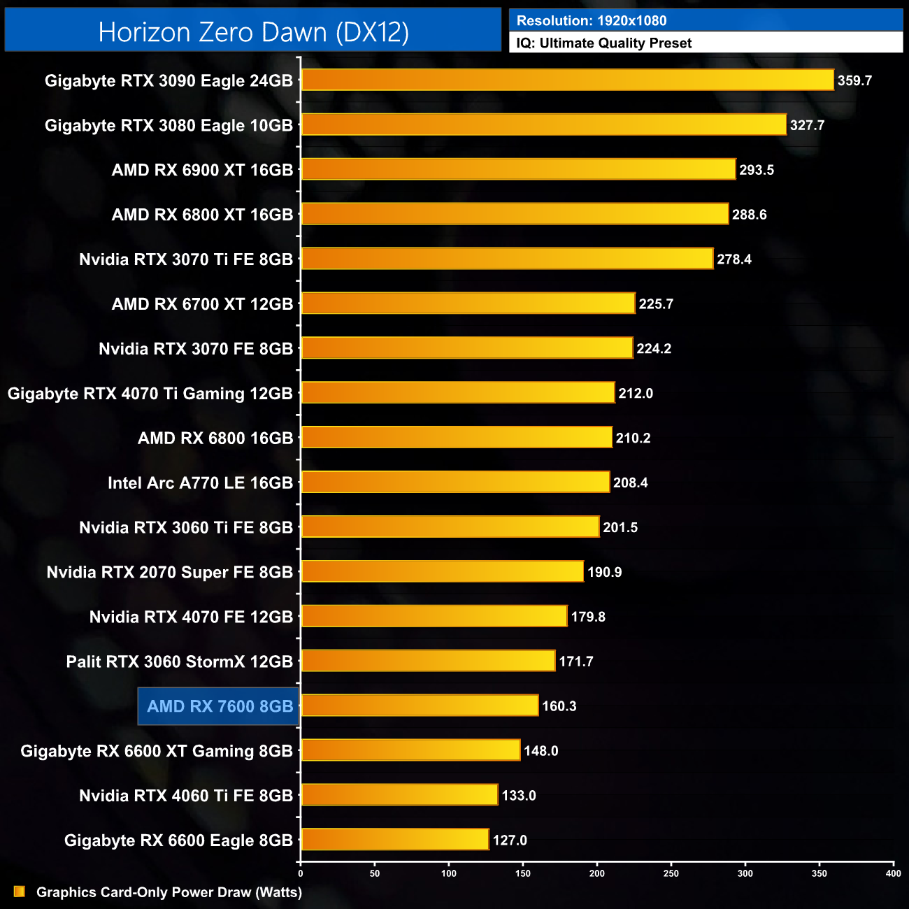 Total system power draw is similar to the RTX 4060 Ti at all resolutions, we see a peak reading of 352W at 1080p for the RX 7600. AMD officially recommends a 550W PSU, which does seem on the high side considering most users will likely pair this GPU with a mid-range CPU, and not a gas-guzzling i9-13900KS like we have here.