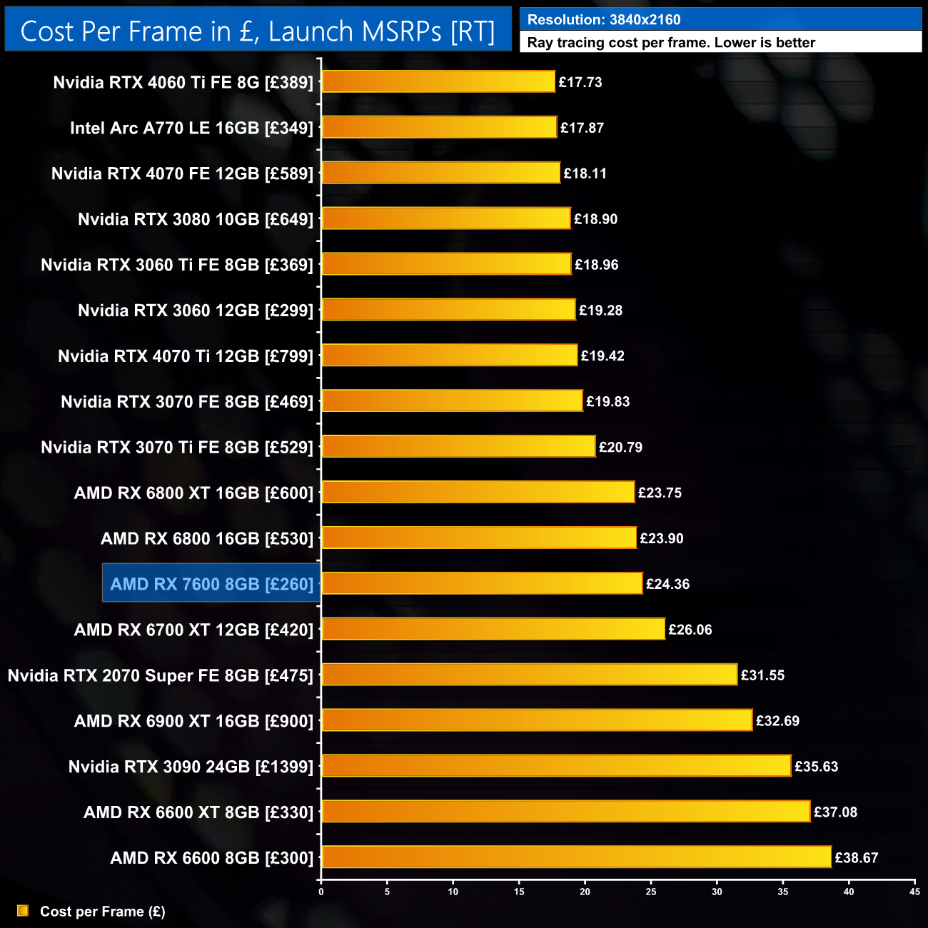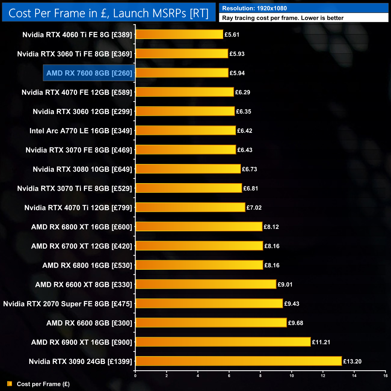 Even then, the £260 MSRP still helps the RX 7600 to offer reasonable value when looking at the ray tracing cost per frame, coming in level with the RTX 3060 Ti at 1080p – though it of course falls off at 1440p.