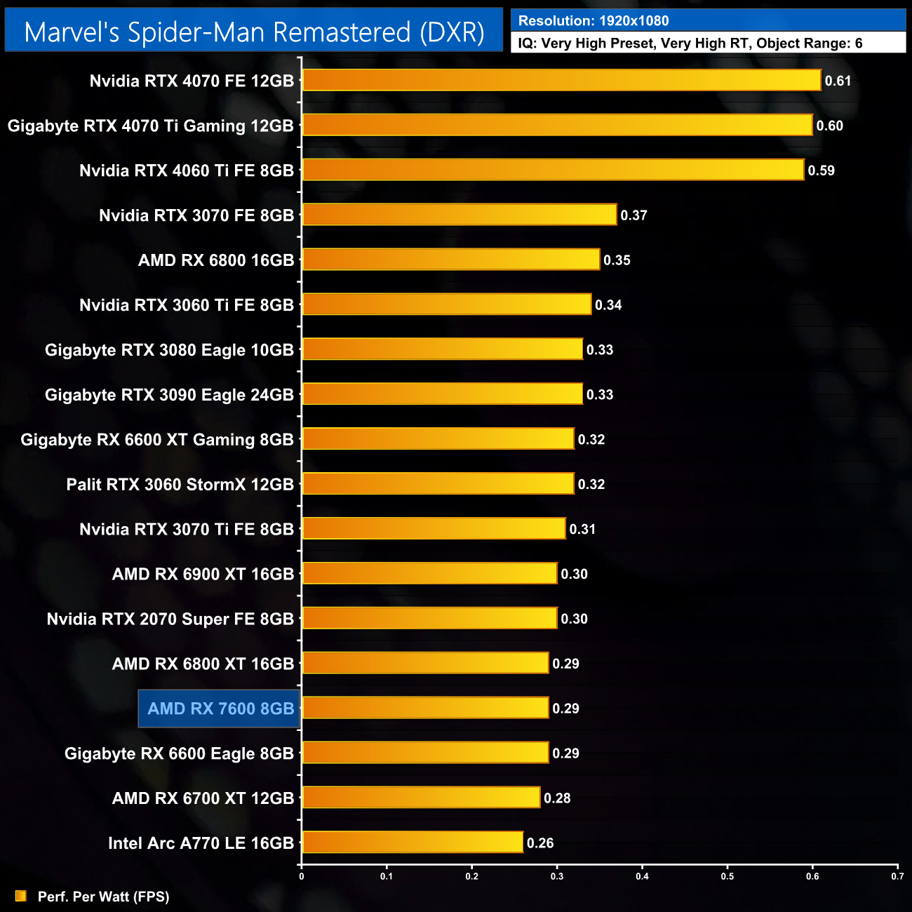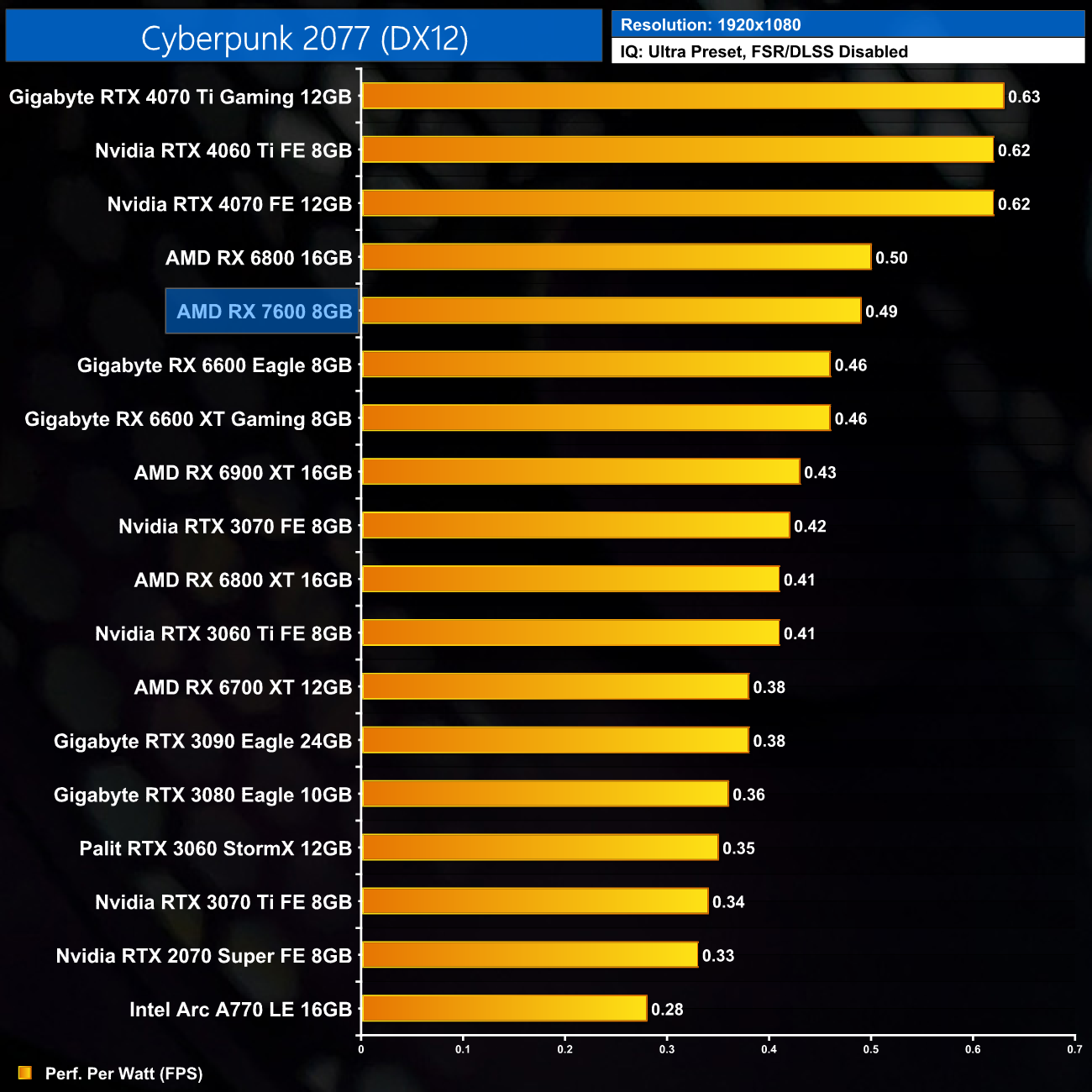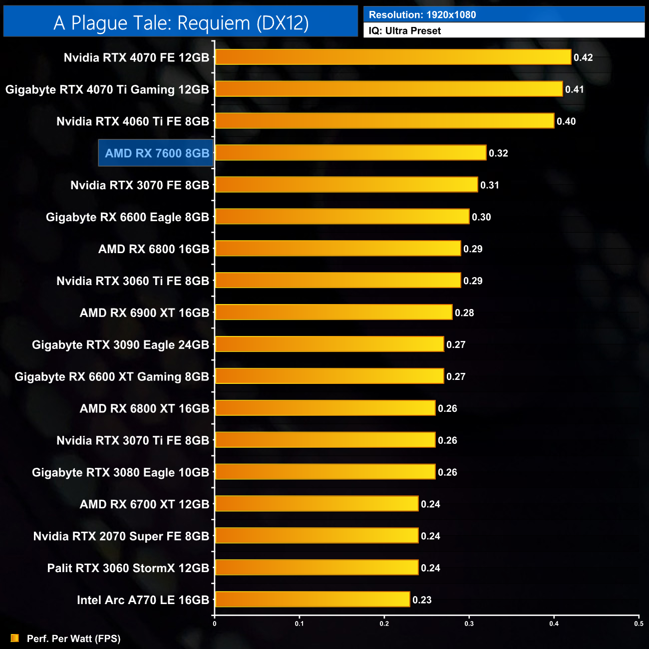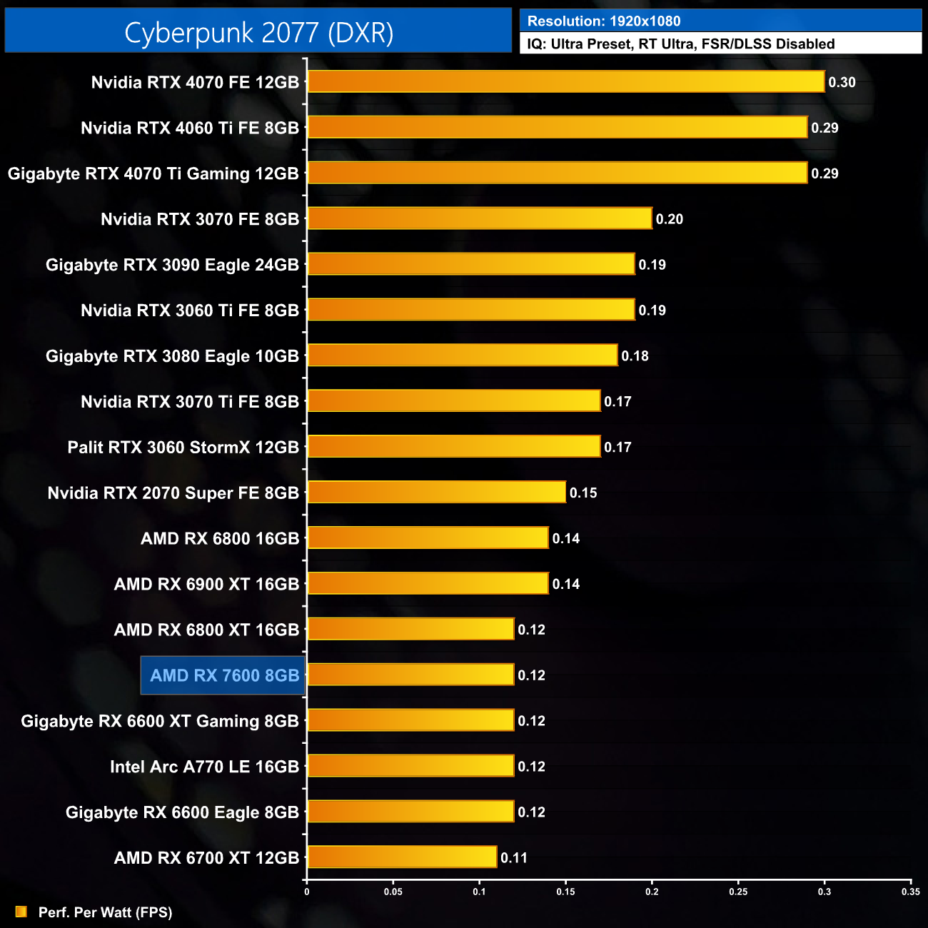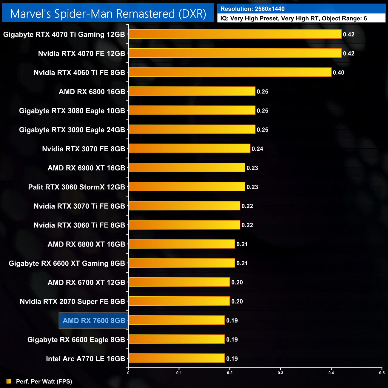 That's only exacerbated when looking at ray tracing efficiency where AMD is comparatively slower than Nvidia – the RX 7600 is now over 40% less efficient than the RTX 4060 Ti.