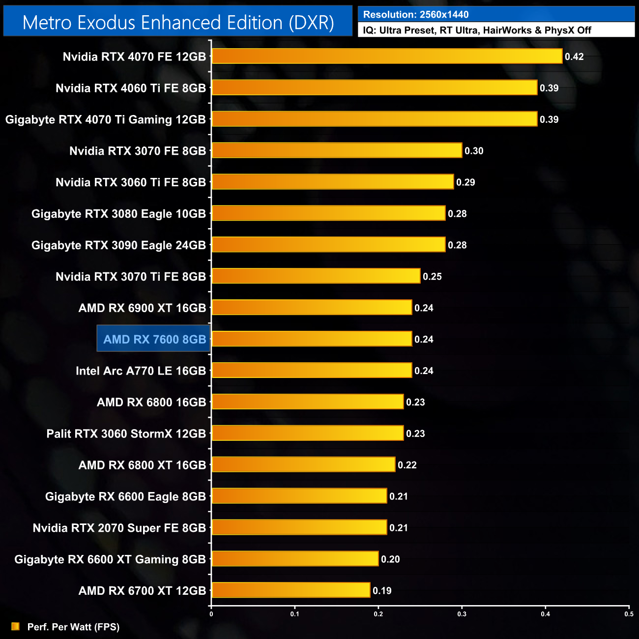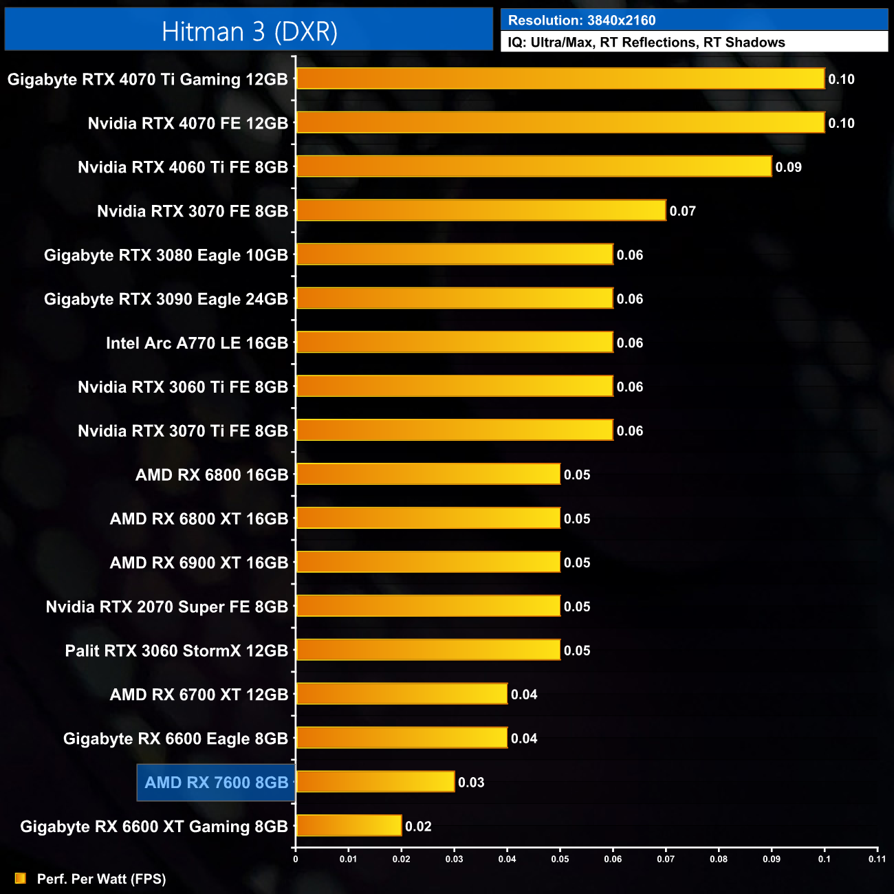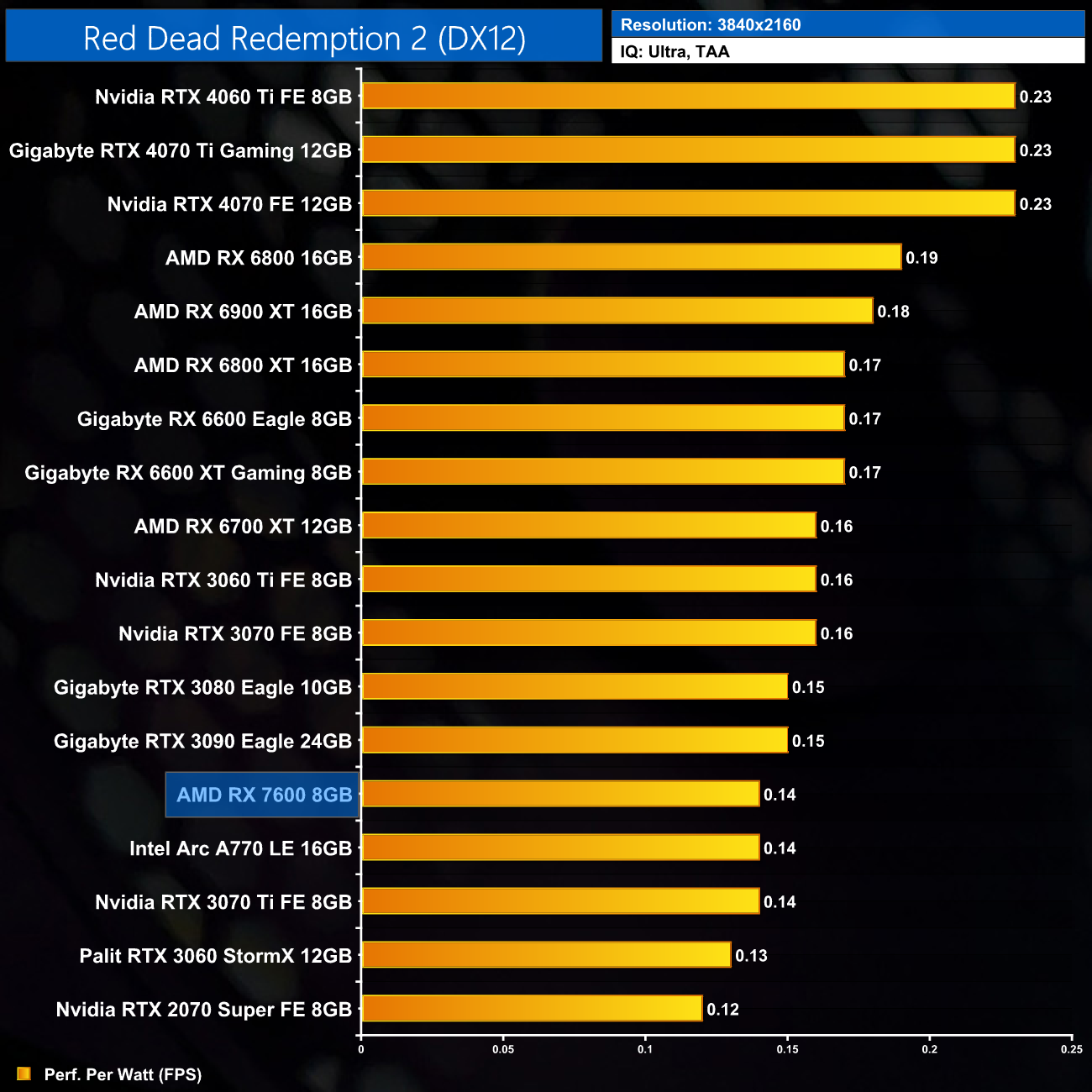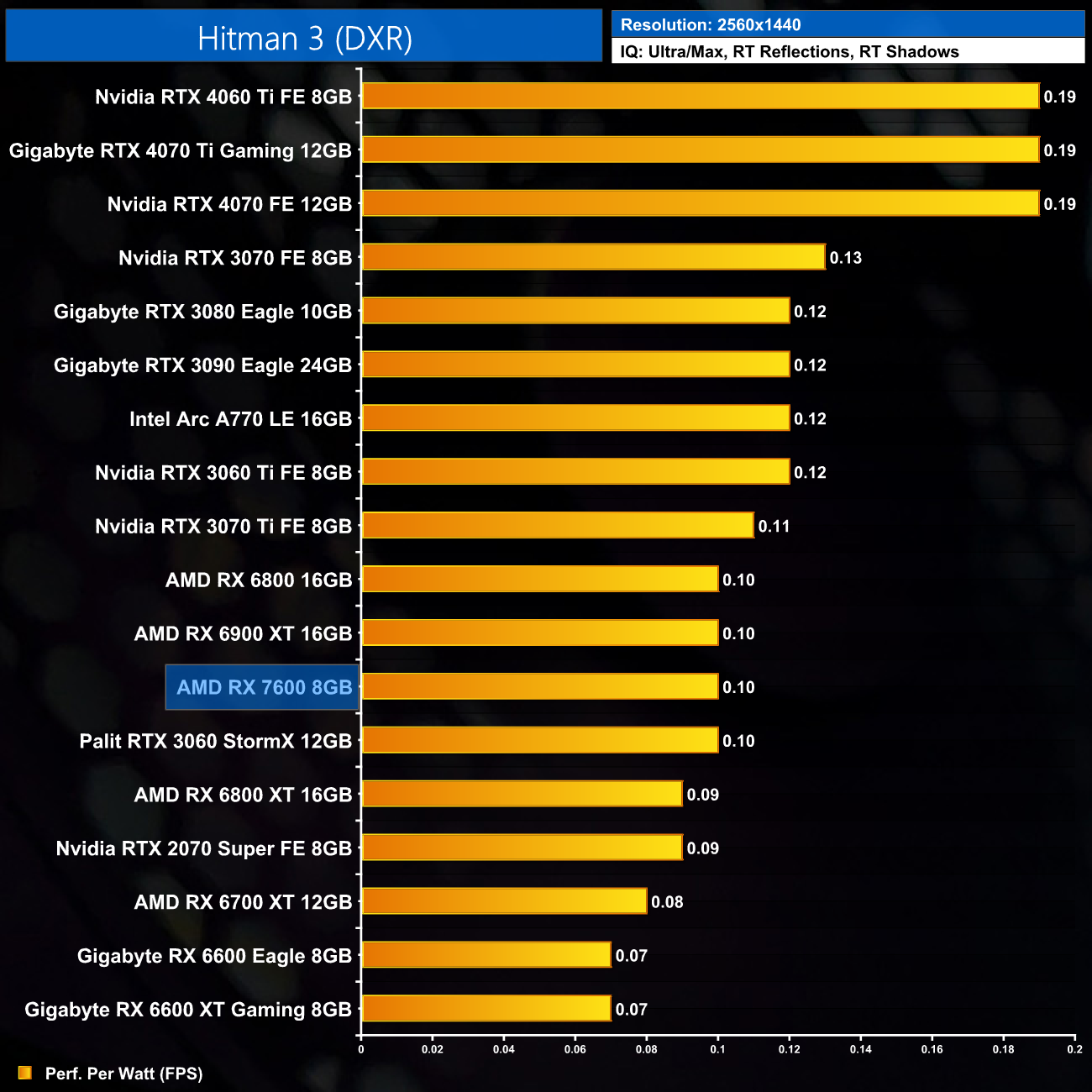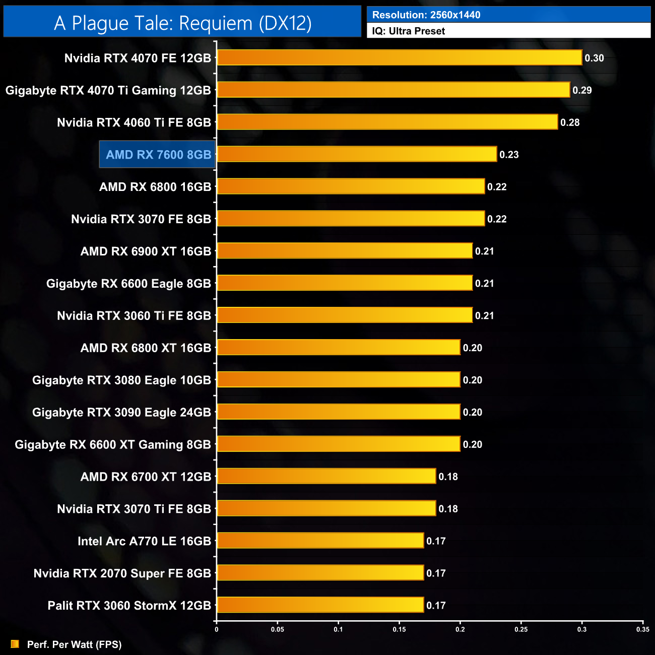 That's only exacerbated when looking at ray tracing efficiency where AMD is comparatively slower than Nvidia – the RX 7600 is now over 40% less efficient than the RTX 4060 Ti.