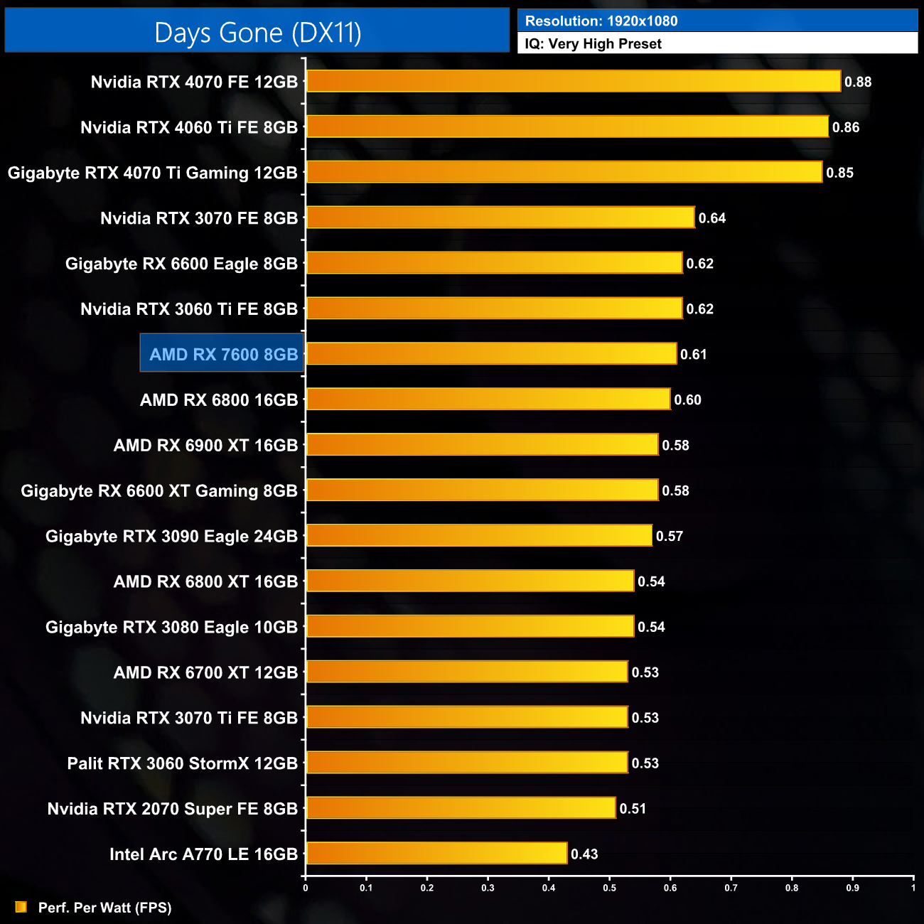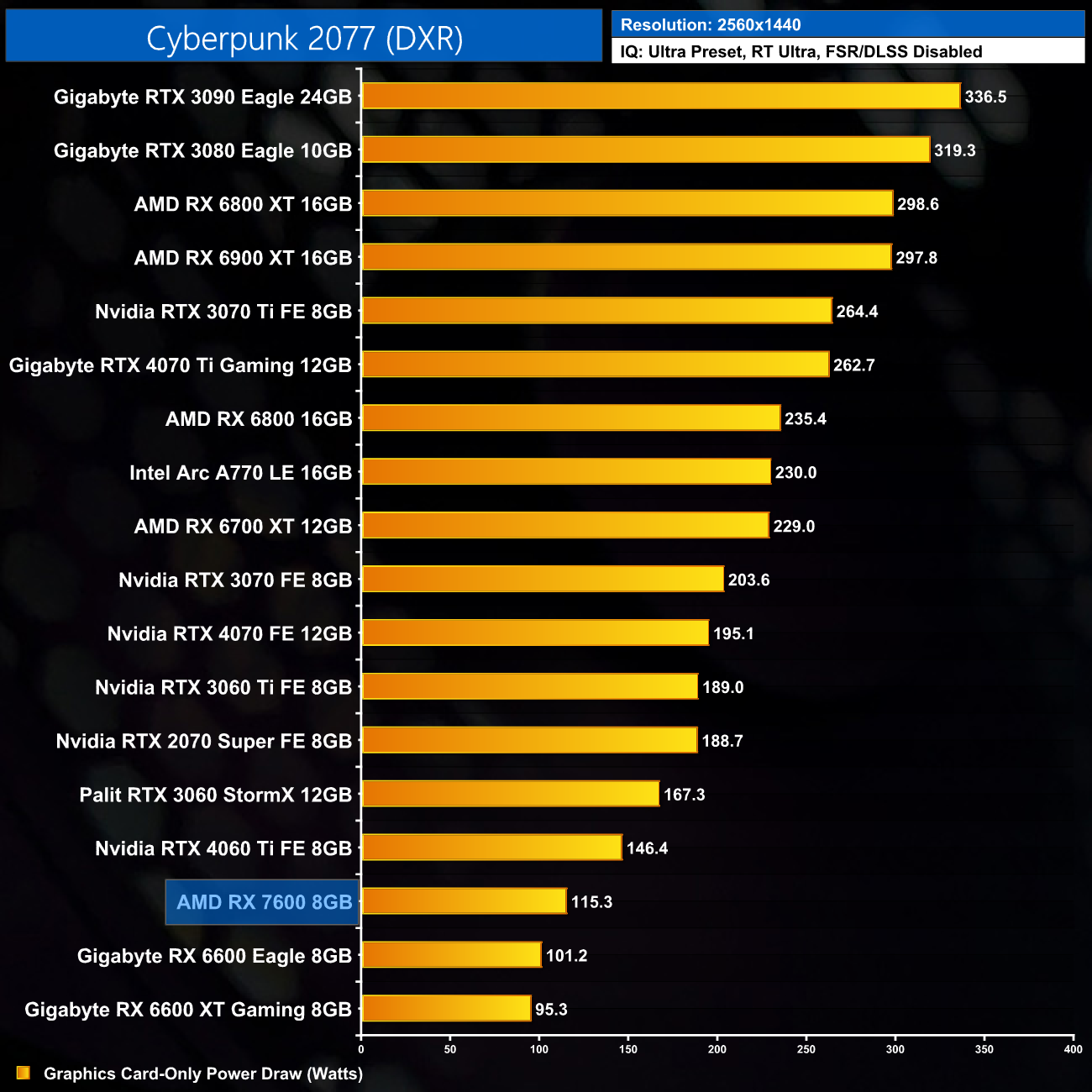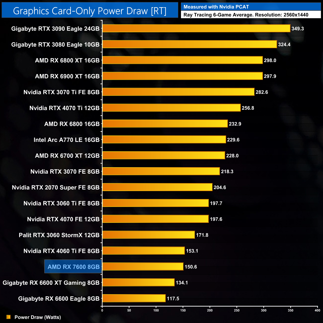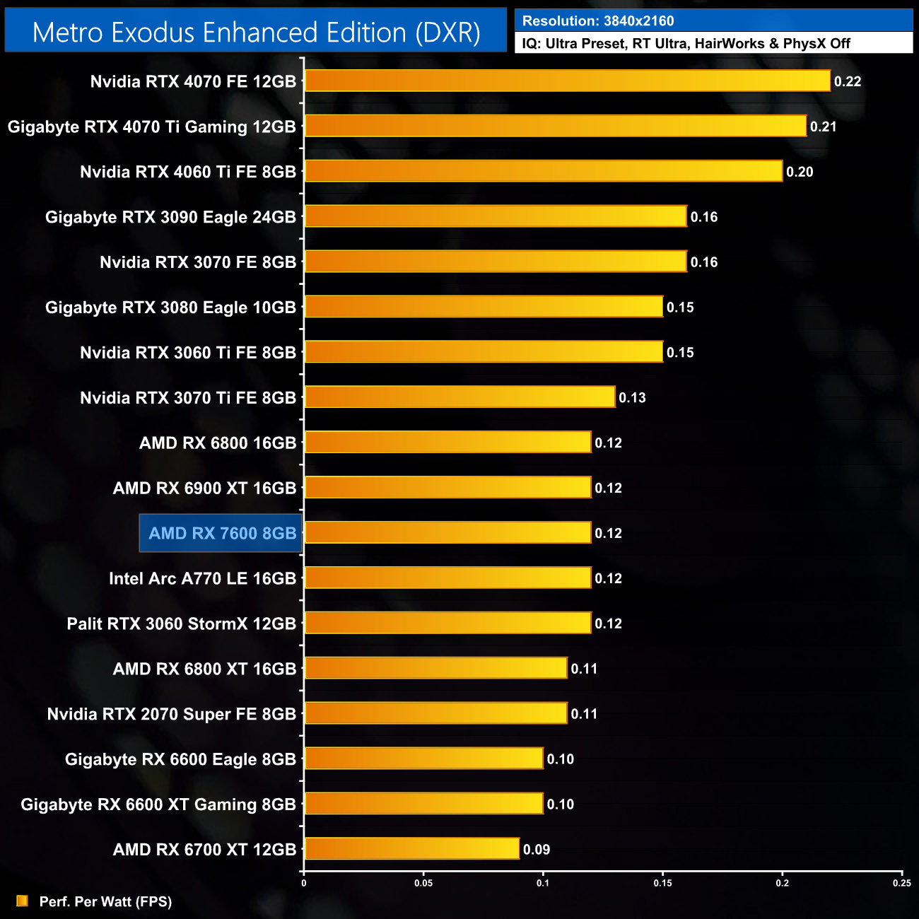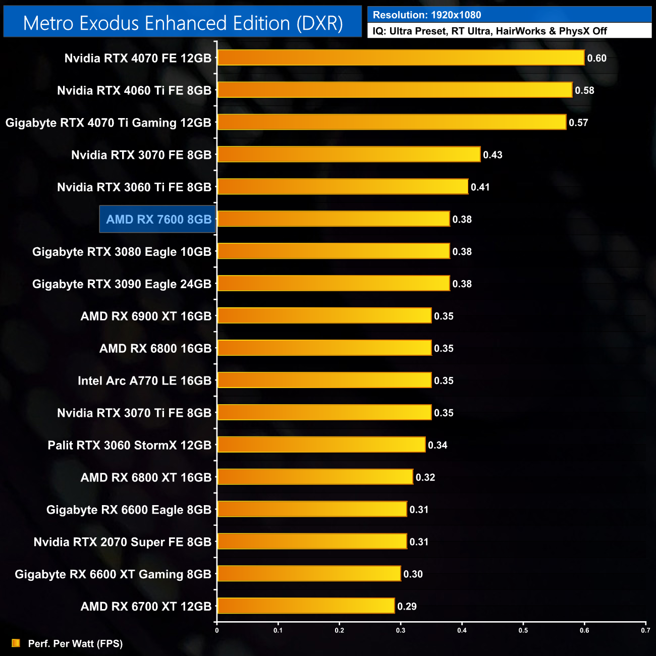 That's only exacerbated when looking at ray tracing efficiency where AMD is comparatively slower than Nvidia – the RX 7600 is now over 40% less efficient than the RTX 4060 Ti.