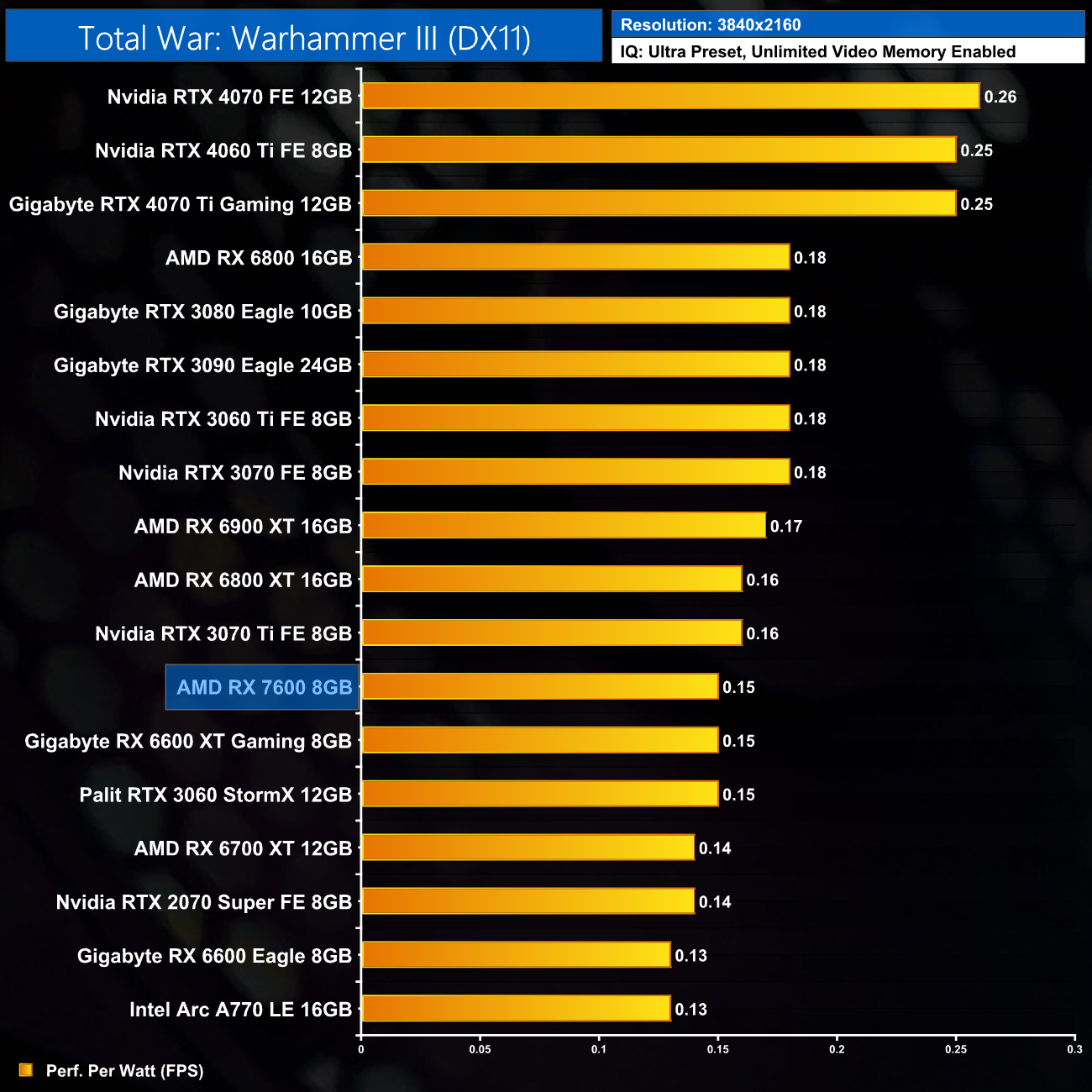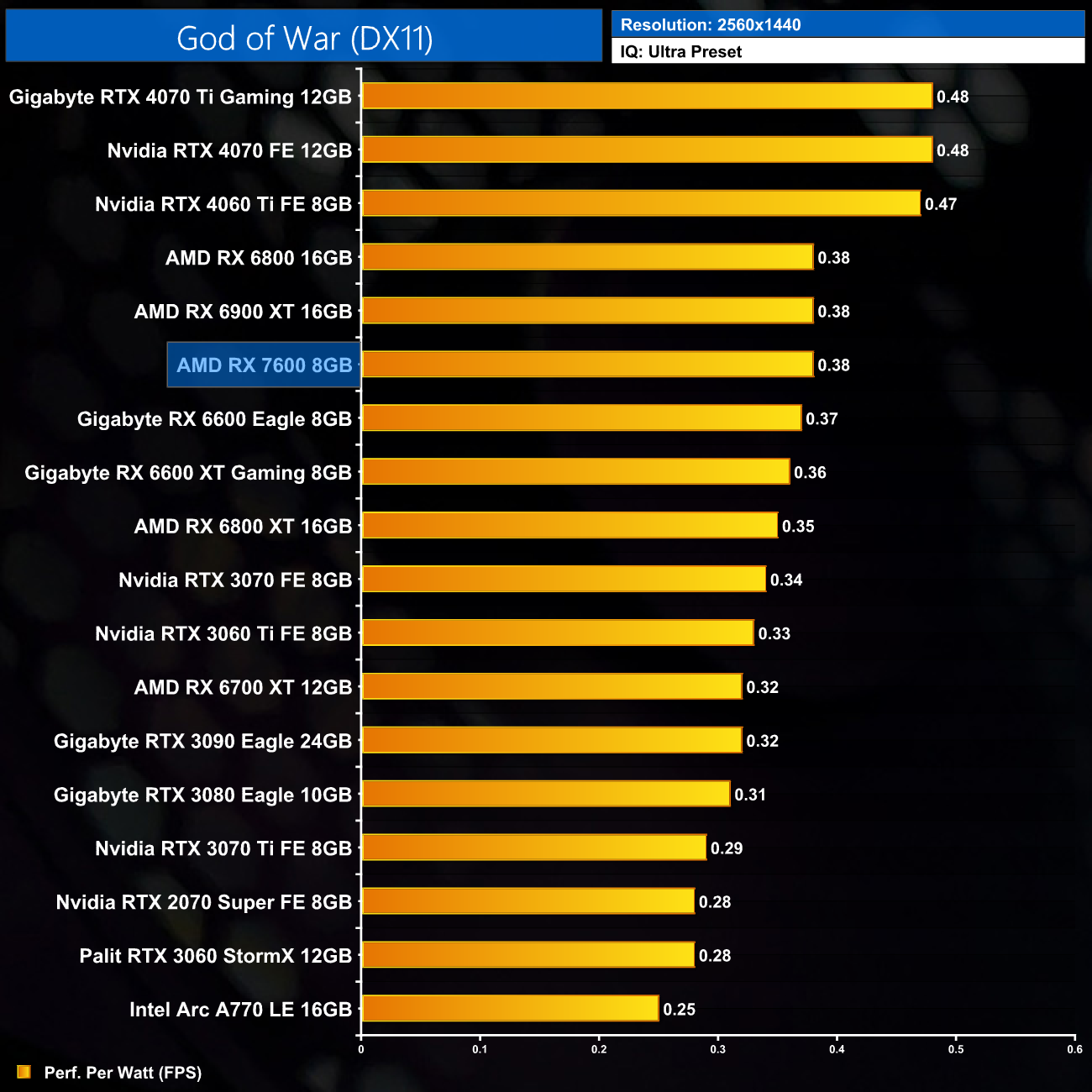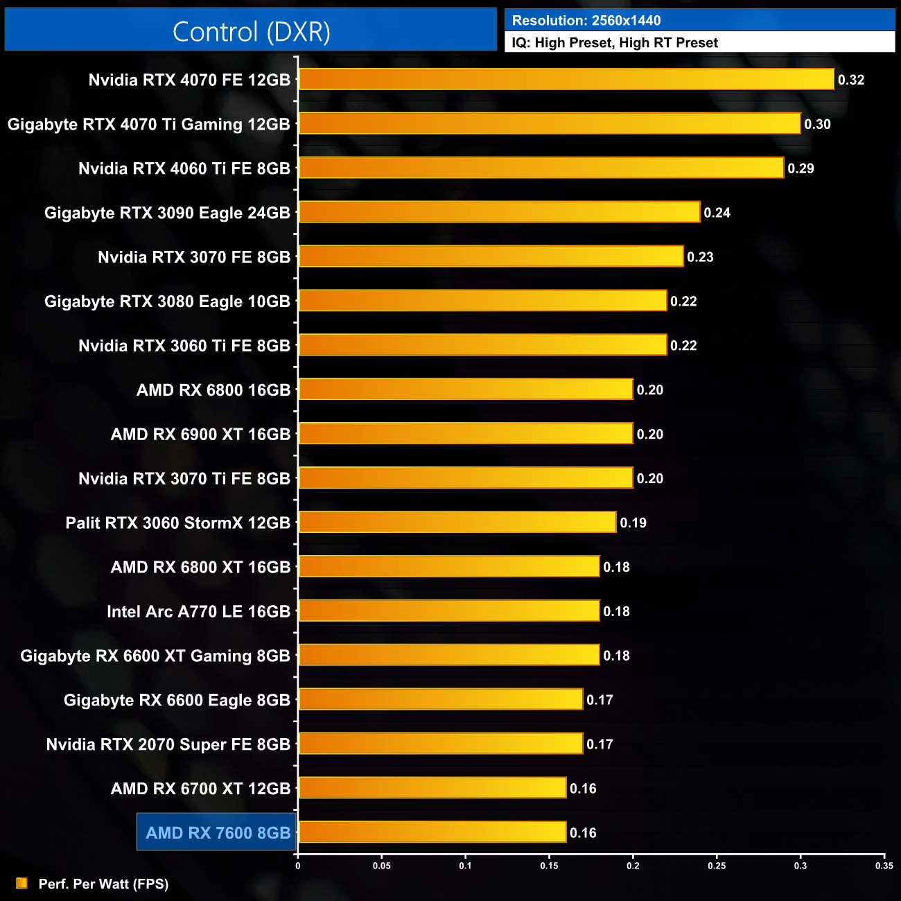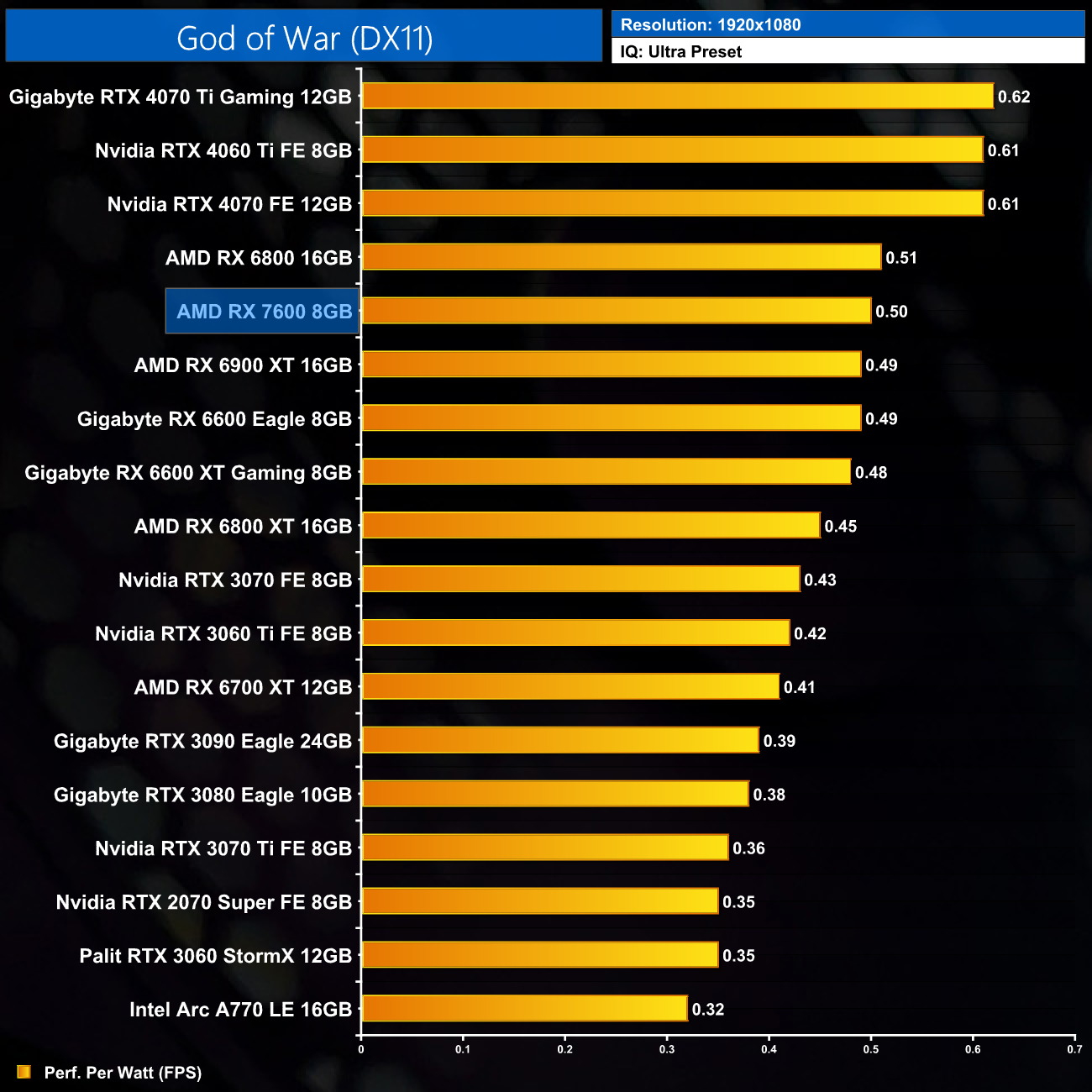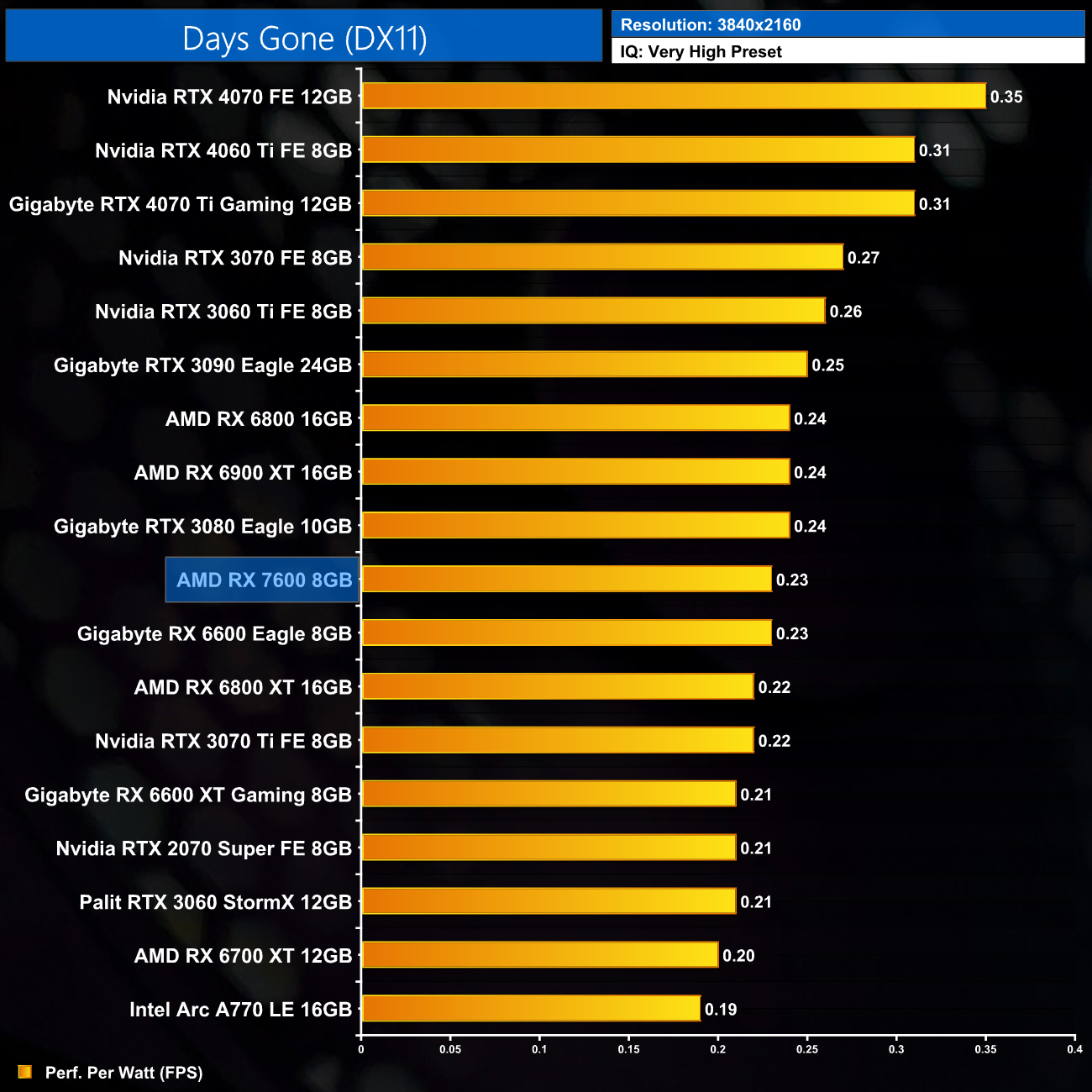 That's only exacerbated when looking at ray tracing efficiency where AMD is comparatively slower than Nvidia – the RX 7600 is now over 40% less efficient than the RTX 4060 Ti.