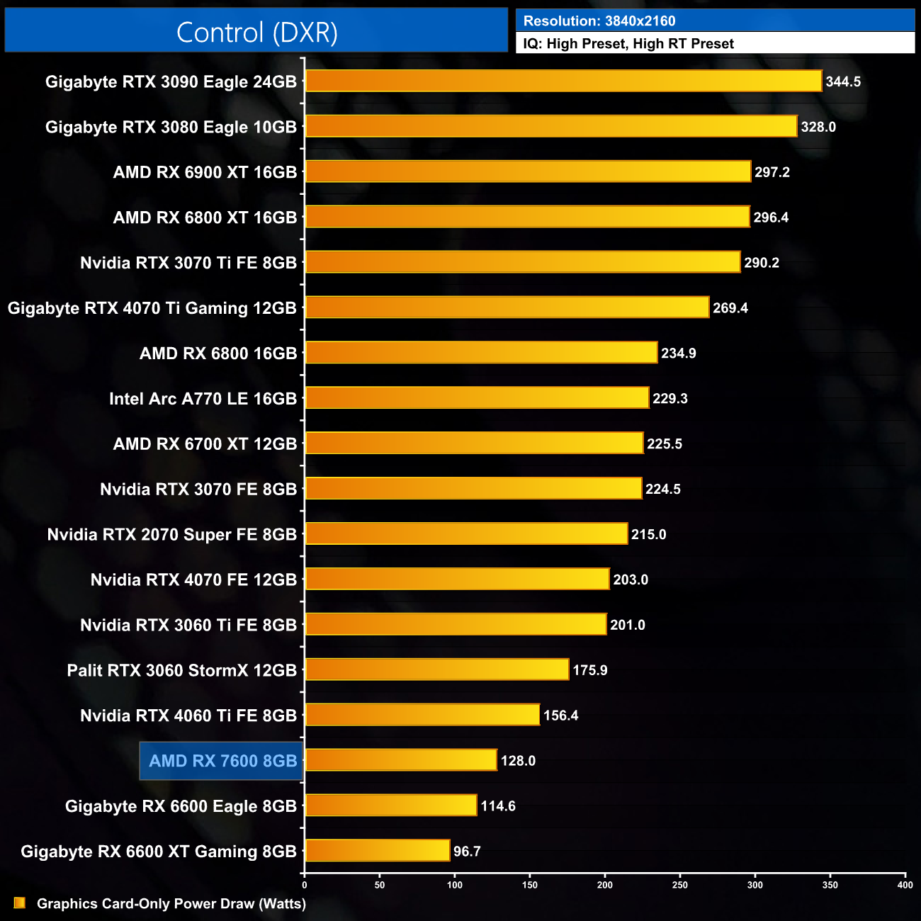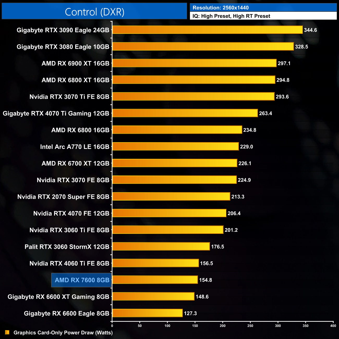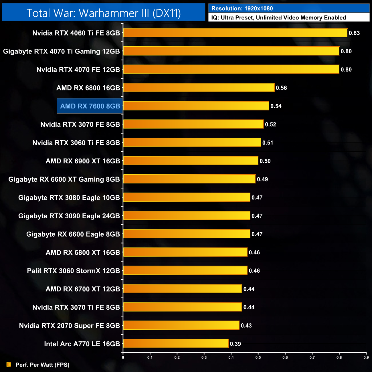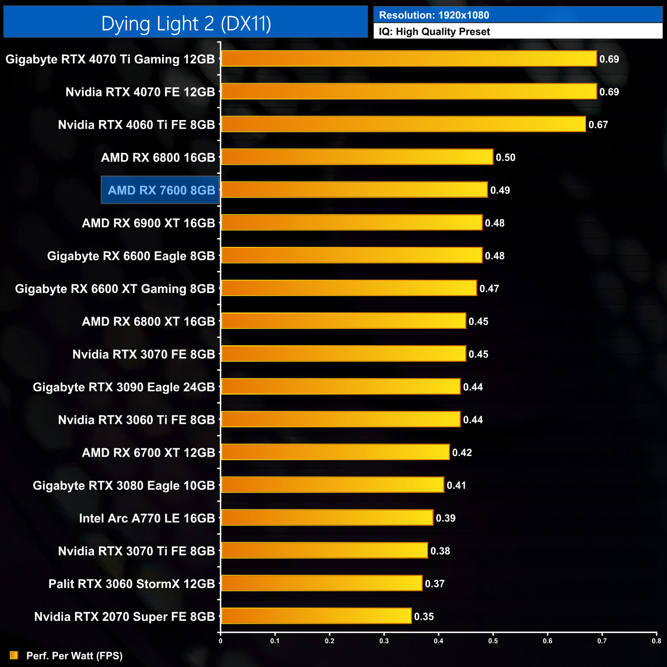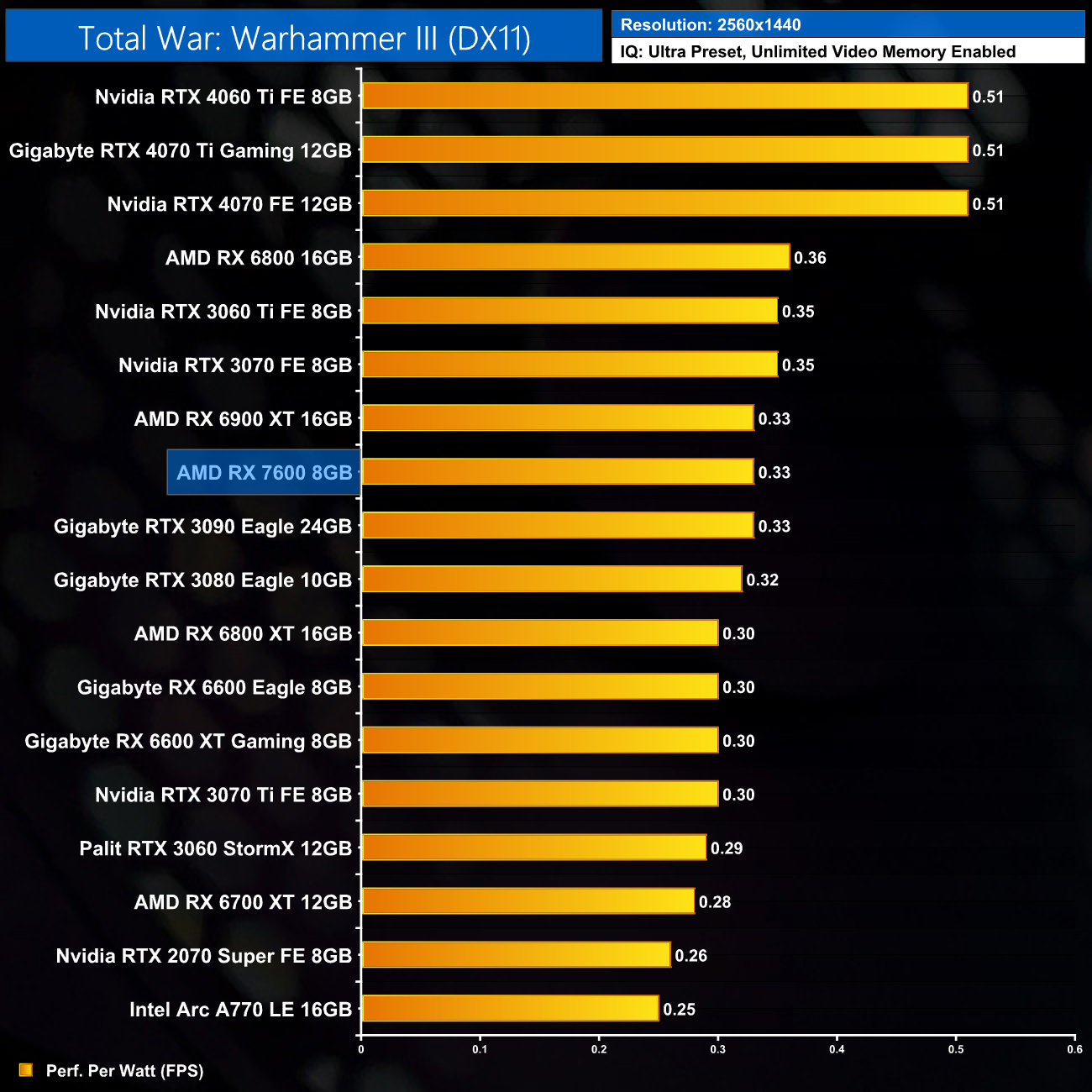 That's only exacerbated when looking at ray tracing efficiency where AMD is comparatively slower than Nvidia – the RX 7600 is now over 40% less efficient than the RTX 4060 Ti.