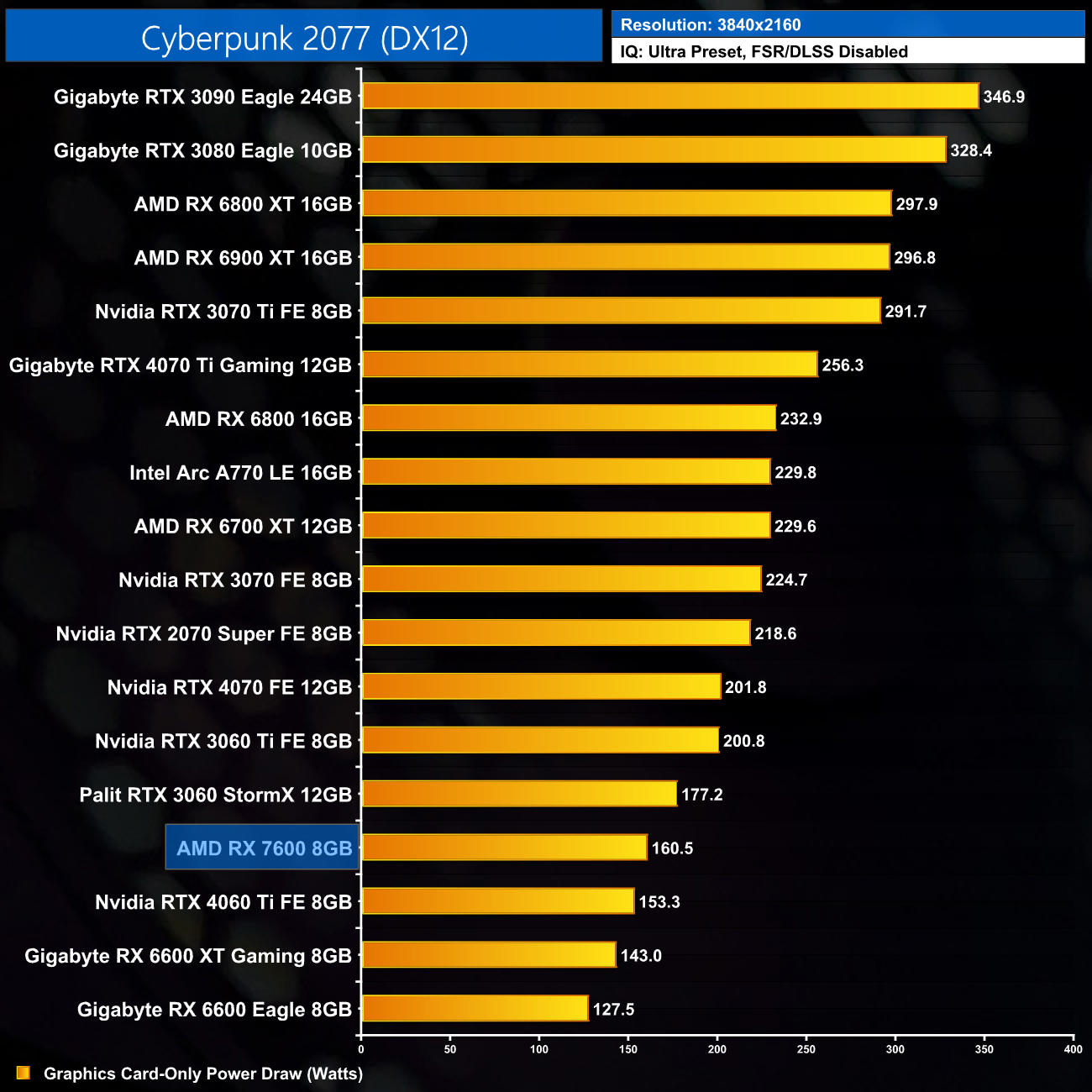 It's fascinating to see the efficiency levels here don't move the needle forward from an AMD perspective. We commented that 160W power draw, while still low, is a fair bit higher than what was offered by the RX 6600, and that results in an efficiency gain of just 4% for the RDNA 3 GPU. It's not even more efficient than the RX 6800, and clearly is no match for the RTX 4060 Ti, delivering 28% lower performance per Watt.