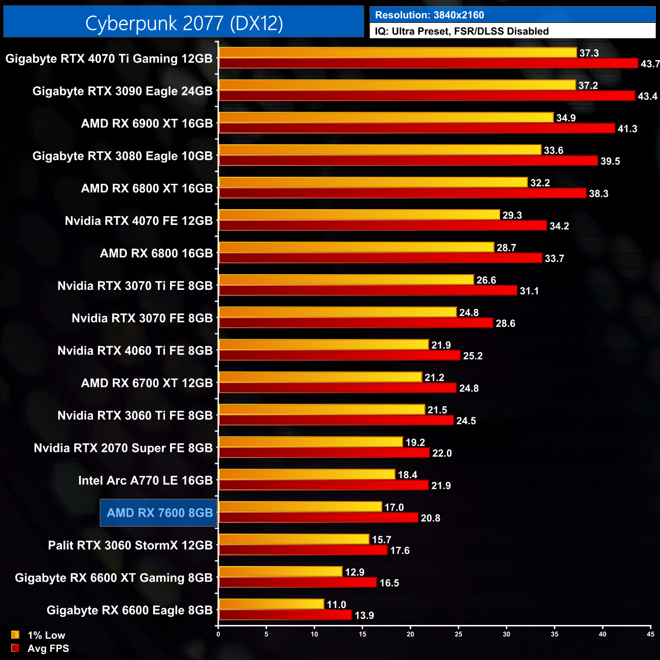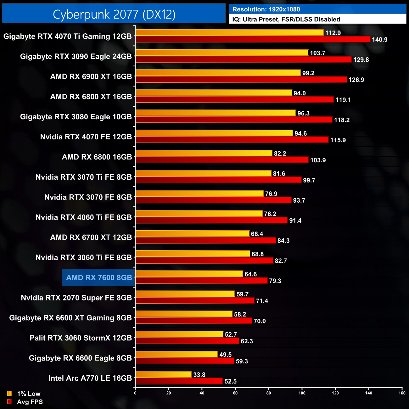 The same can be said for Cyberpunk 2077. At 1080p, Ultra ray tracing settings, the RX 7600 can't manage a playable frame rate – not even the RX 6700 XT can, with the RTX 3060 faster than both of those AMD GPUs.