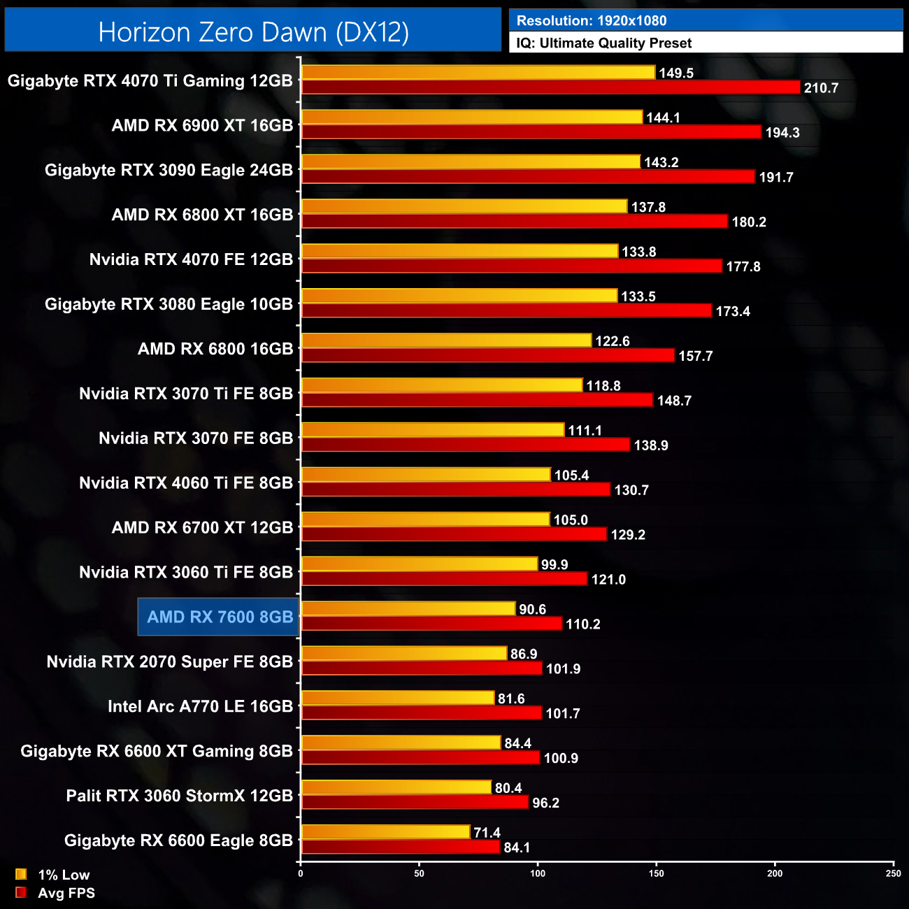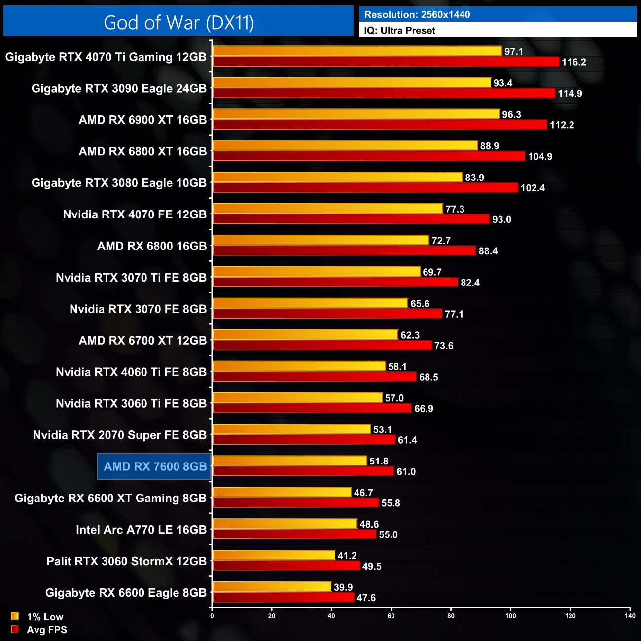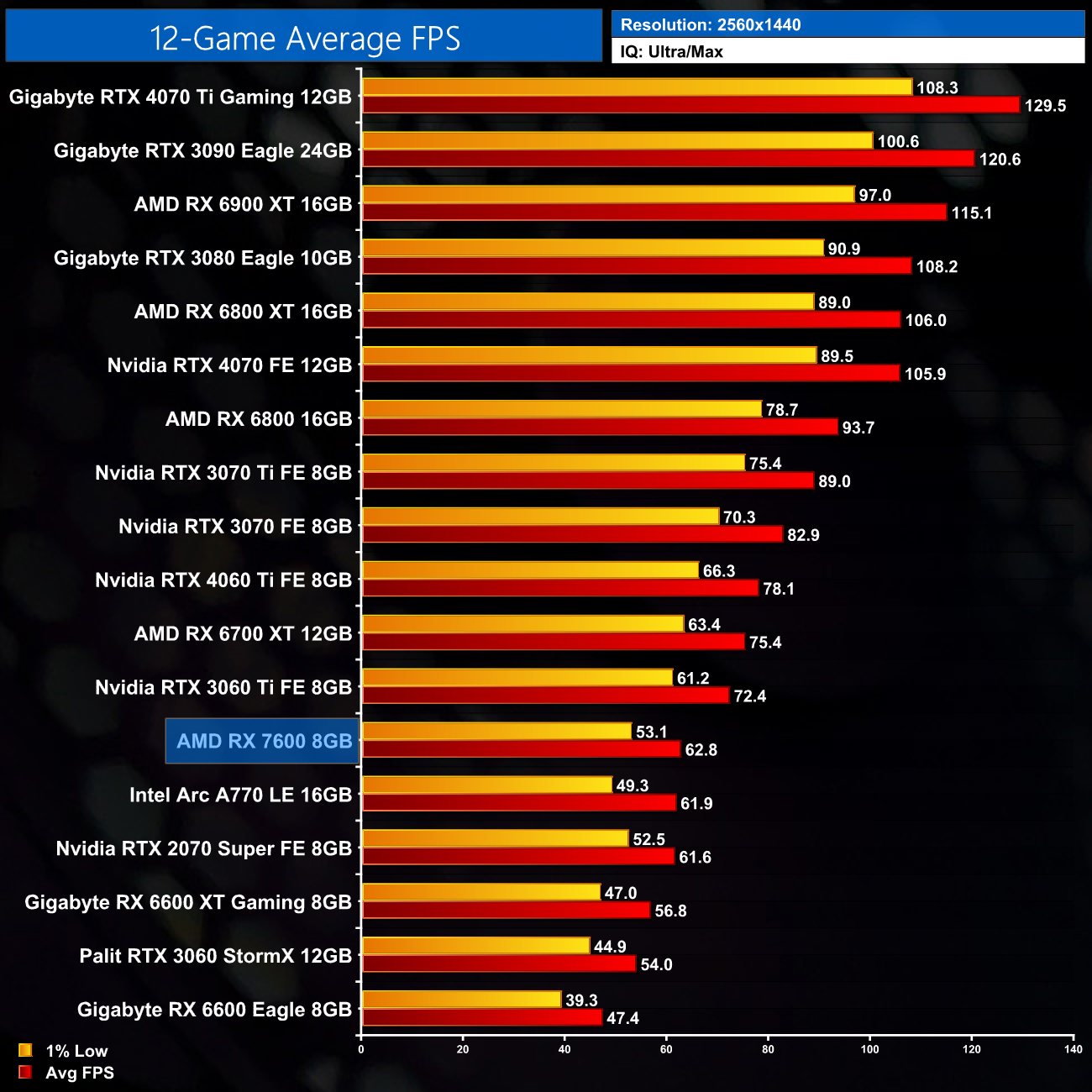 1440p still sees the 7600 deliver over 115FPS, where it's a hair faster than the A770. Gains come in at 10% versus the RX 6600 XT.