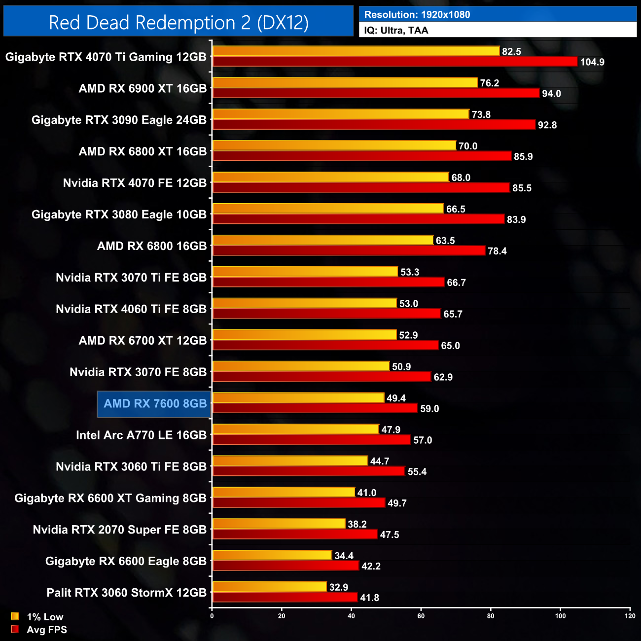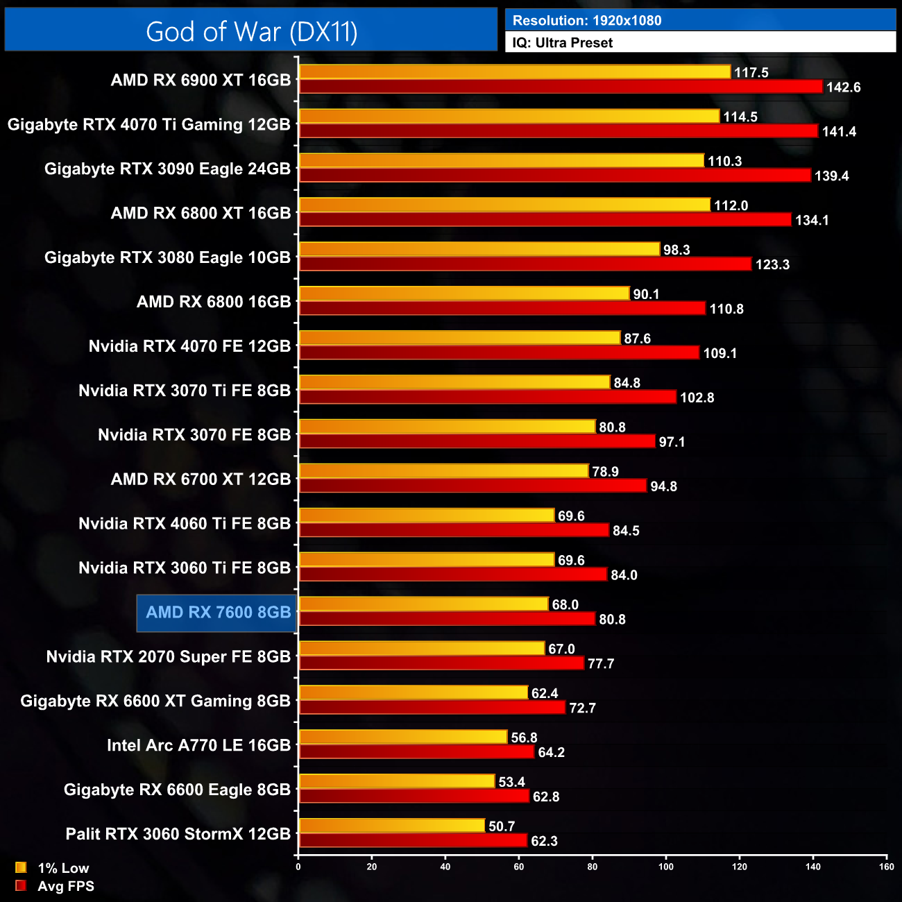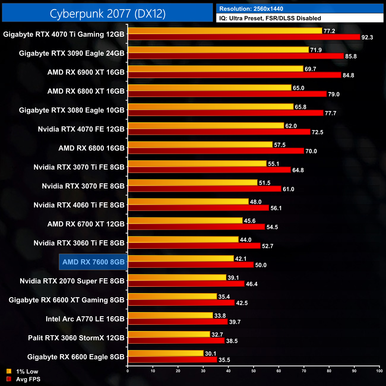 1440p still sees the 7600 deliver over 115FPS, where it's a hair faster than the A770. Gains come in at 10% versus the RX 6600 XT.
