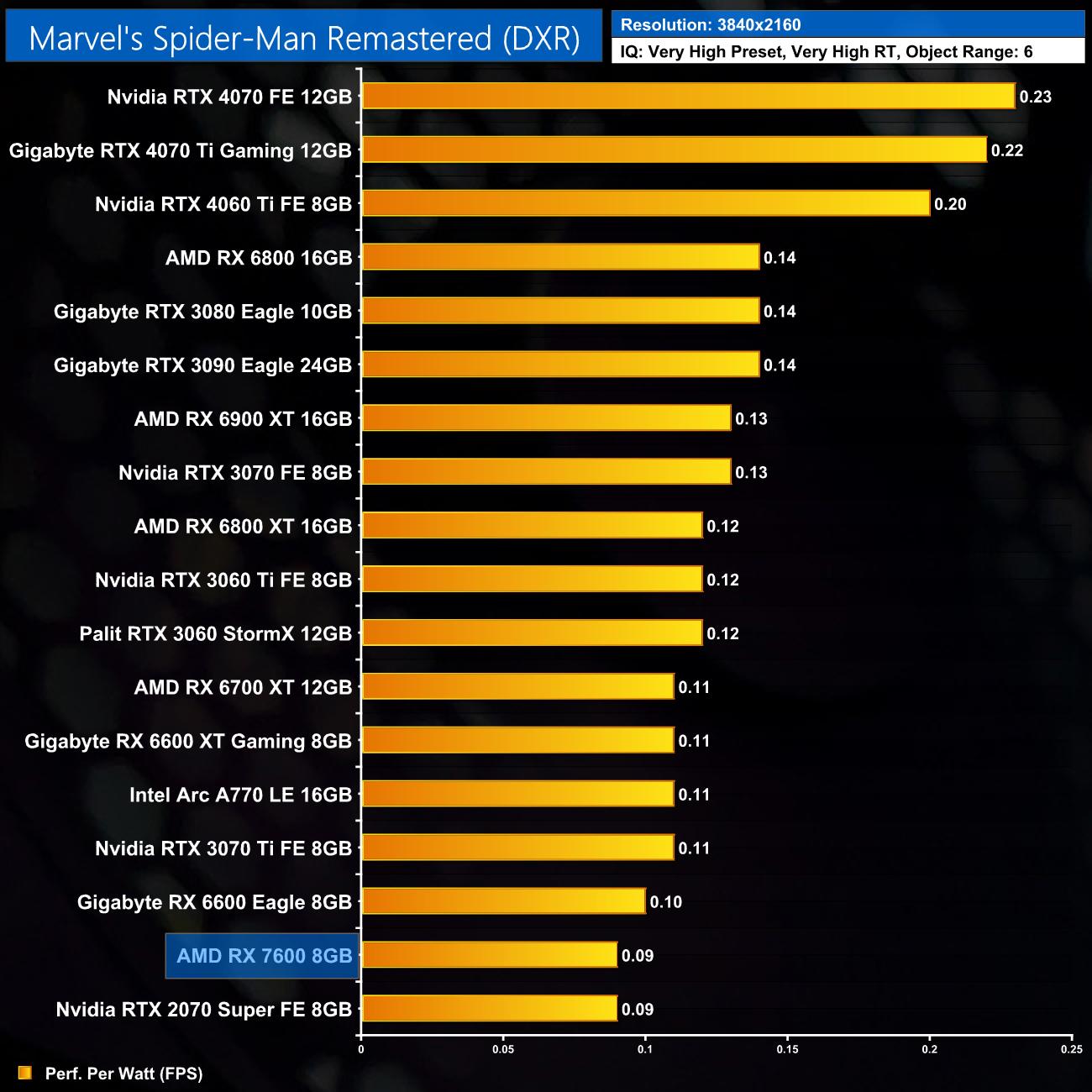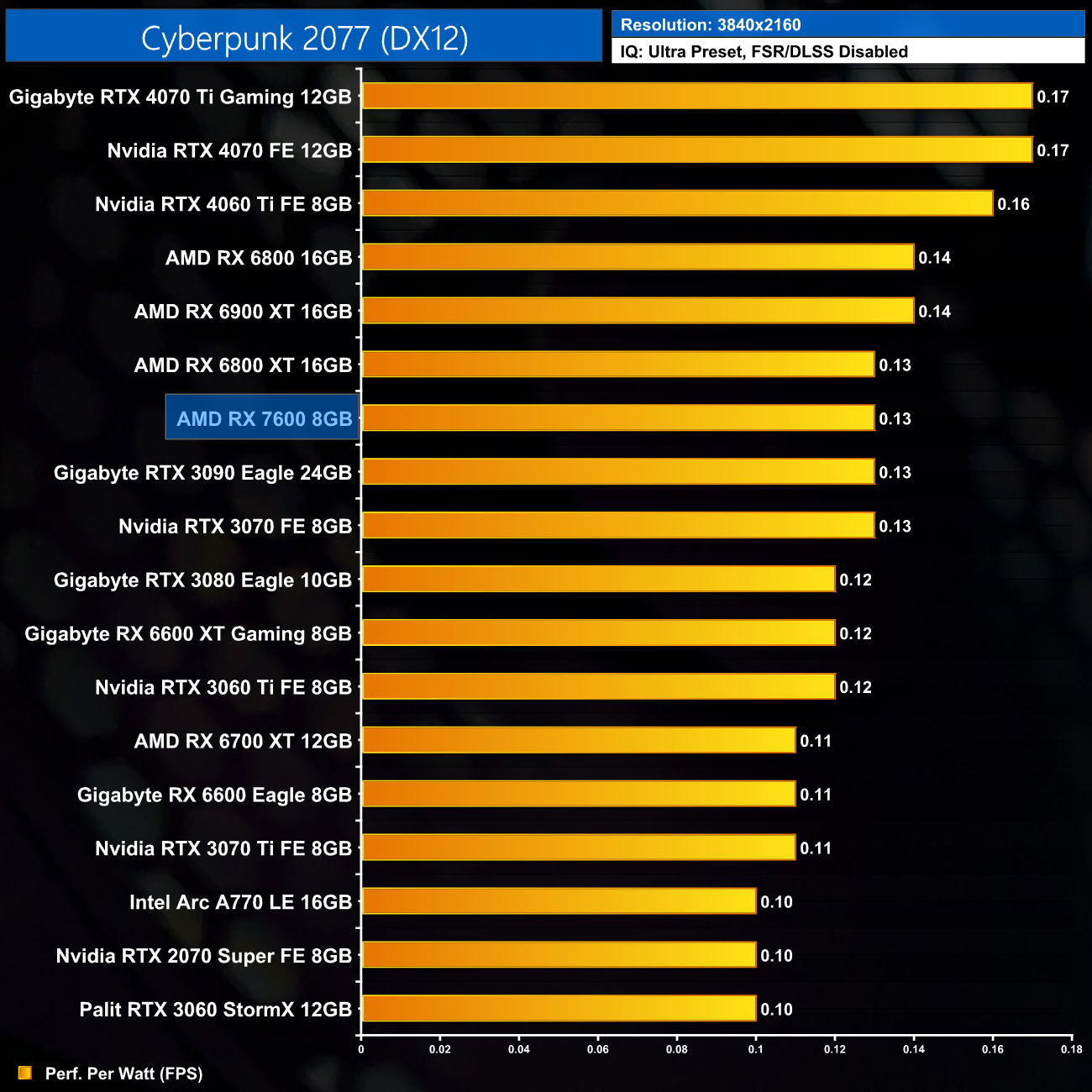 The same applies for the ray tracing efficiency, with the 7600 rooted to the bottom of the chart, alongside three other AMD RDNA 2 parts.
