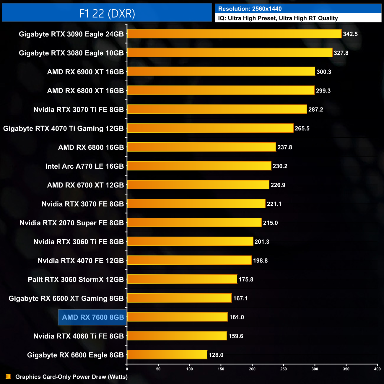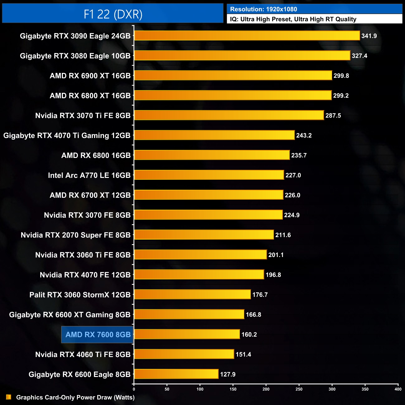 F1 22 is slightly less demanding however, with the RX 7600 capable of a 60FPS average frame rate with every ray tracing setting enabled, which is on par with the Intel A770 and a 13% improvement over the 6600 XT.