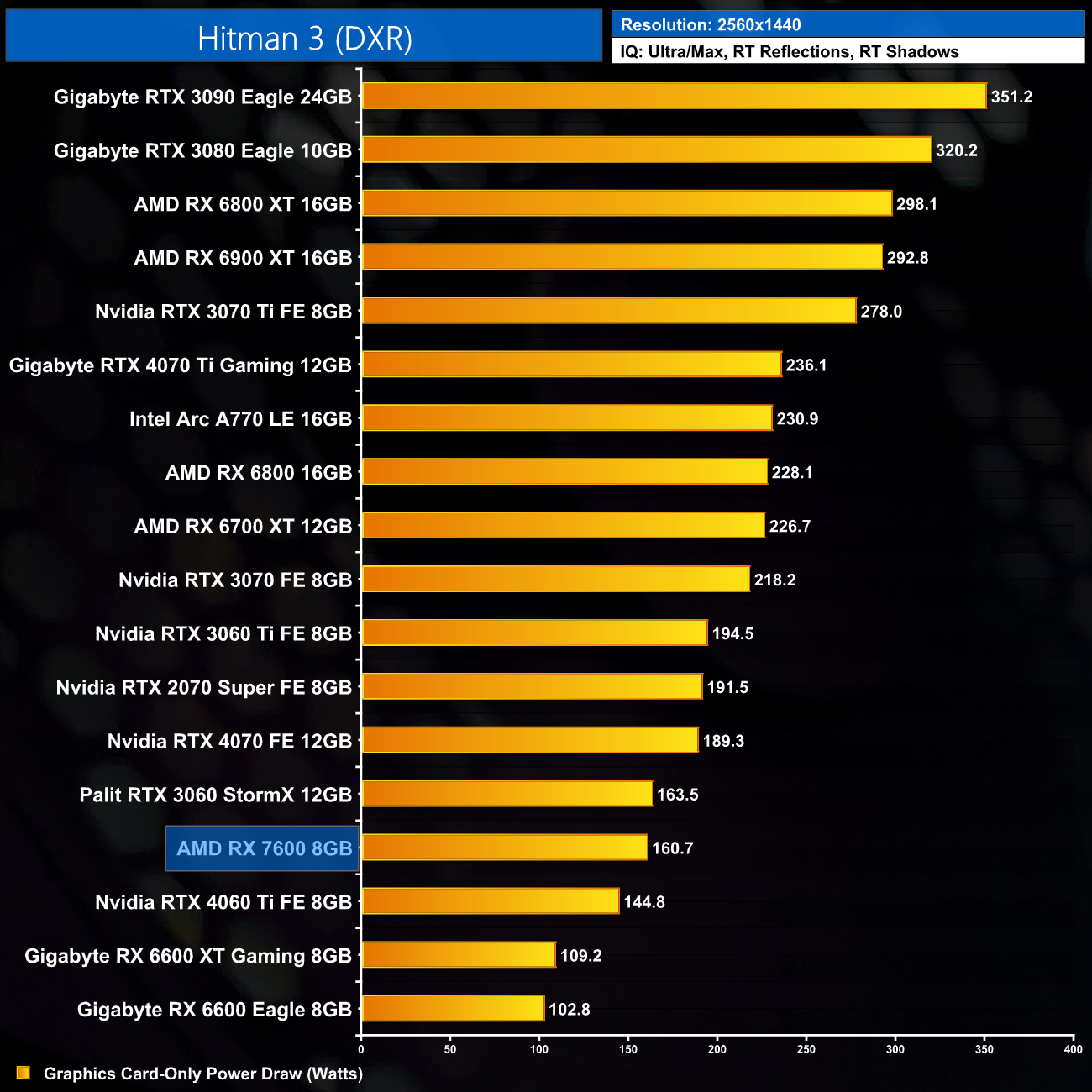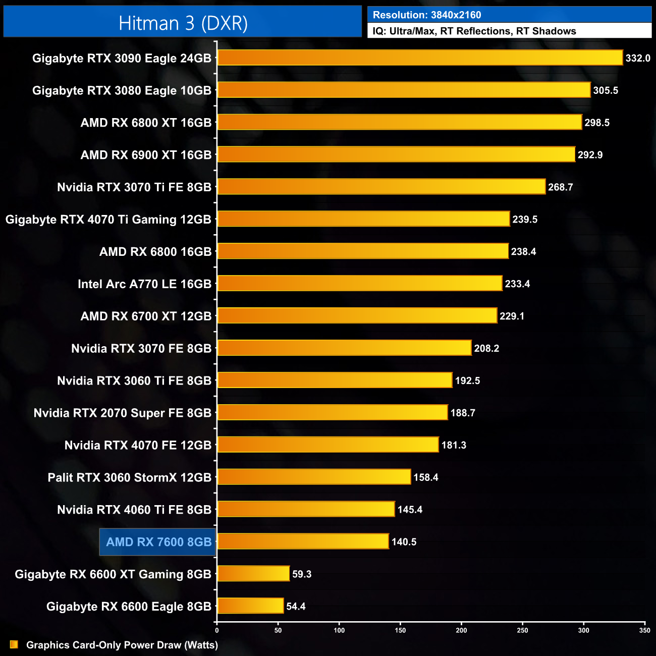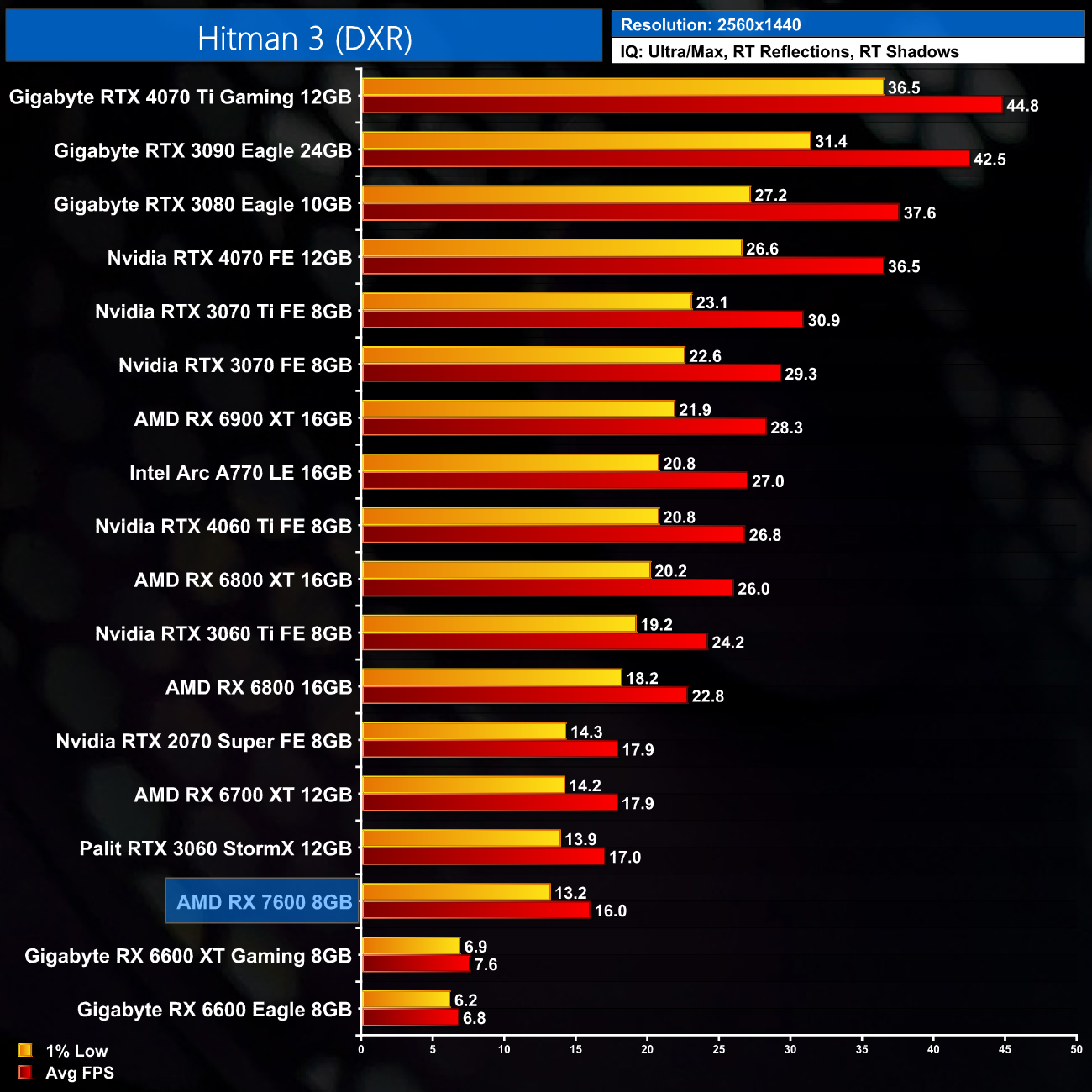 Hitman 3 is another example of a game that's just too heavy for the RX 7600 using maximum ray tracing settings. It falters to just 25FPS on average, so you'd definitely want to reduce some settings or enable FSR here.