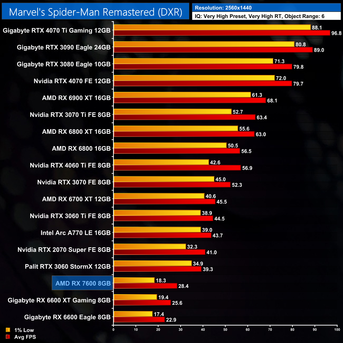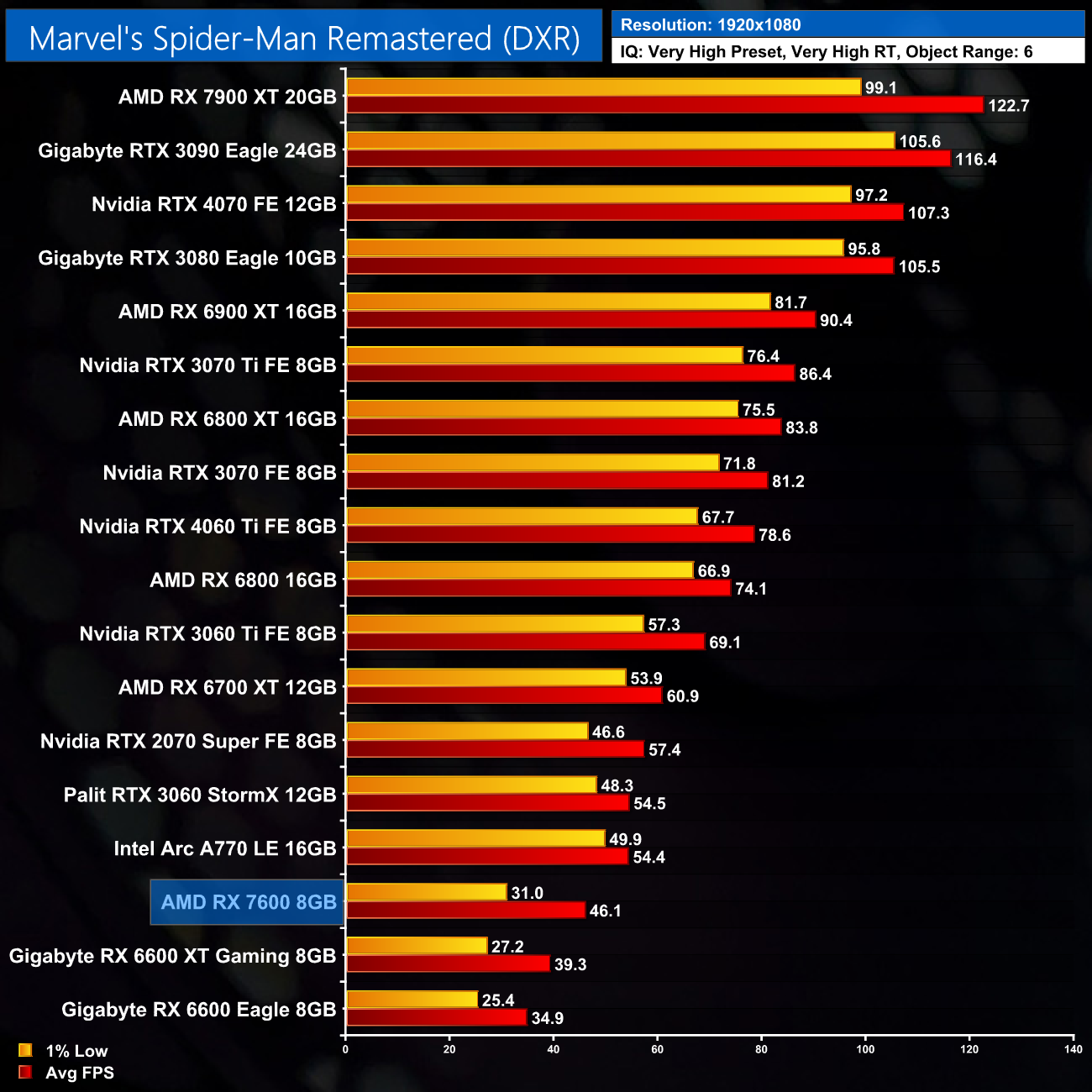 Spider-Man Remastered is usually pretty amenable to AMD GPUs when enabling ray tracing, but the RX 7600 still struggles and is comprehensively out-muscled by the last-gen RTX 3060, with noticeably choppier 1% lows than that Nvidia GPU.