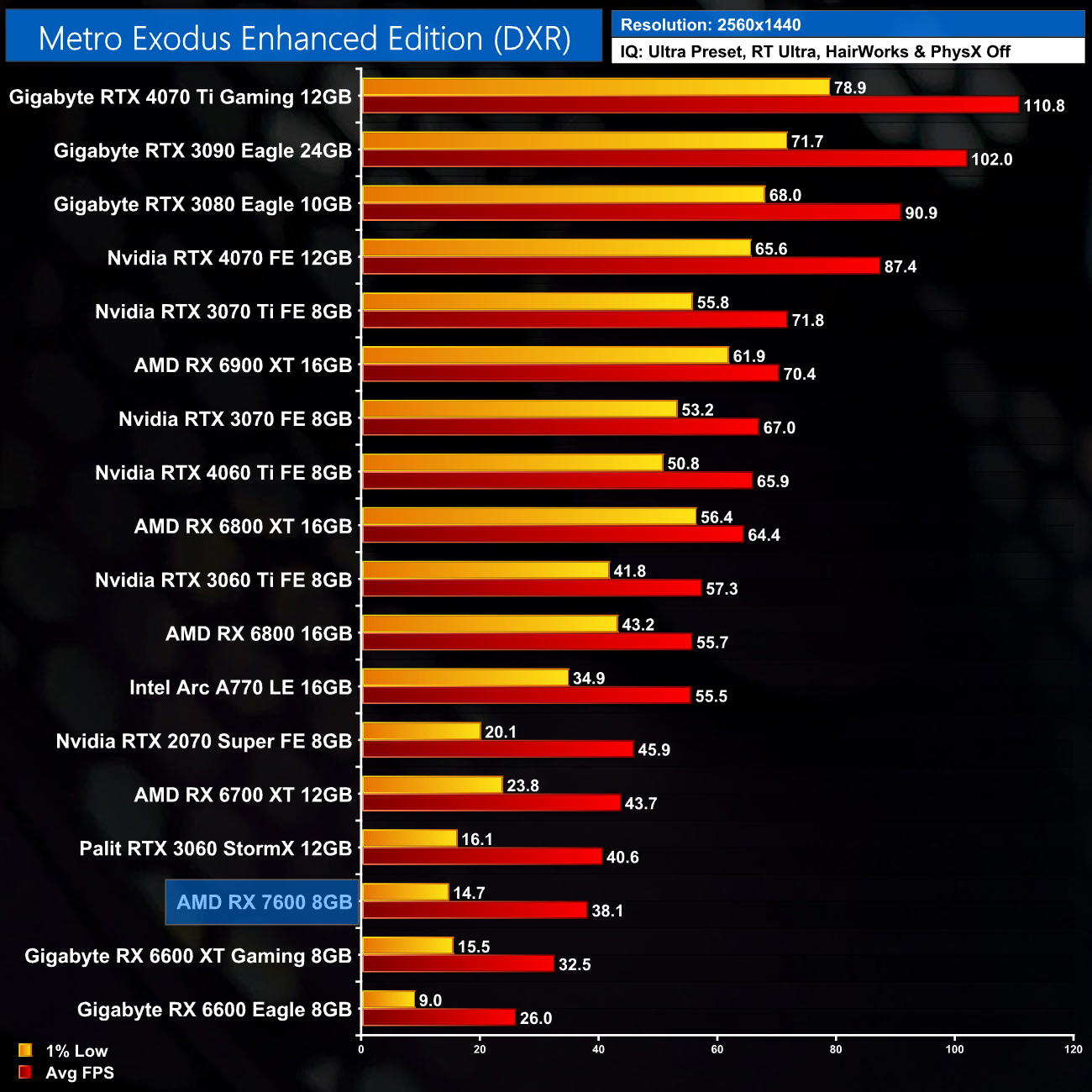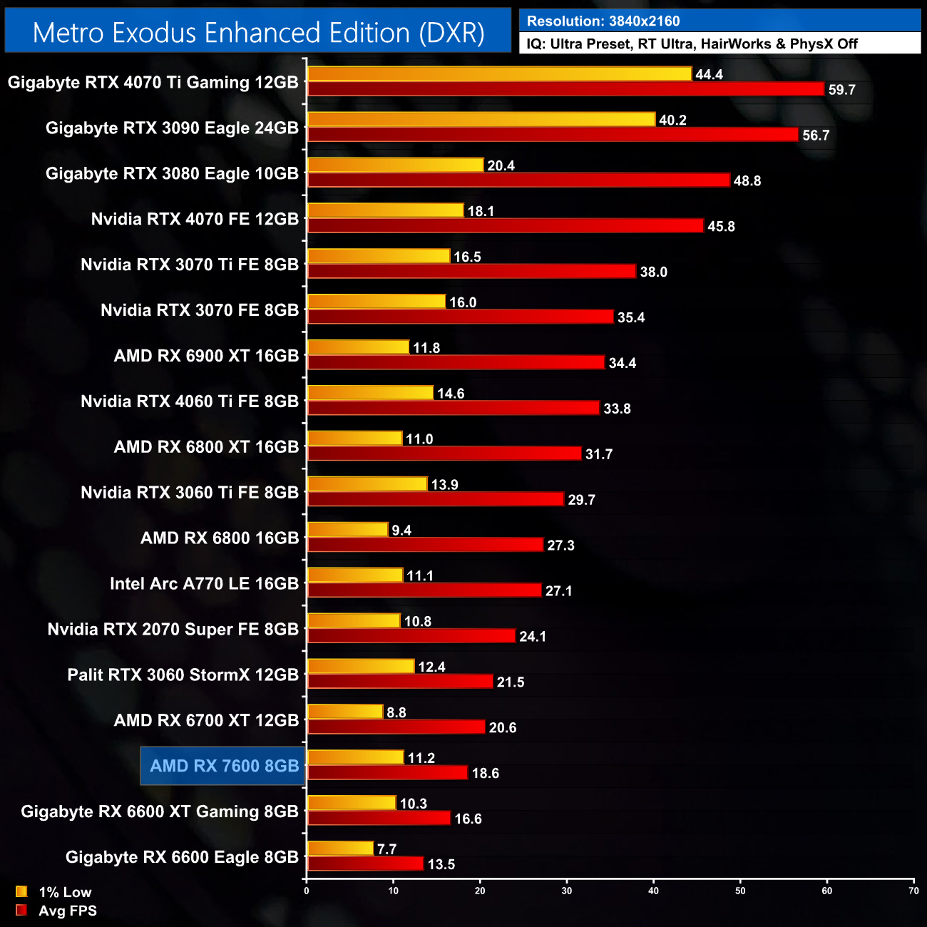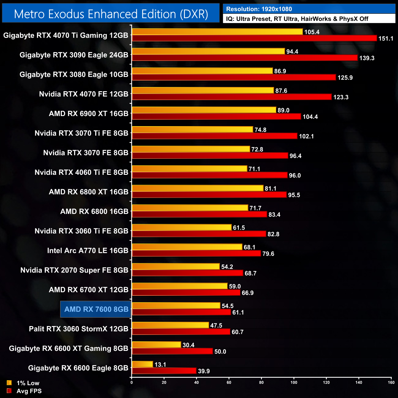 Metro Exodus Enhanced Edition finishes our ray tracing benchmarks on a more positive note however, with the RX 7600 delivering an almost-locked 60FPS, with particularly smooth 1% lows. It's a huge 53% faster than the RX 6600, and 22% ahead of the 6600 XT.