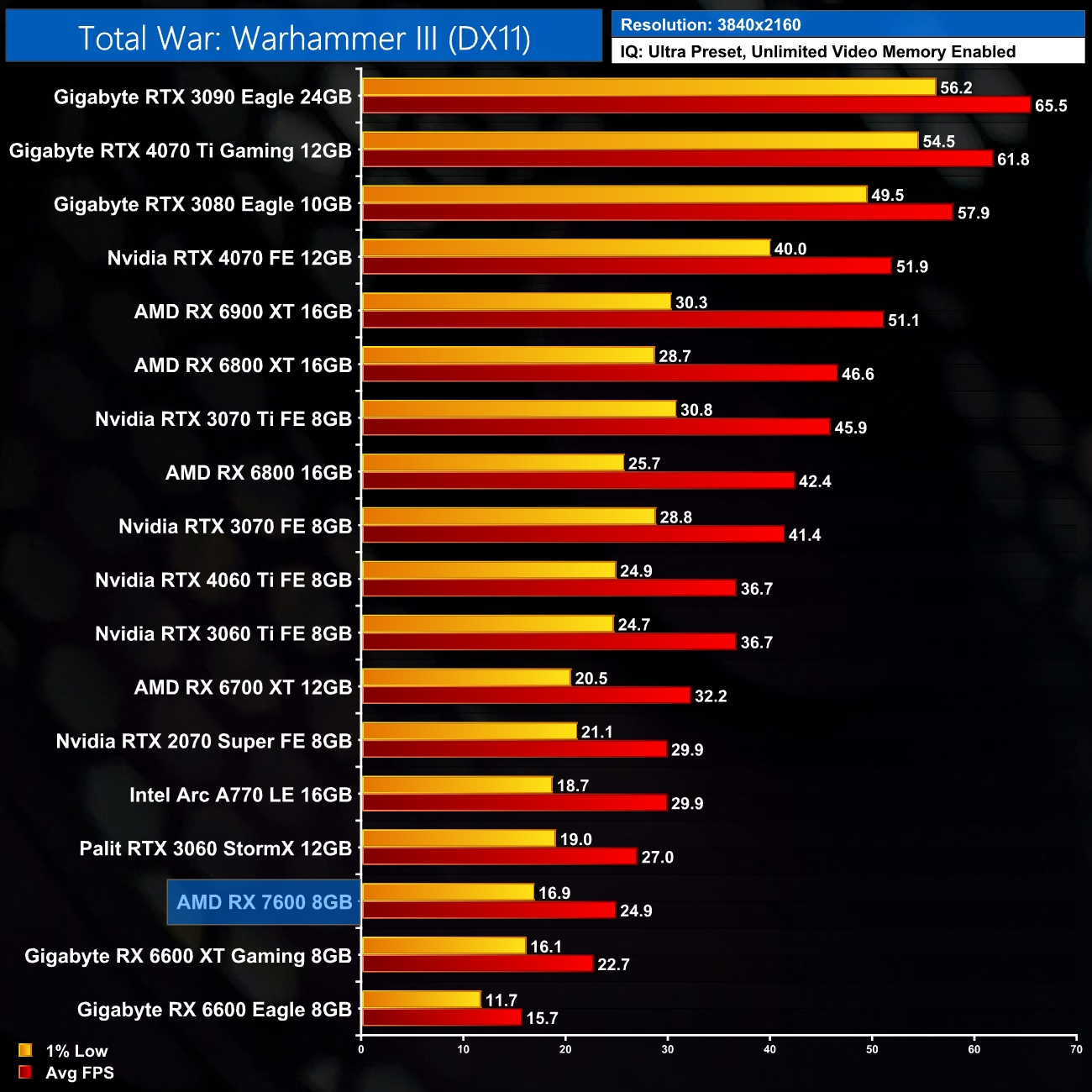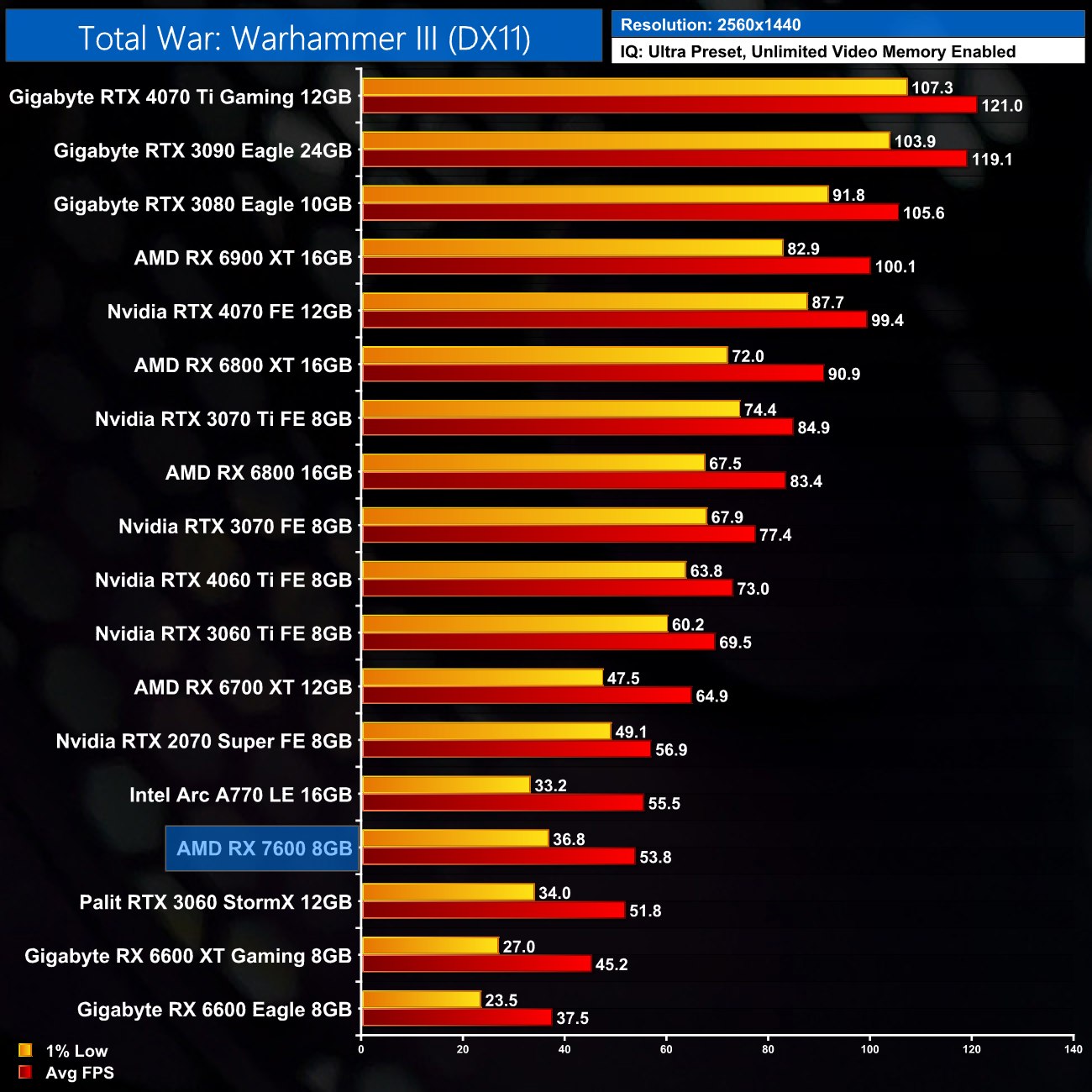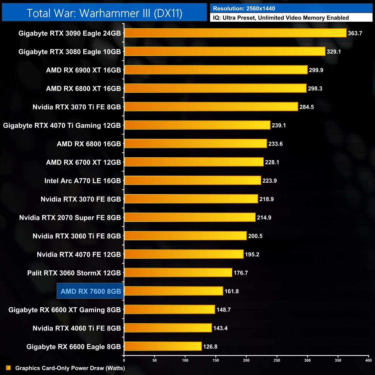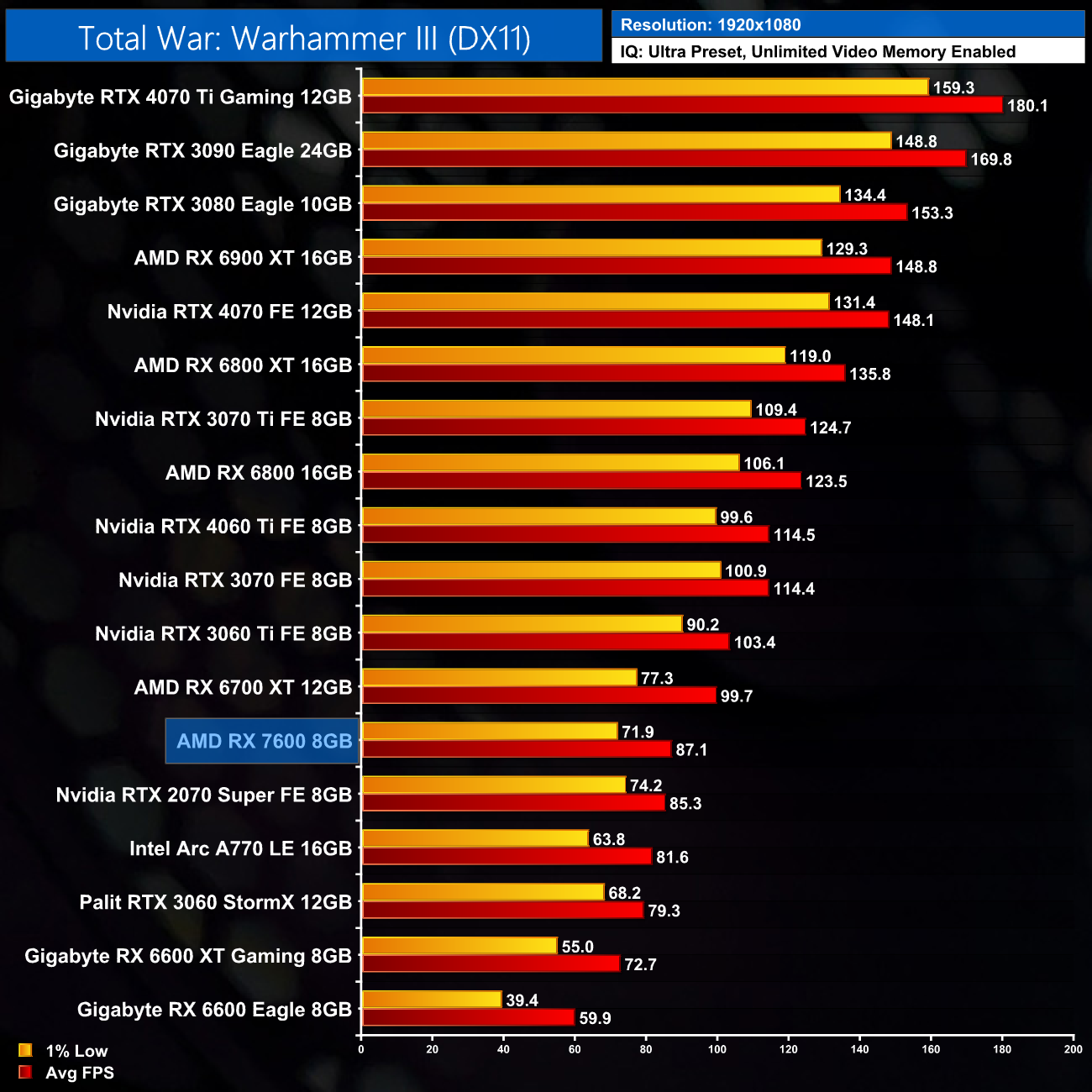 Total War: Warhammer III delivers more solid results, the 7600 is bringing its biggest gains over the RX 6600 here, to the tune of 45% at 1080p – a pretty impressive gen-on-gen uplift.