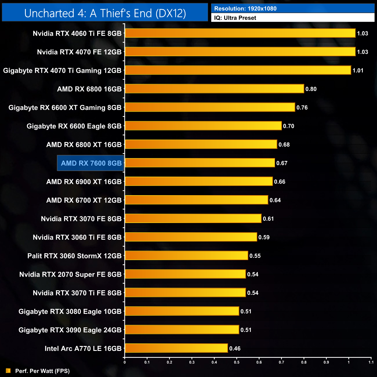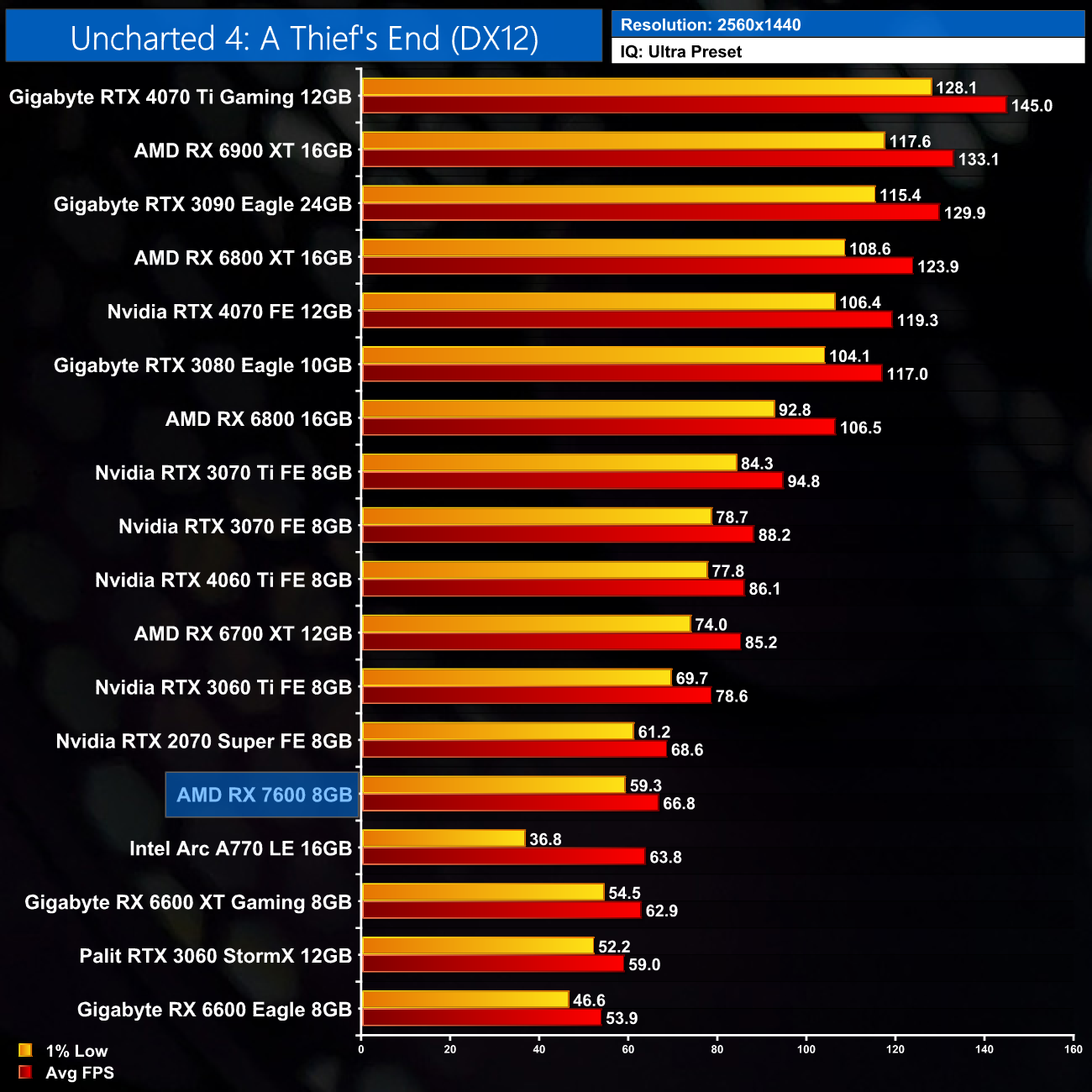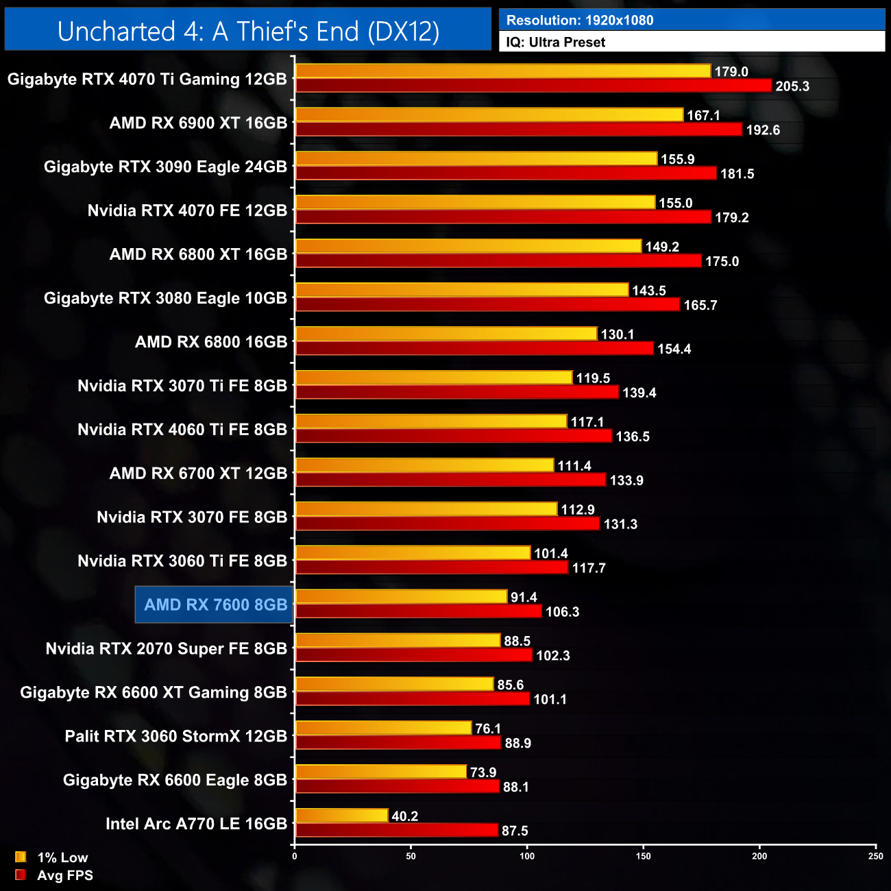 Finishing up the game benchmarks with Uncharted 4, with an average of 106FPS, we're looking at a smaller 20% uplift over the RX 6600, though coming in just 10% behind the RTX 3060 Ti isn't bad at all.