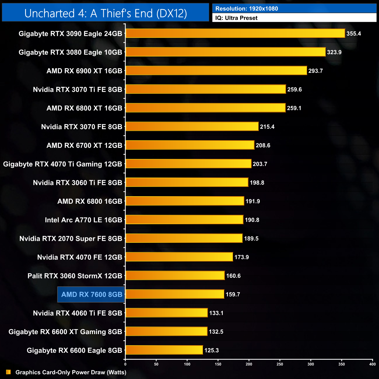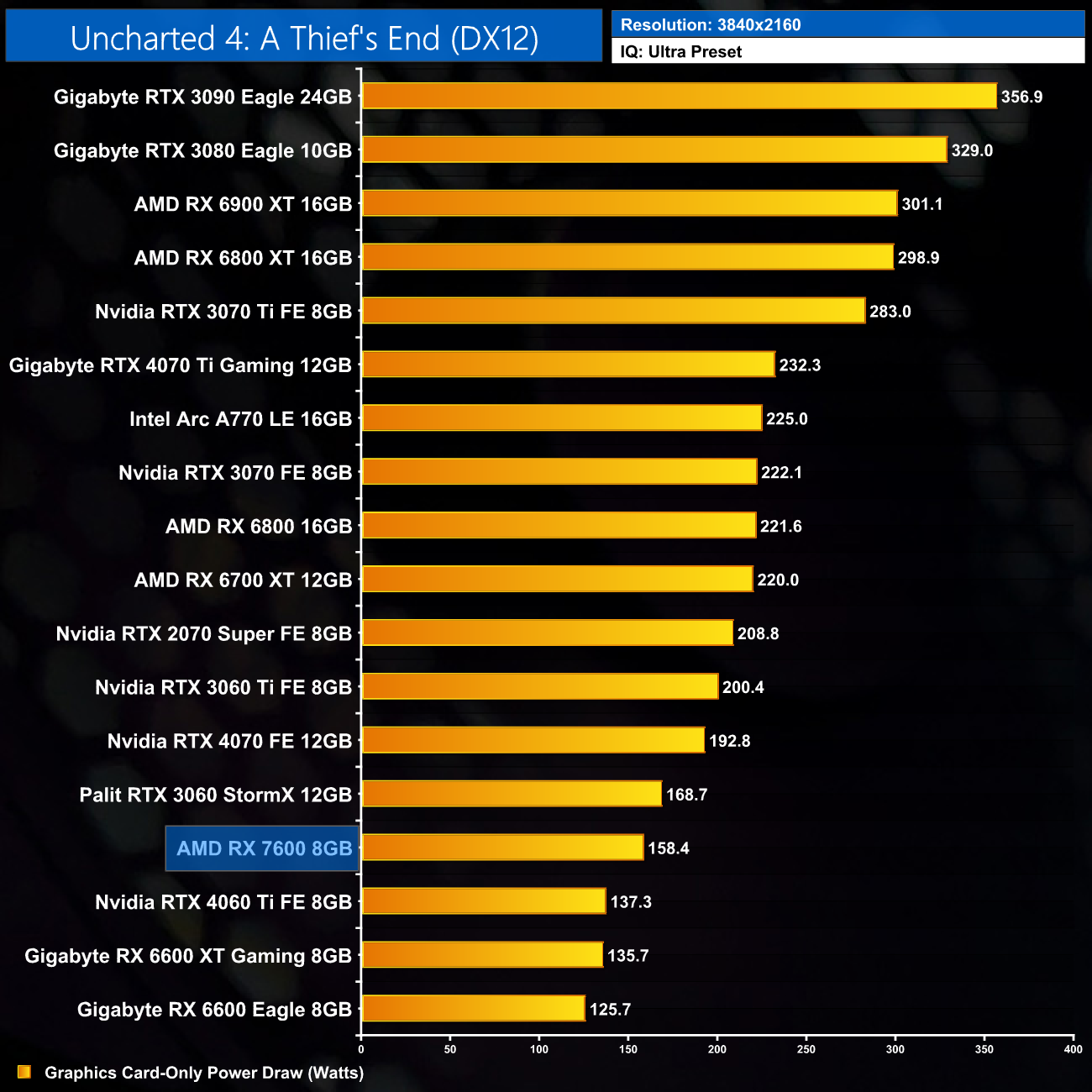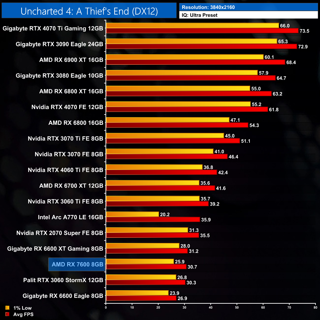Finishing up the game benchmarks with Uncharted 4, with an average of 106FPS, we're looking at a smaller 20% uplift over the RX 6600, though coming in just 10% behind the RTX 3060 Ti isn't bad at all.