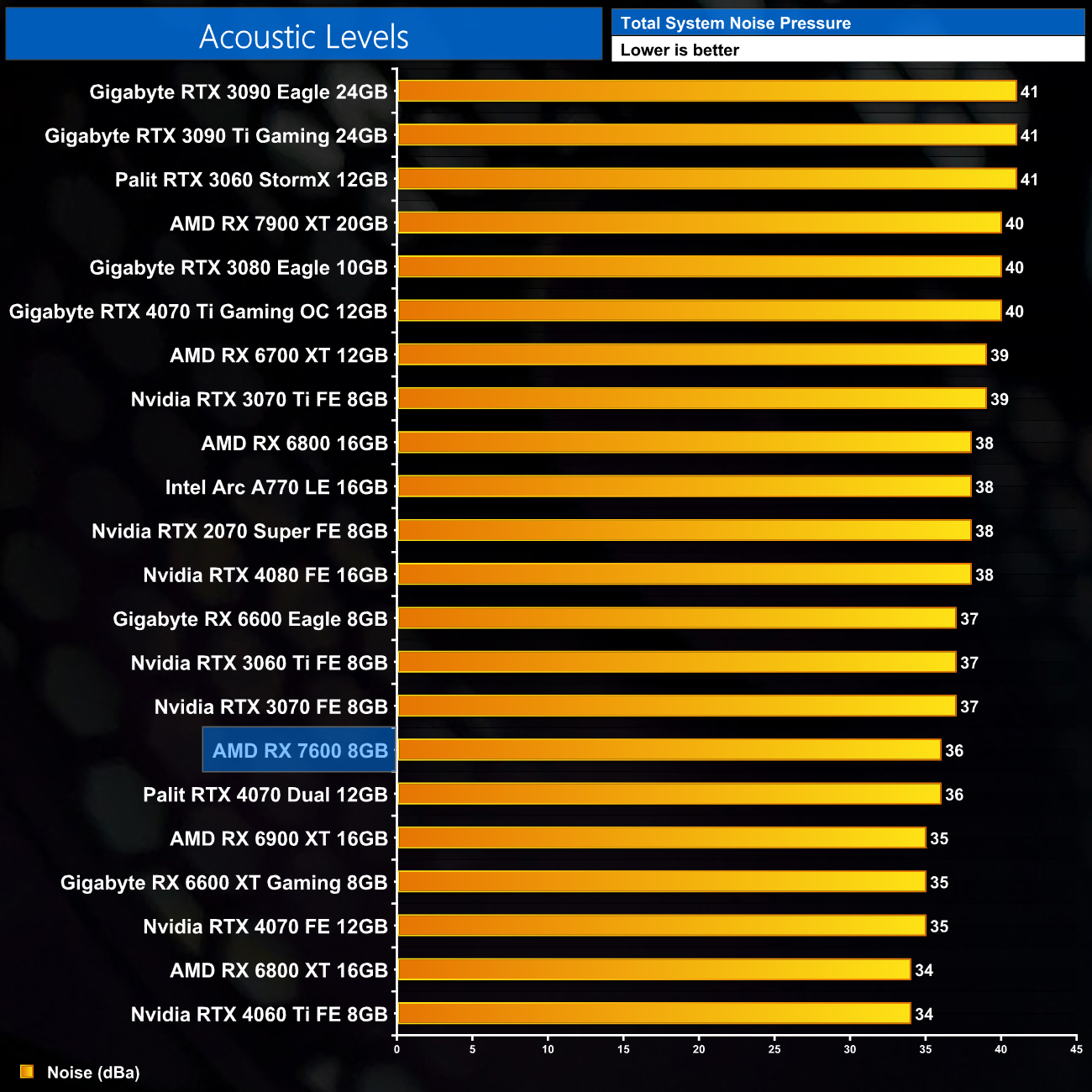 Noise levels are not a problem either. My testing saw the two fans run at 54%, or 1650rpm, over our thirty minute stress test, resulting in noise levels hitting 36dBa. I did notice some coil whine during my testing, but typically only in the in-game menus – during actual gameplay this was not a problem, and we include a sound test in our video review.