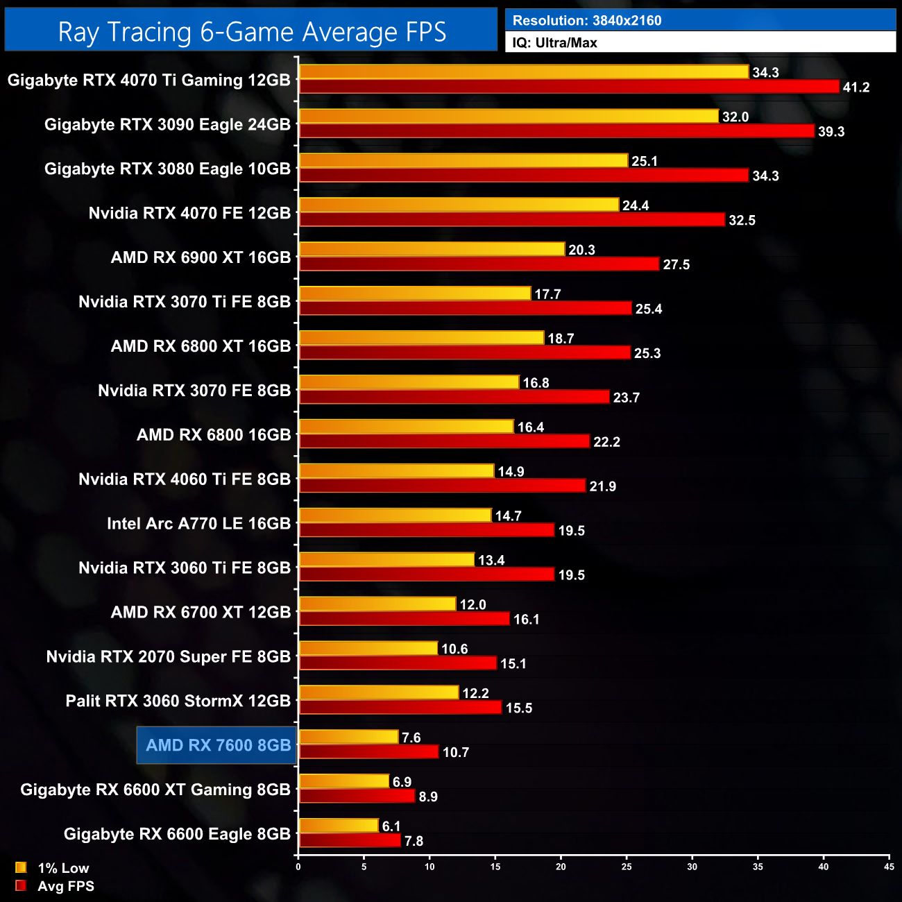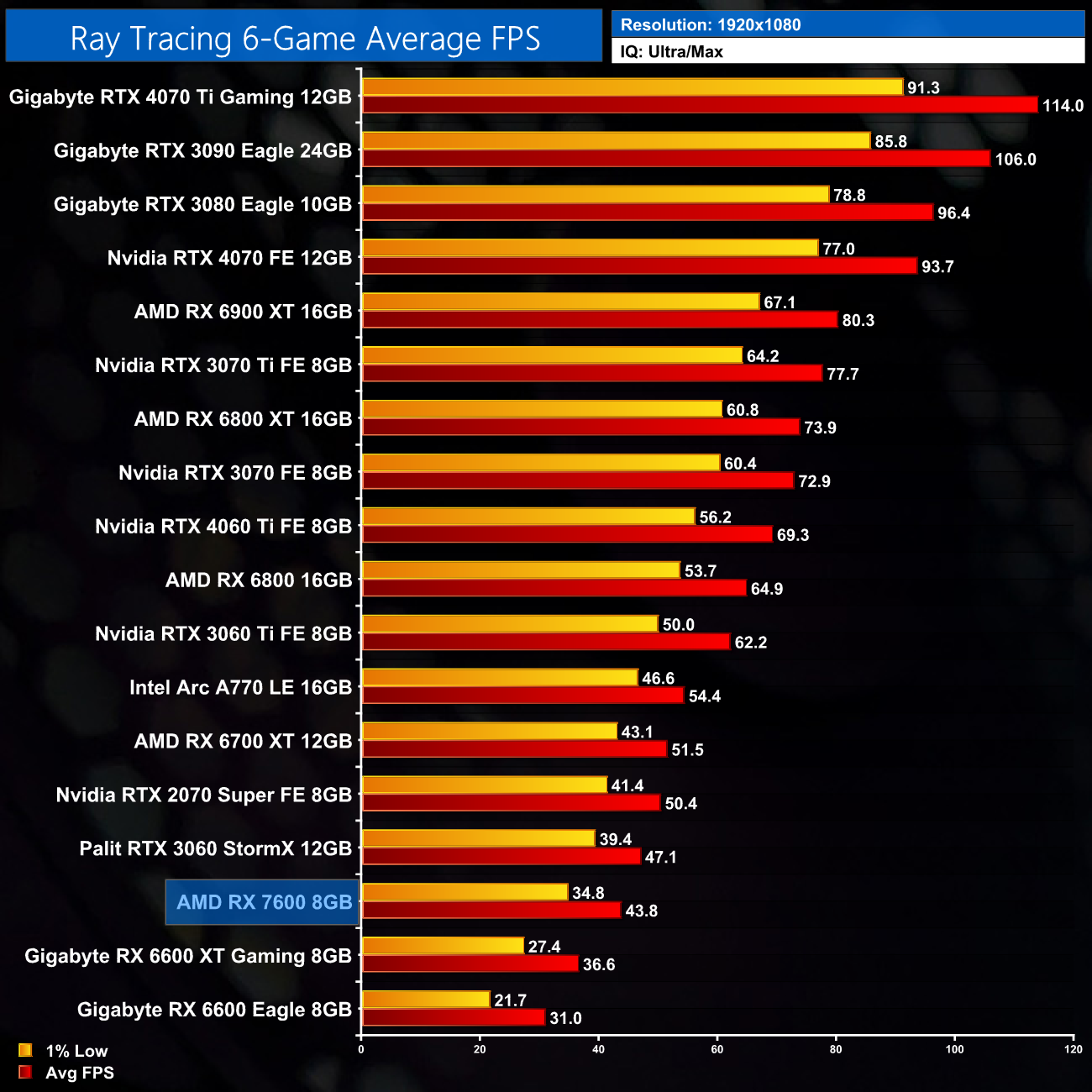 The RX 7600 falls further down the chart in terms of ray tracing efficiency too, where it can only match the RTX 2070 Super released in 2019.
