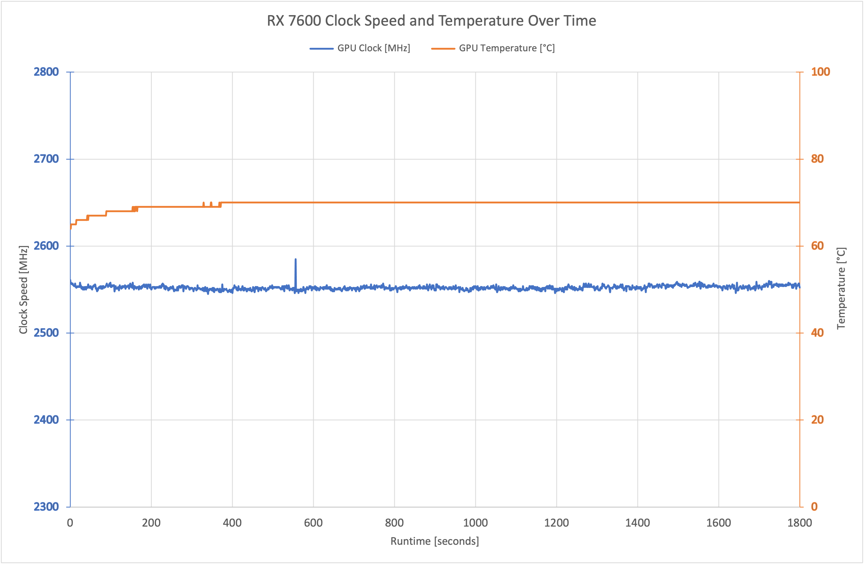 Clock speed behaviour is very tight overall, with only small fluctuations in our testing. The RX 7600 averaged a frequency of 2552MHz across the 30 minute stress test.