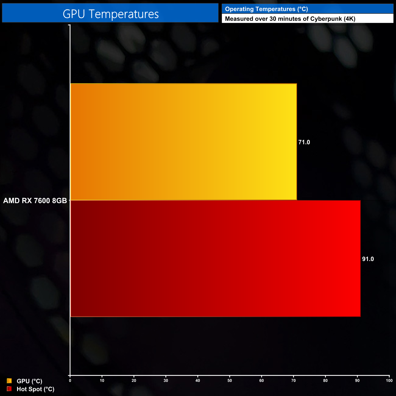 As for thermal performance, the dinky reference card is more than a match for the Navi 33 silicon. The GPU peaked at 71C, with the hot spot a touch warmer at 91C, but still within safe limits. We will shortly be testing the Sapphire Pulse model to see how it compares.