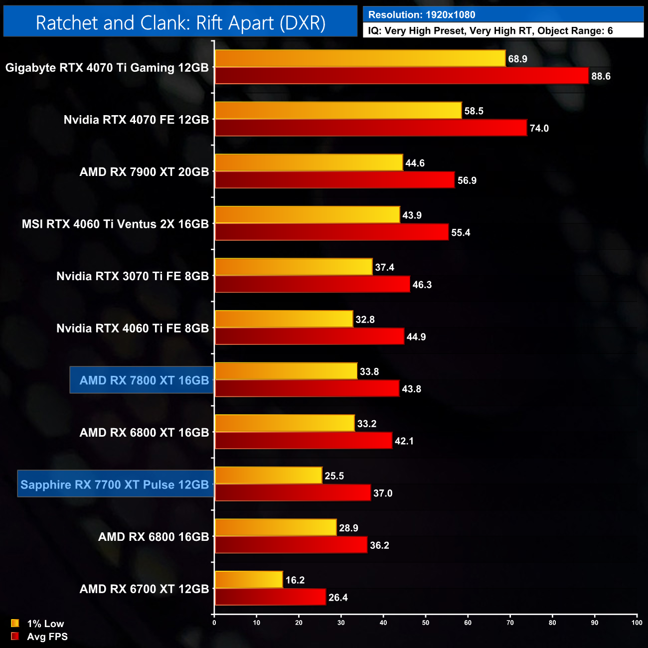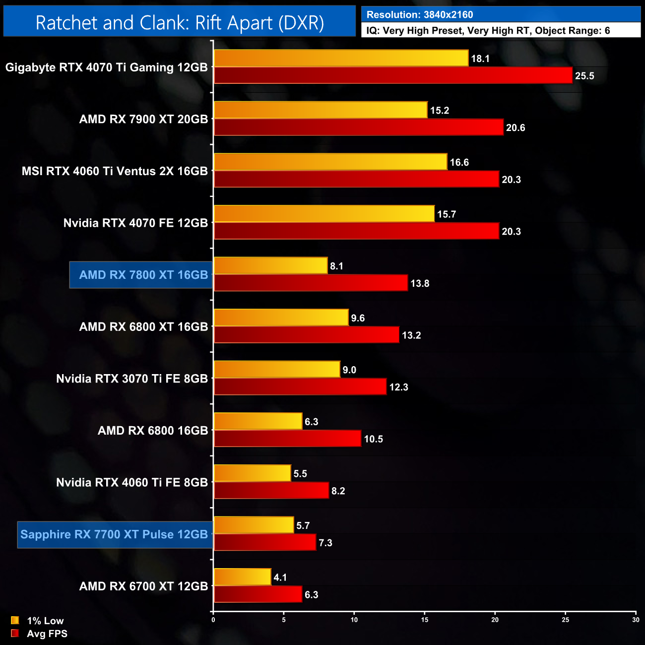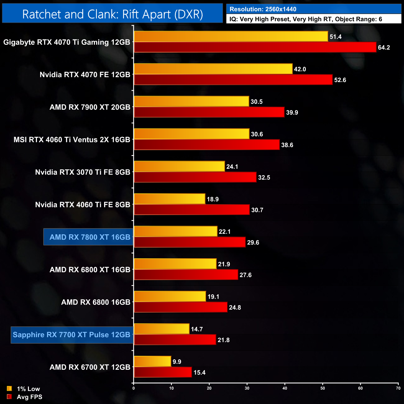 Ratchet and Clank is another very tough one for the RX 7800 XT, however. At 1080p it delivers 44FPS, making it 41% slower than the RTX 4070 and just about level with the RTX 4060 Ti 8GB. 1440p is not viable either, with 1% lows hitting 22FPS. It's perhaps no surprise the game launched with RT disabled for AMD GPUs.