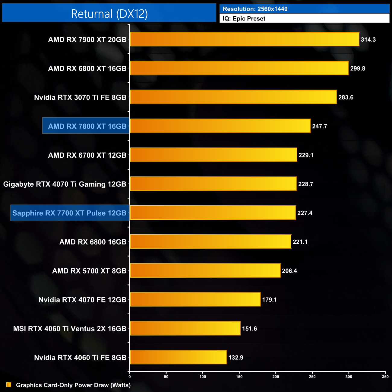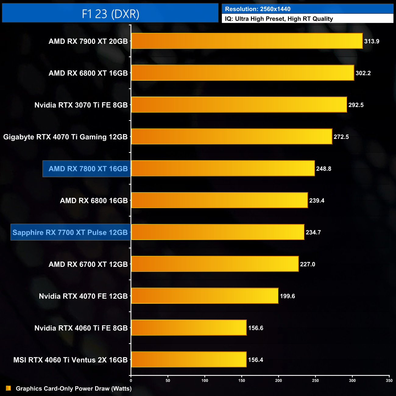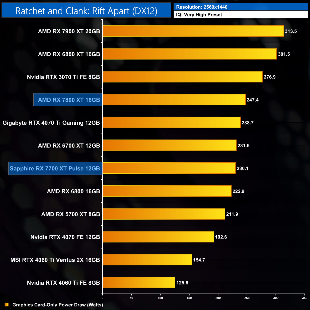 Up at 1440p, we don't see much change in power draw – most games hover at or around the 250W mark, and we get an average reading of 247.8W.
