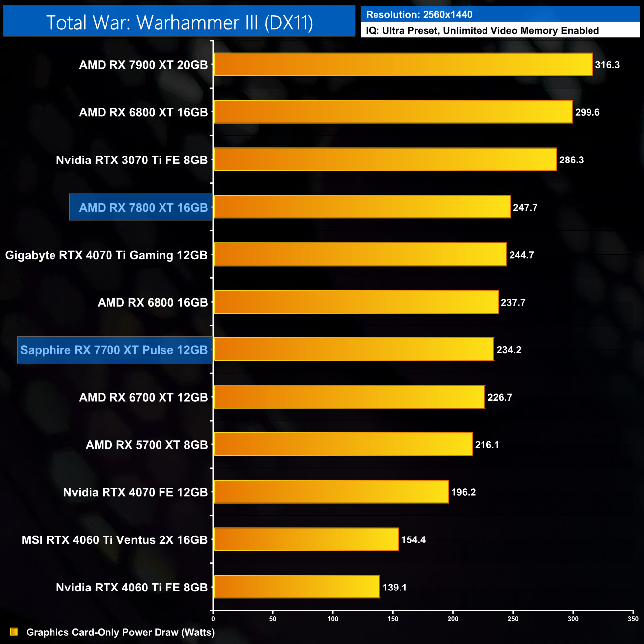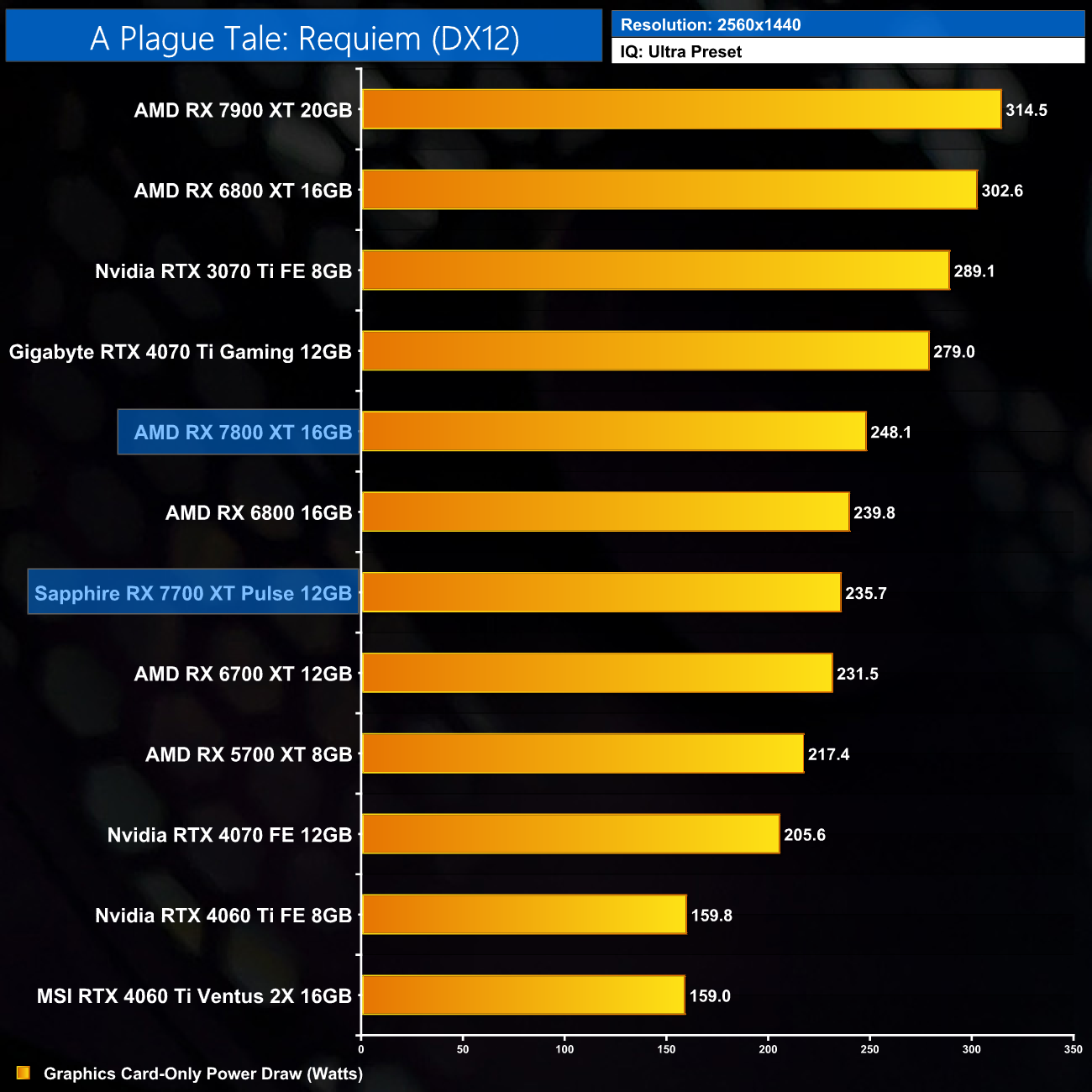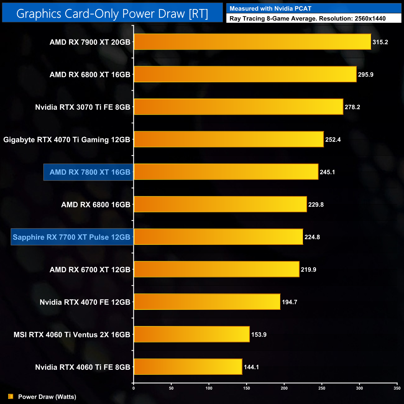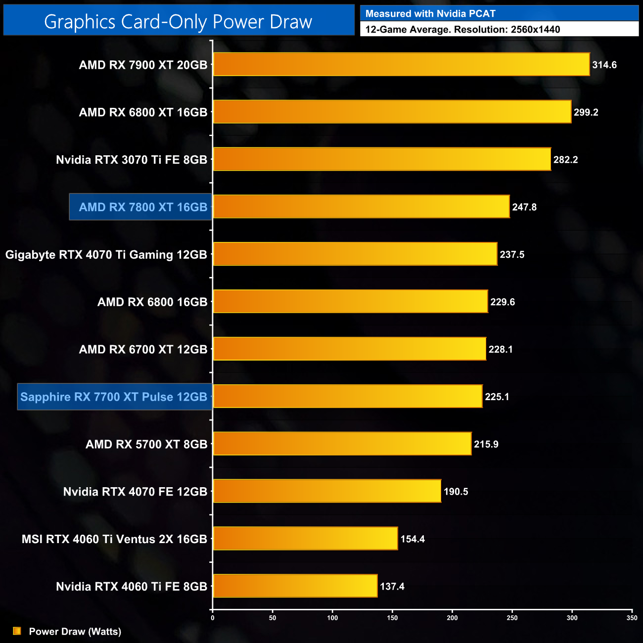 Here we present power draw figures for the graphics card-only, on a per-game basis for all twelve games we tested at 1440p. This is measured using Nvidia's Power Capture Analysis Tool, also known as PCAT. You can read more about our updated power draw testing methodology HERE.