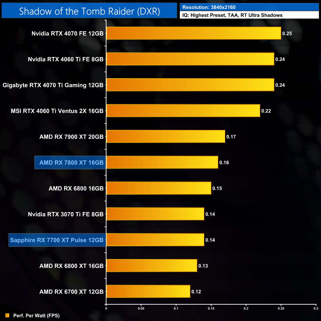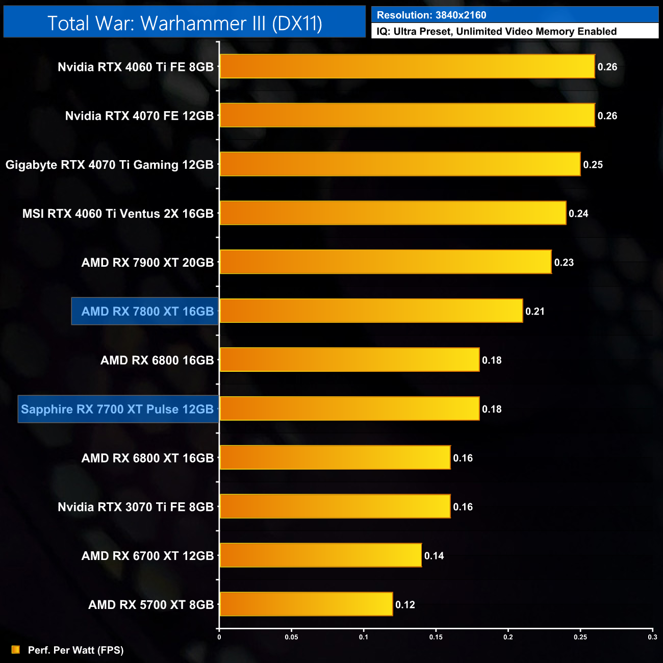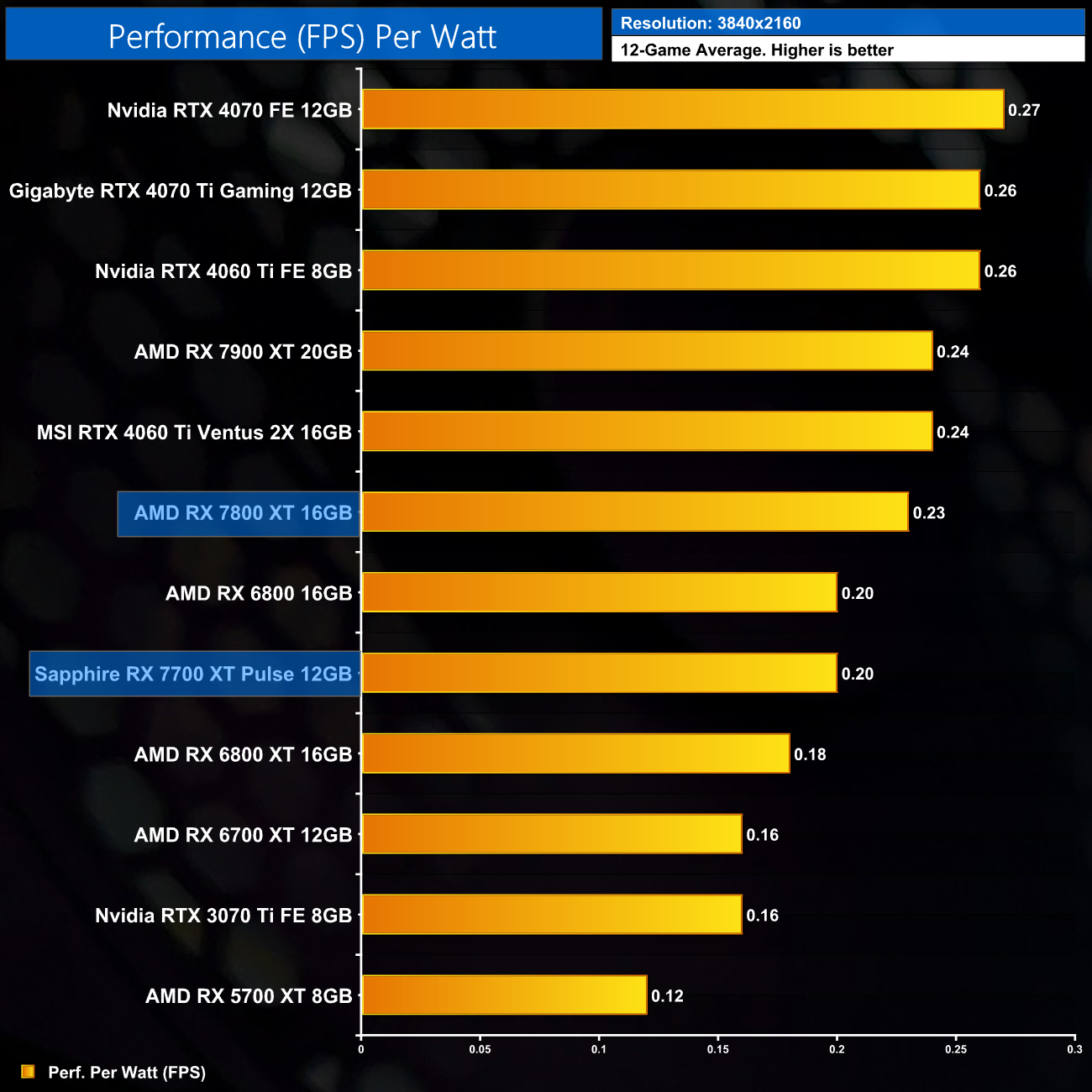 Using the graphics card-only power draw figures presented earlier in the review, here we present performance per Watt on a per-game basis for all twelve games we tested at 2160p (4K).