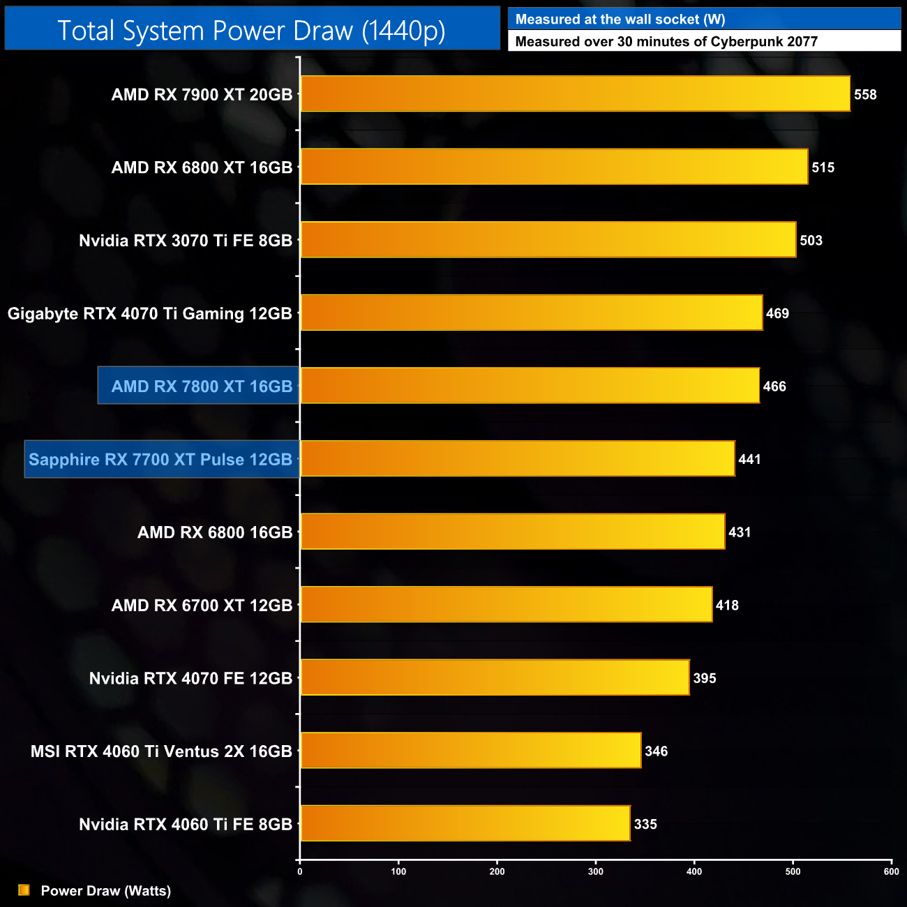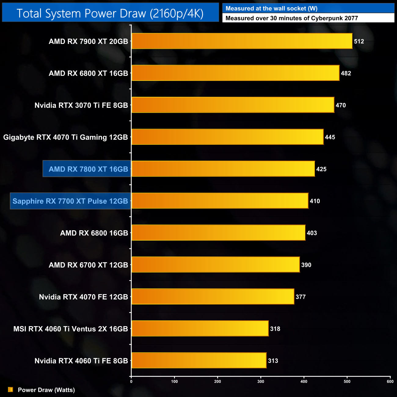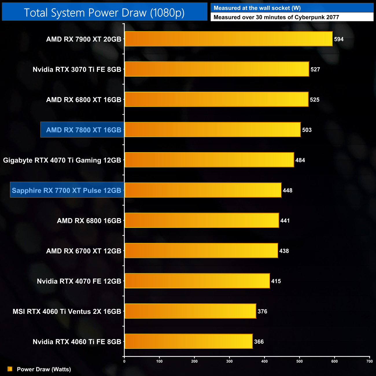 Total system power draw is the last area for us to look at today, with the RX 7800 XT drawing a peak of 503W at 1080p in my Cyberpunk 2077 testing. AMD officially recommends a 700W power supply.