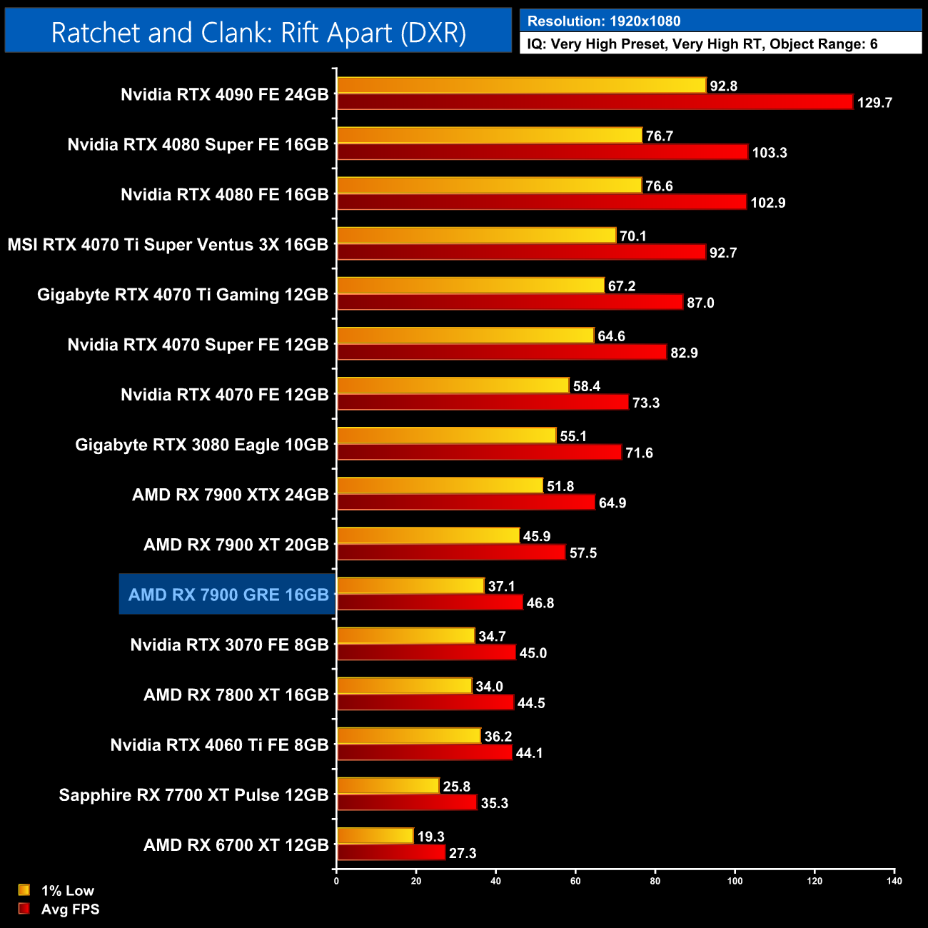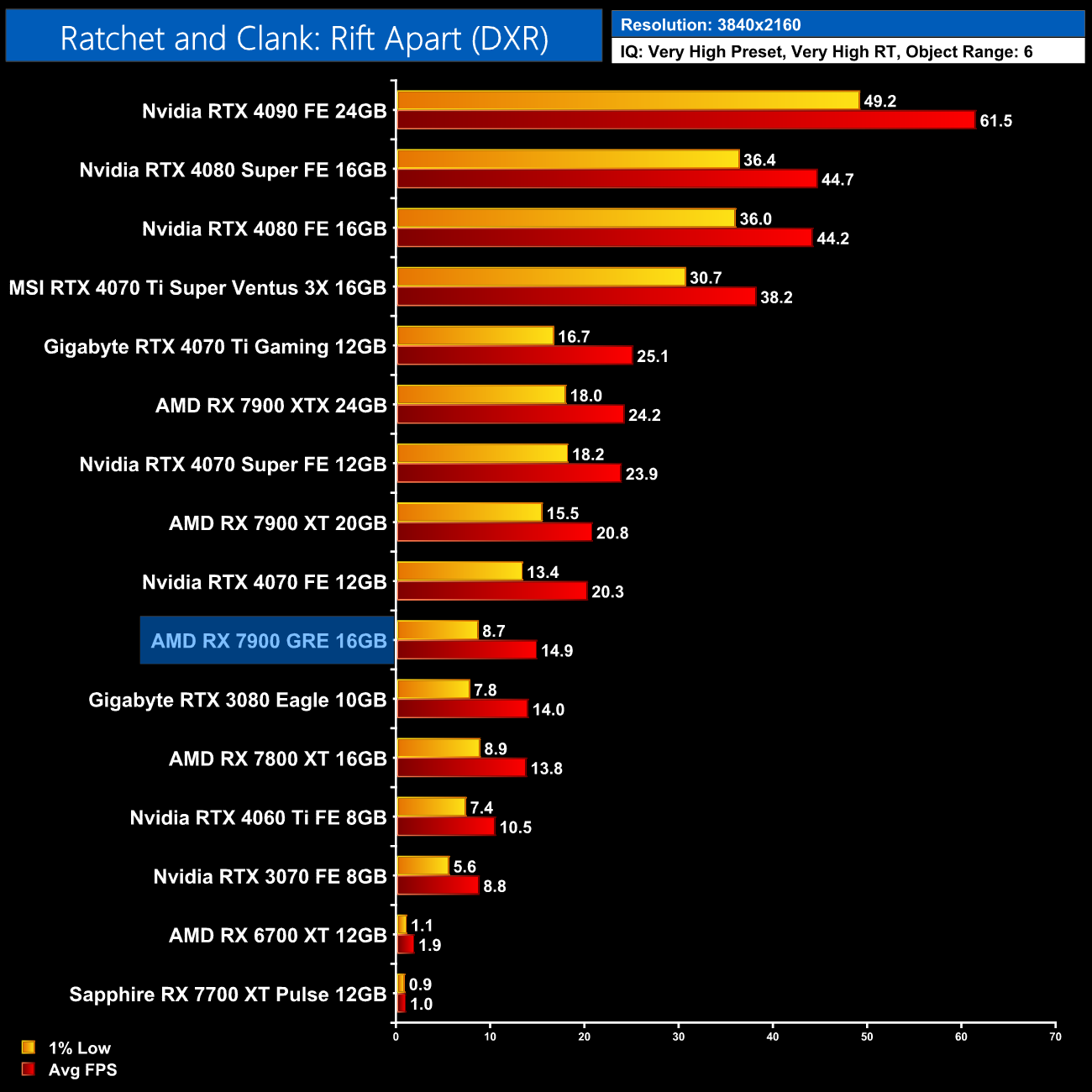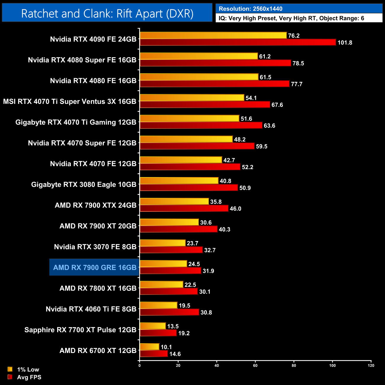 The 7900 GRE gets pummelled in Ratchet and Clank, too, averaging 32FPS at native 1440p, making it a whopping 46% slower than the 4070 Super – even the RTX 3070 is faster here.