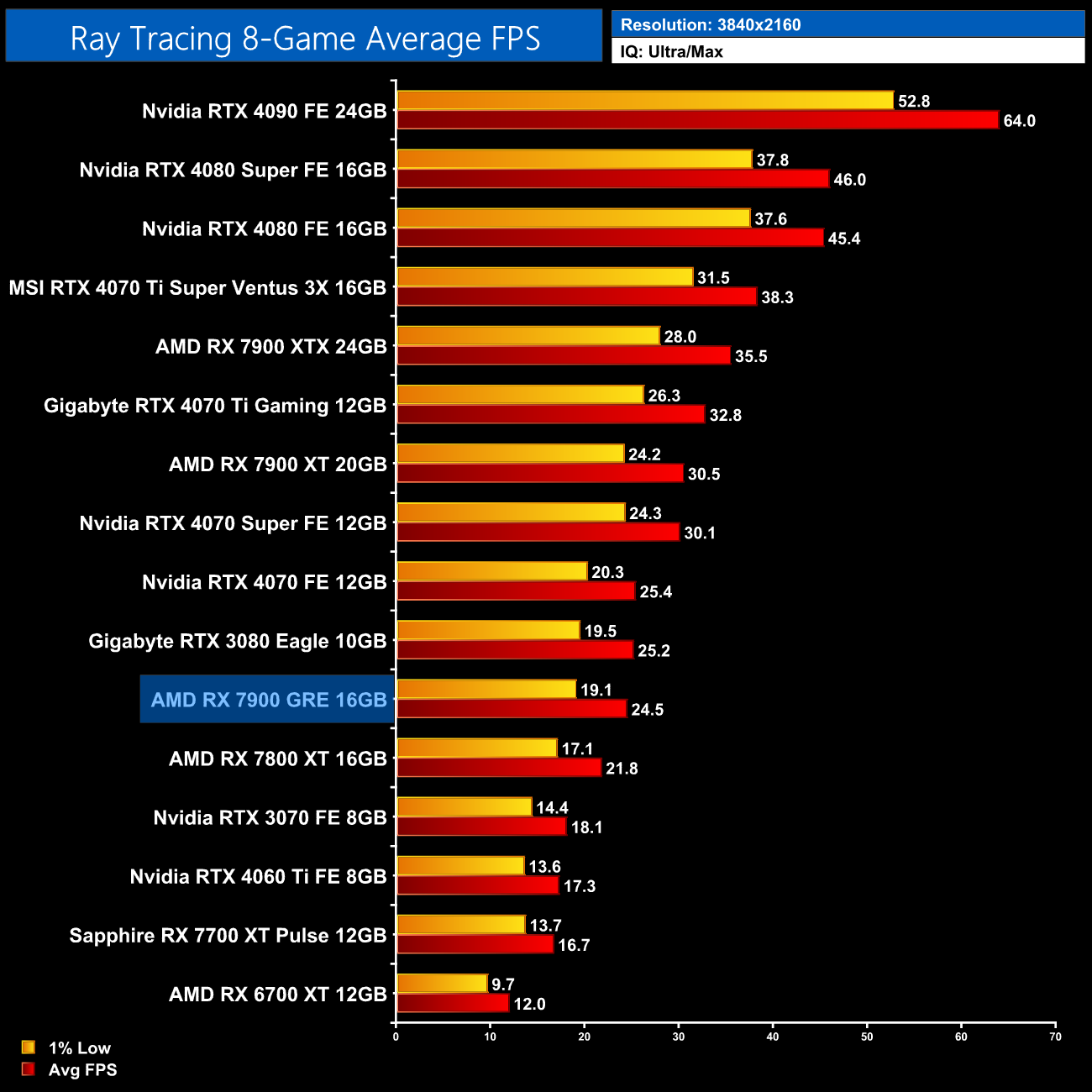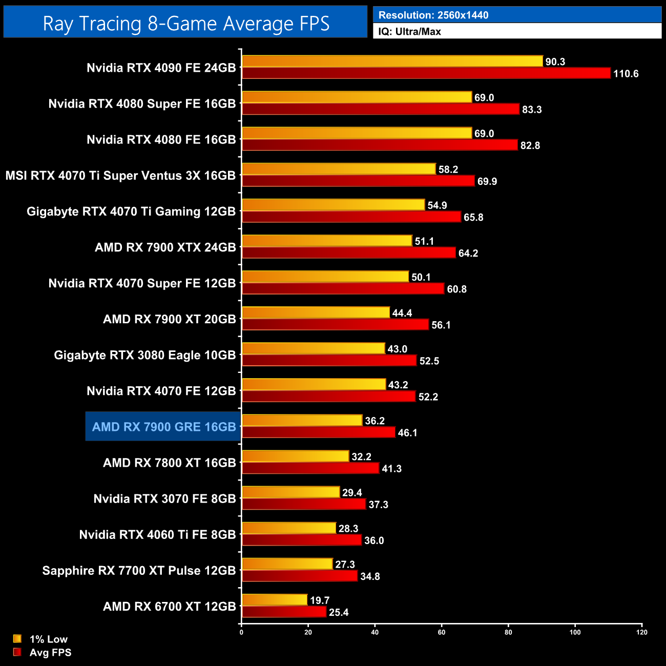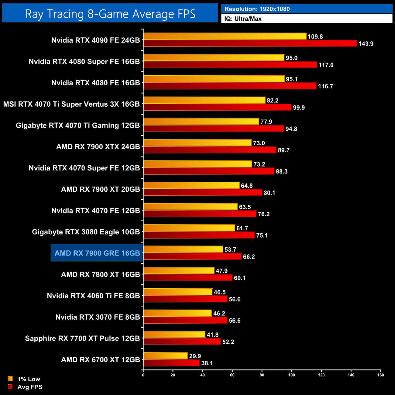Across the 8 ray traced games tested, it is clear that Nvidia is the stronger choice if you value this feature. At 1440p, the 7900 GRE is 12% slower than the vanilla RTX 4070 for instance, a product that can now be found for £500. It does scale better versus the 7800 XT when ray tracing is enabled, being 12% faster on average, compared to 8% when looking at rasterised performance – but it's 24% behind the RTX 4070 Super.