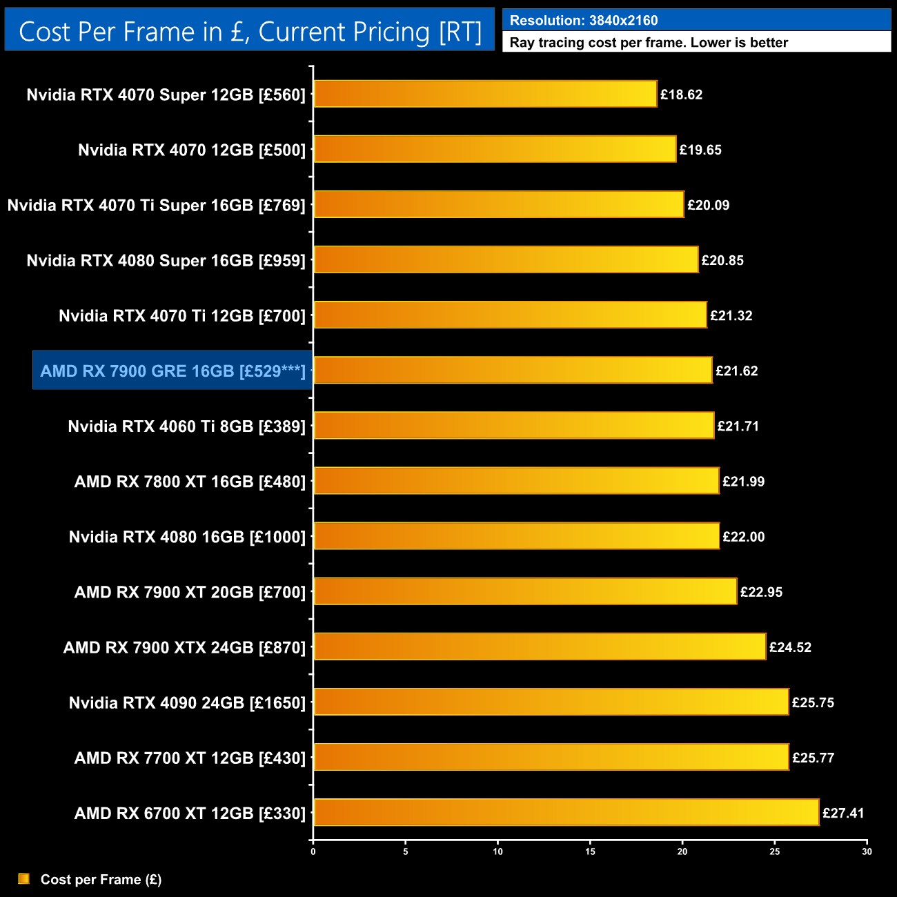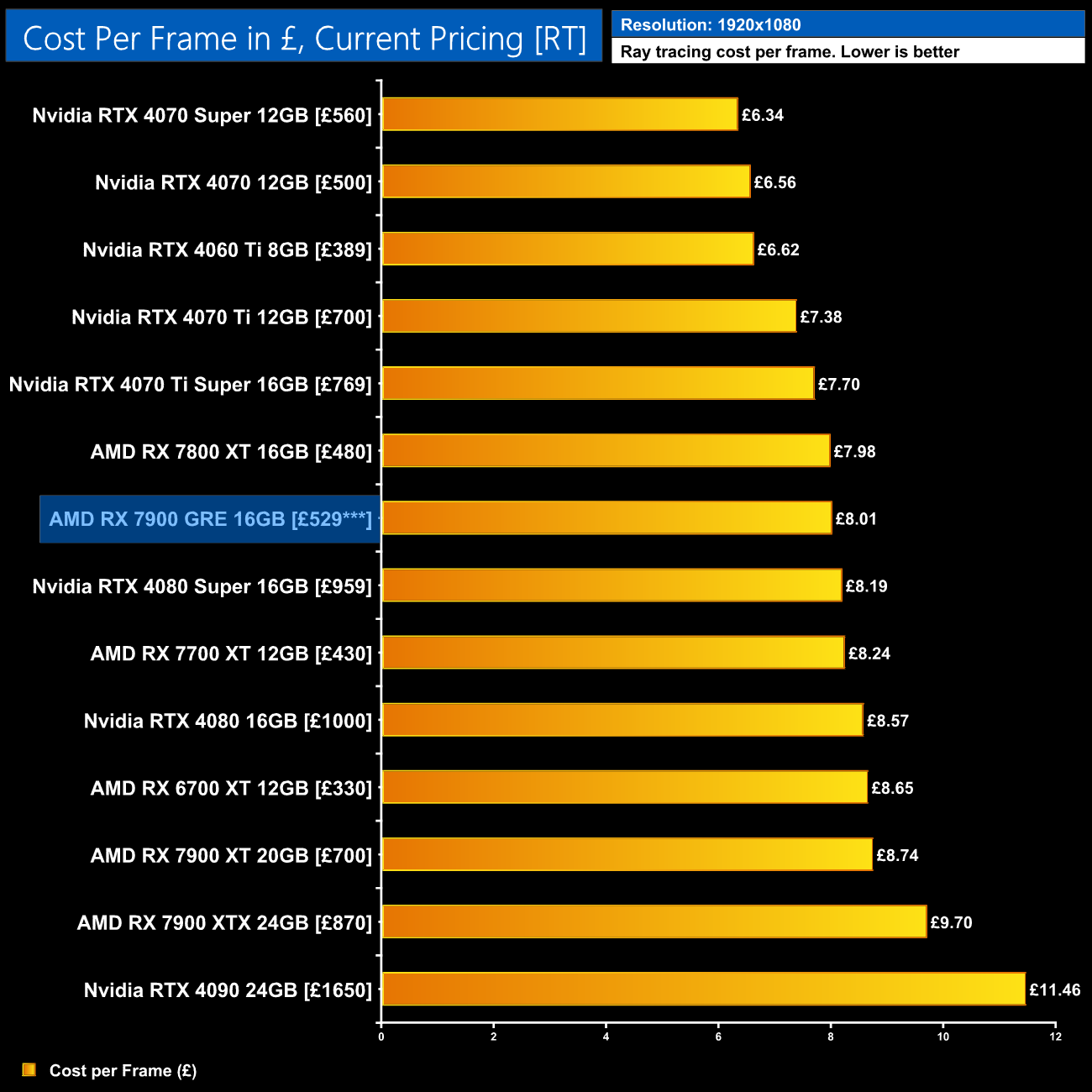 In terms of ray traced cost per frame then, if the guesstimate £529 figure turns out to be accurate, we're looking at value that's 25% worse than the RTX 4070 Super. Obviously, if the confirmed price is slightly lower then relative value will increase, and vice versa, but the overall trend is clear – Nvidia offers the best value for ray tracing.