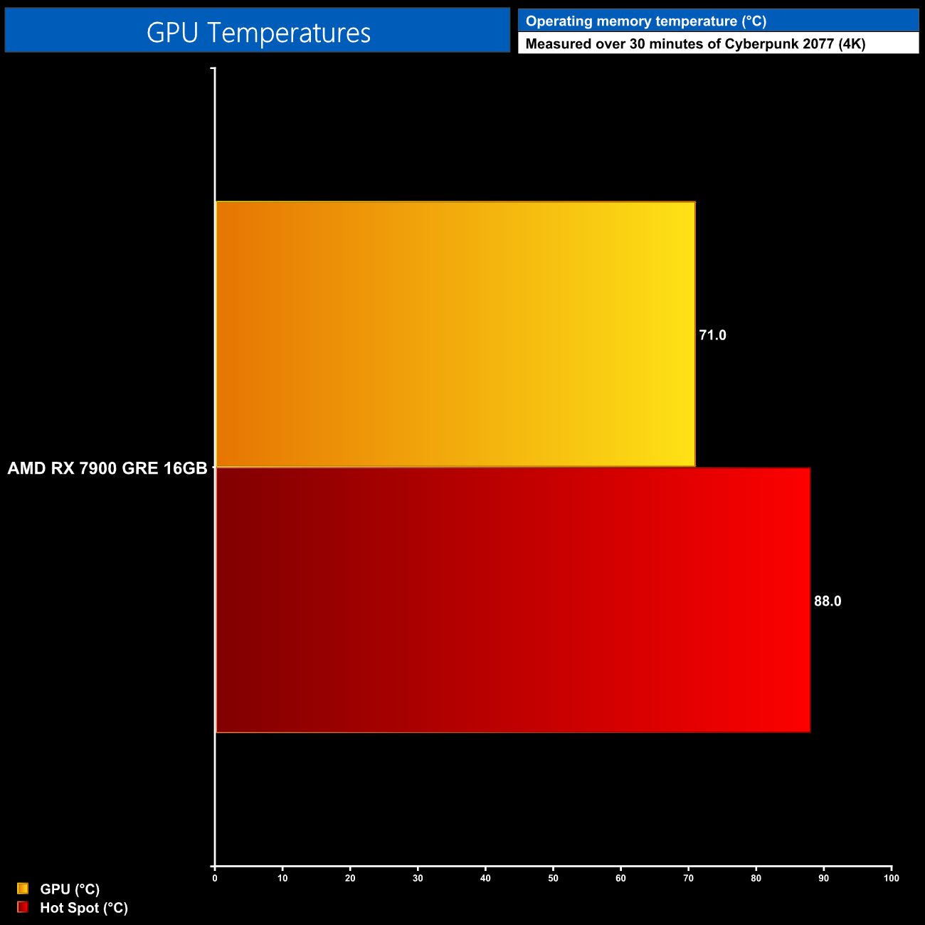 As mentioned, we've only tested one 7900 GRE model so far so we have no other point of comparison, but the reference model saw the GPU hit 71C with the hot spot at 88C, fairly typical performance for an AMD reference design.