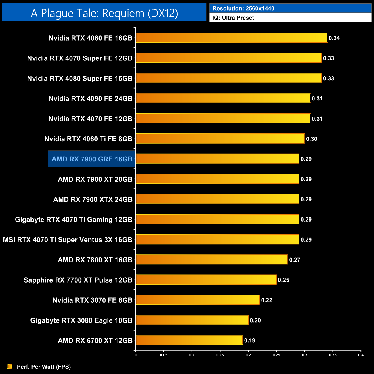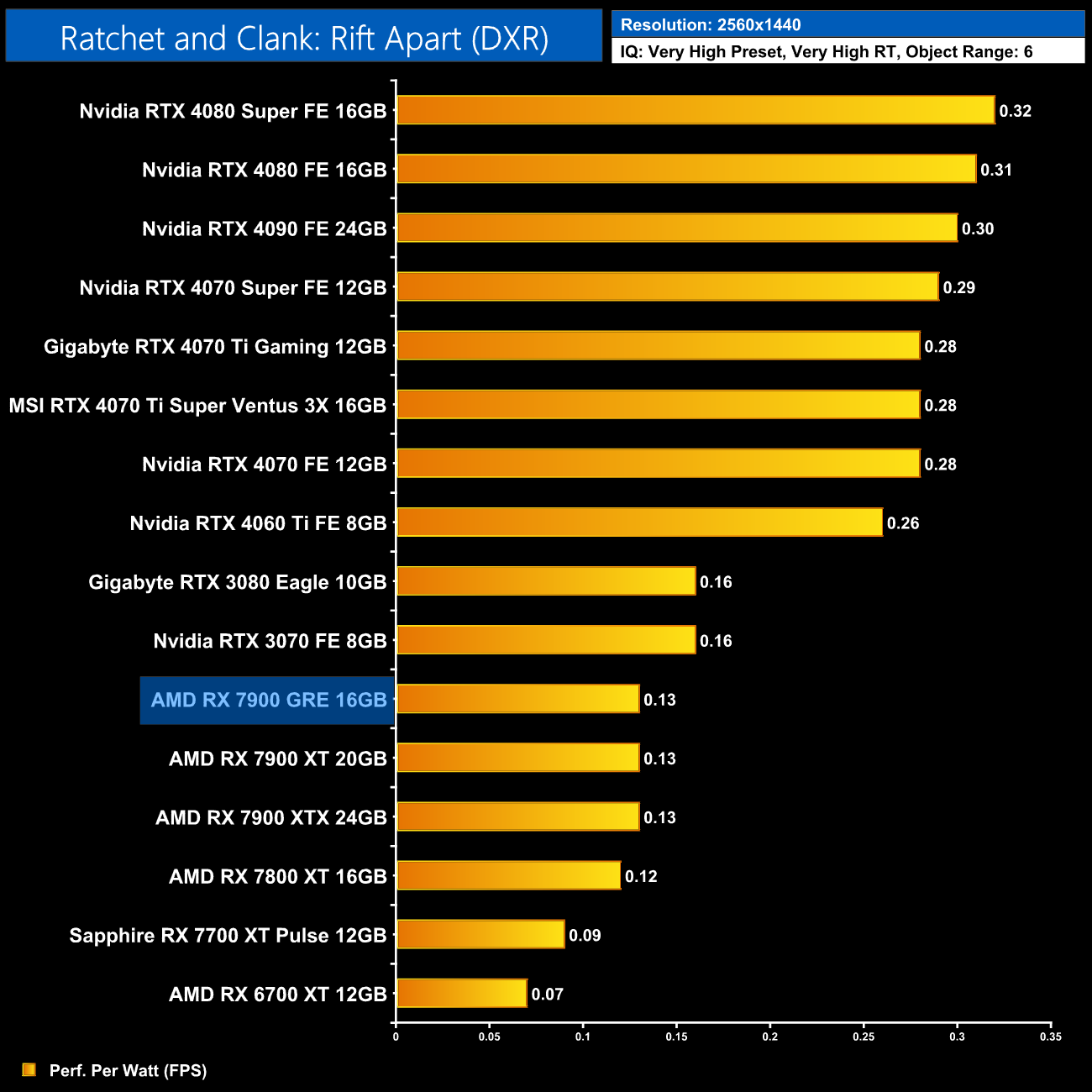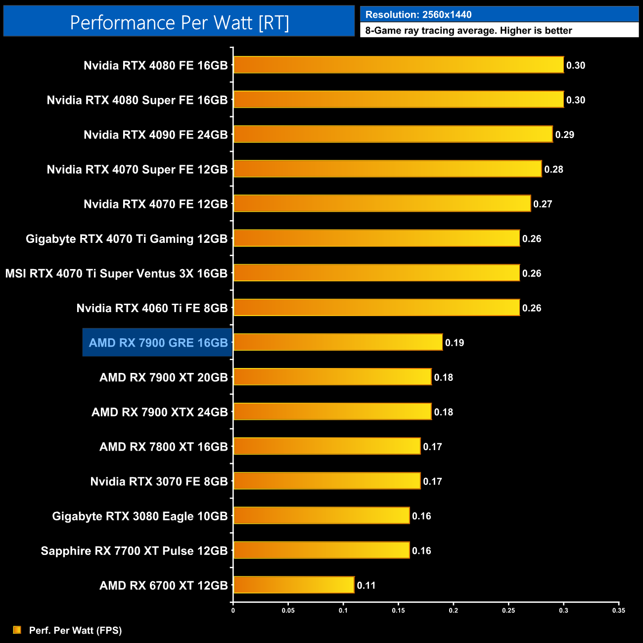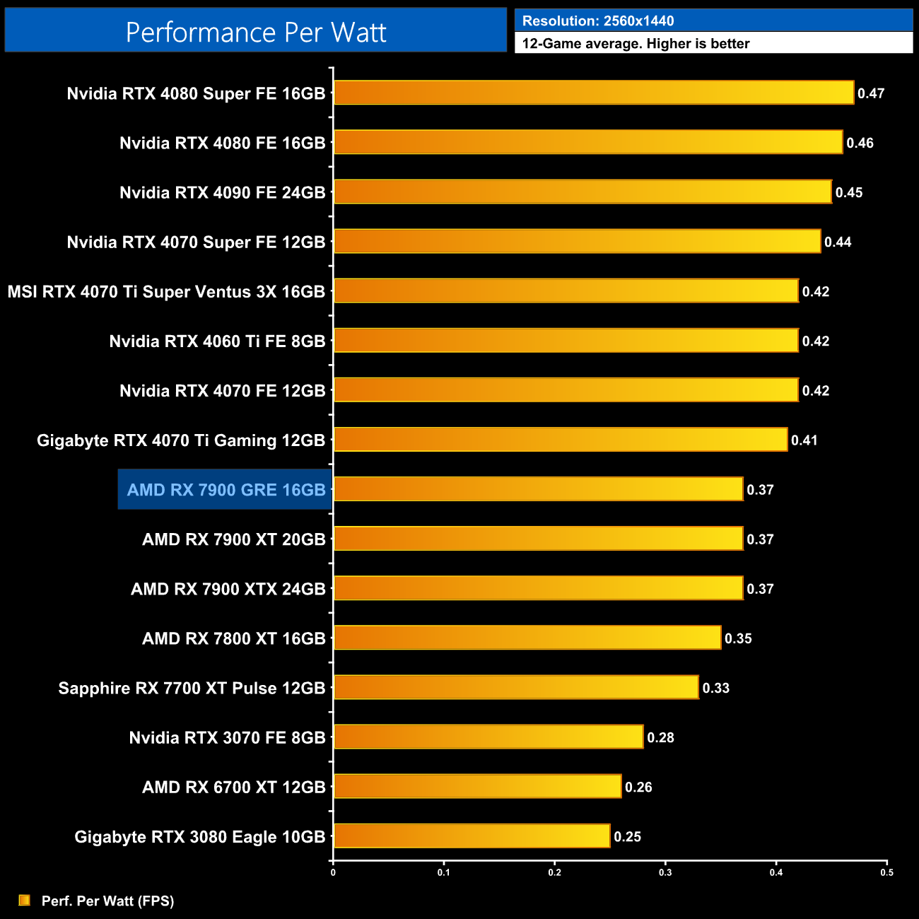 At 1440p, performance per Watt is now level with the RX 7900 XT and XTX. It's still fractionally improved over the RX 7800 XT, but we're talking very small differences here. That means Ada Lovelace remains the more efficient architecture, with the 4070 Super offering 19% better performance per Watt.