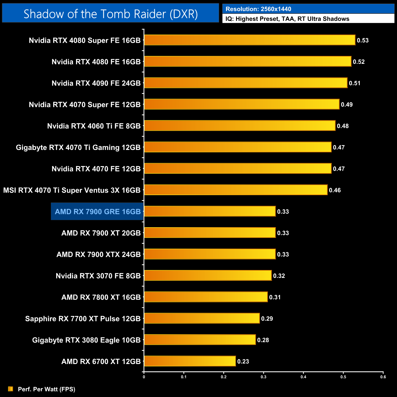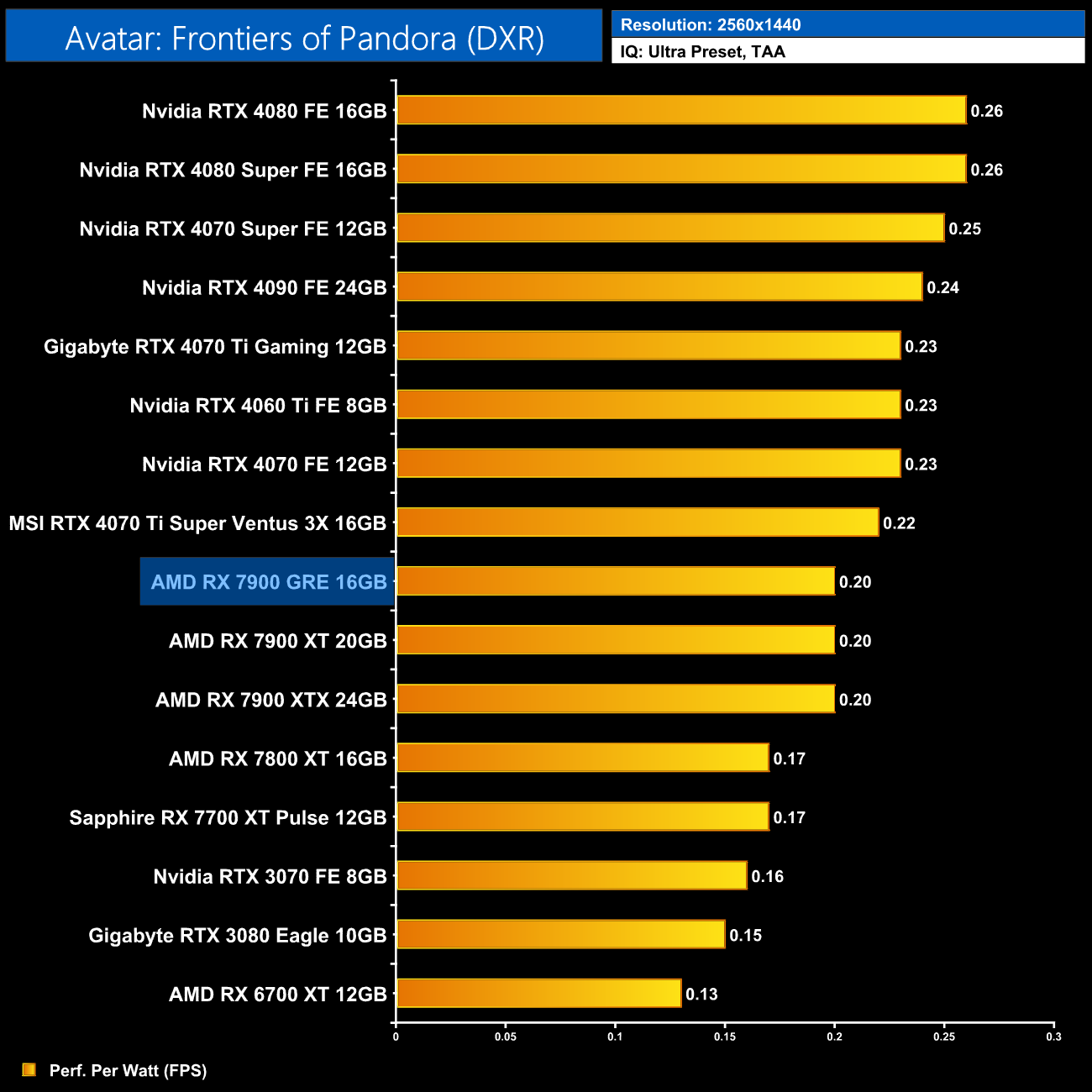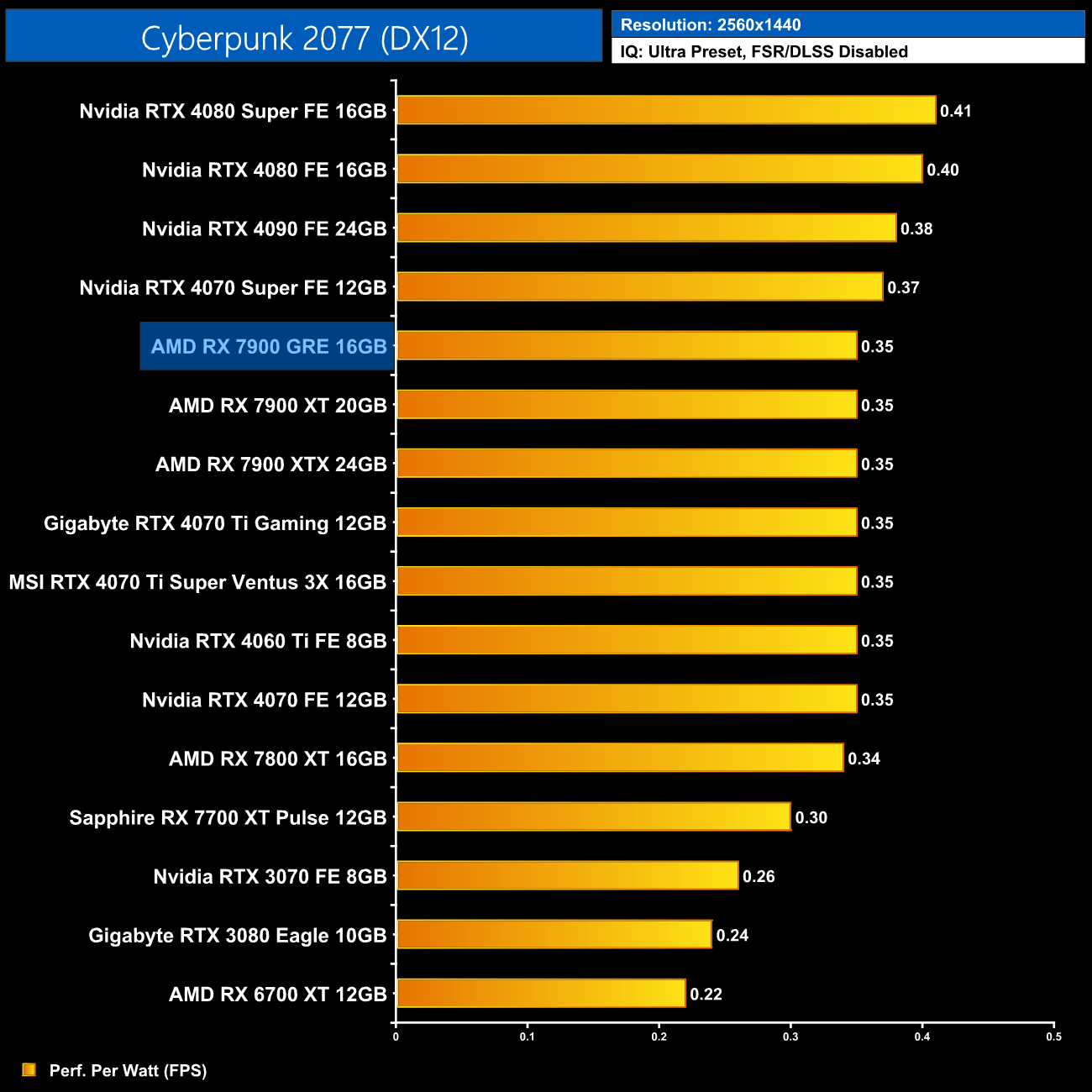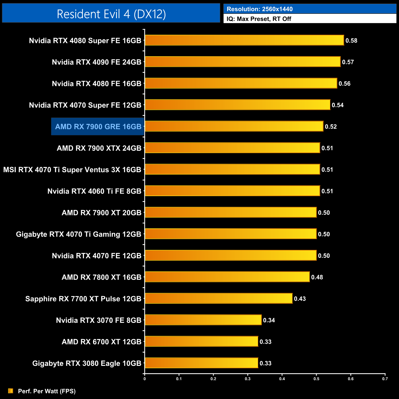 At 1440p, performance per Watt is now level with the RX 7900 XT and XTX. It's still fractionally improved over the RX 7800 XT, but we're talking very small differences here. That means Ada Lovelace remains the more efficient architecture, with the 4070 Super offering 19% better performance per Watt.