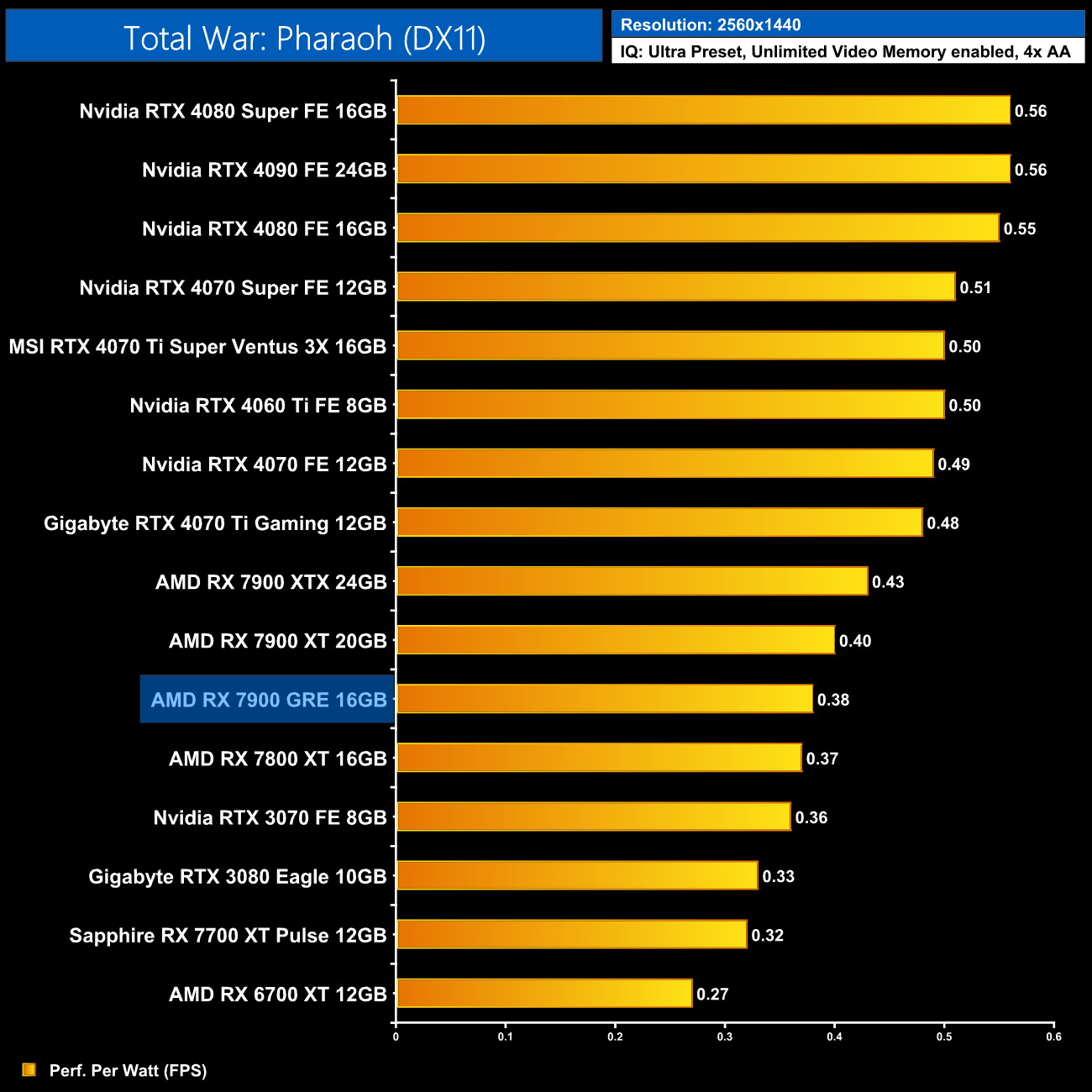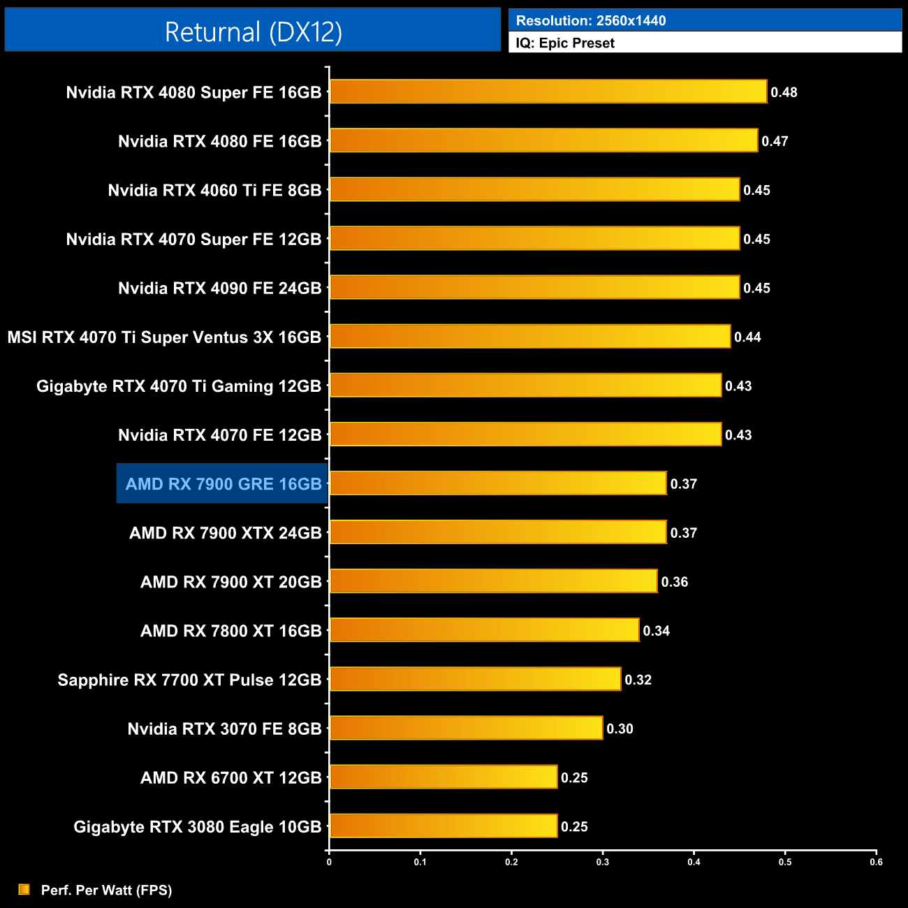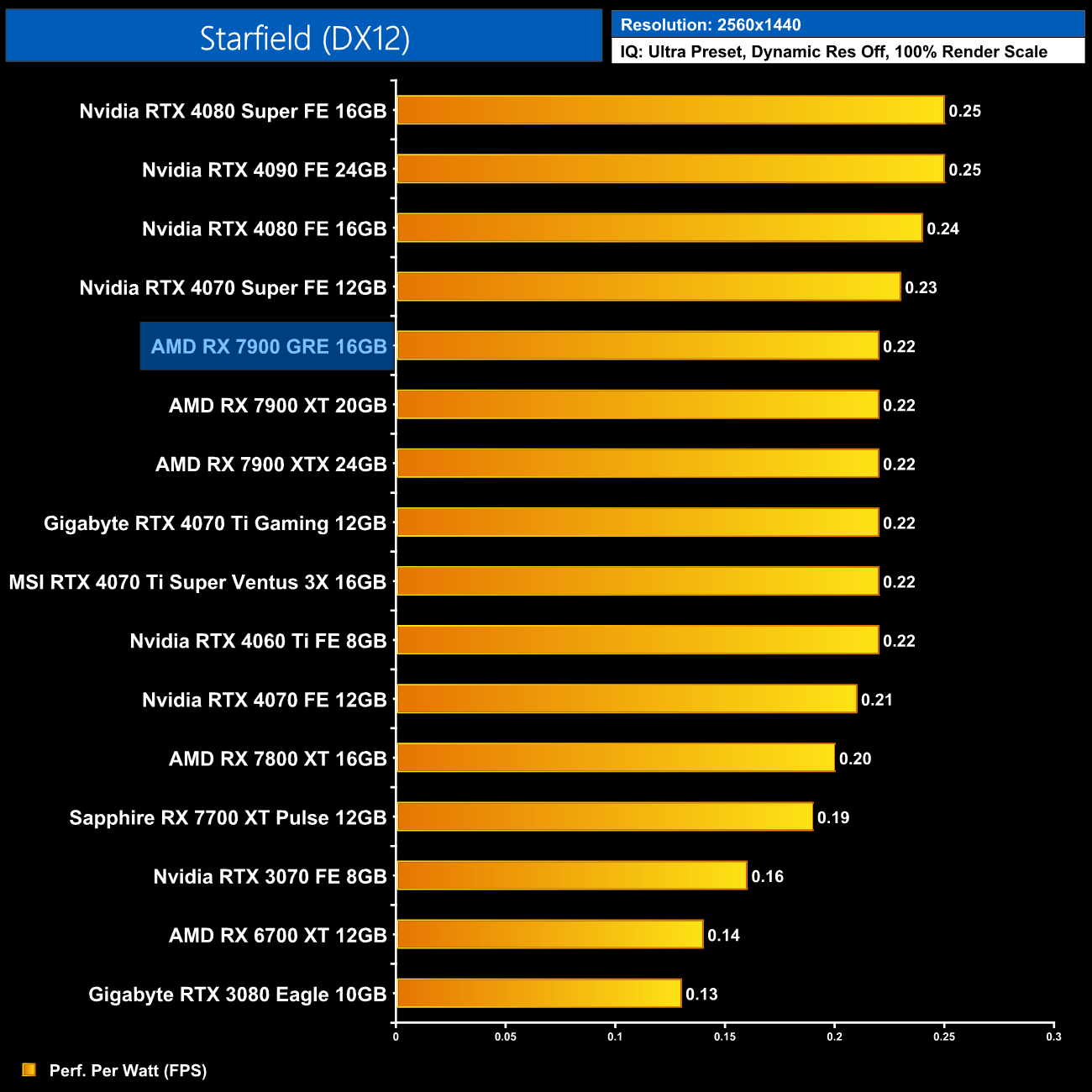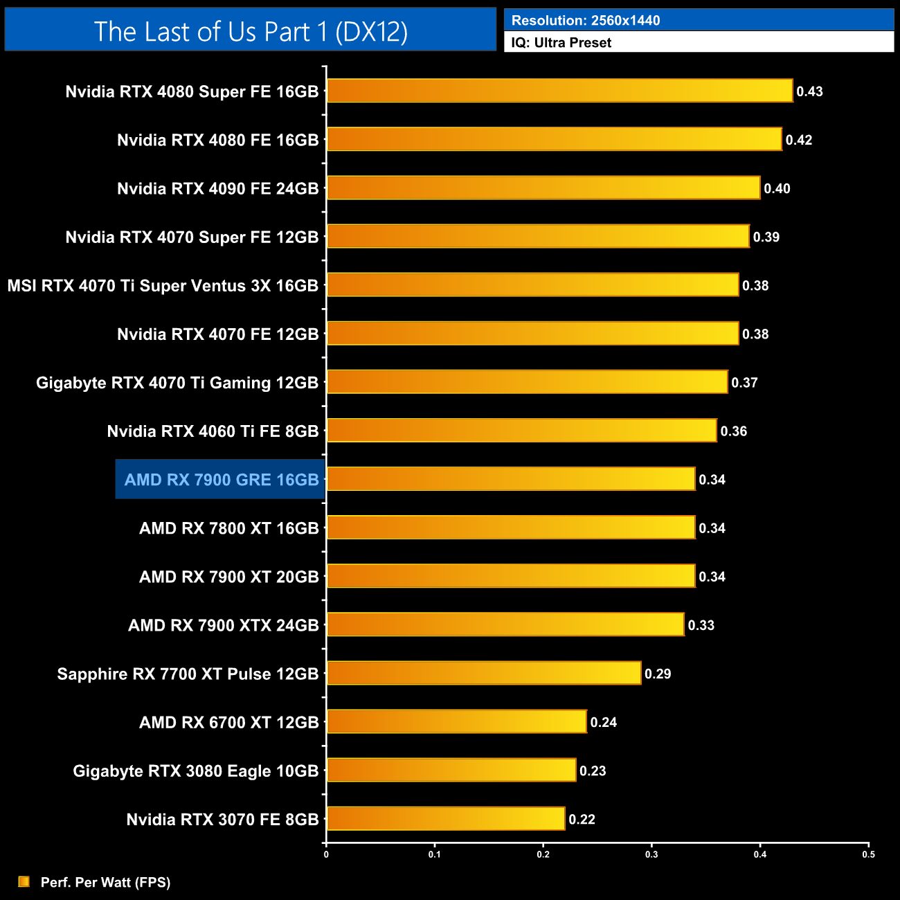 At 1440p, performance per Watt is now level with the RX 7900 XT and XTX. It's still fractionally improved over the RX 7800 XT, but we're talking very small differences here. That means Ada Lovelace remains the more efficient architecture, with the 4070 Super offering 19% better performance per Watt.