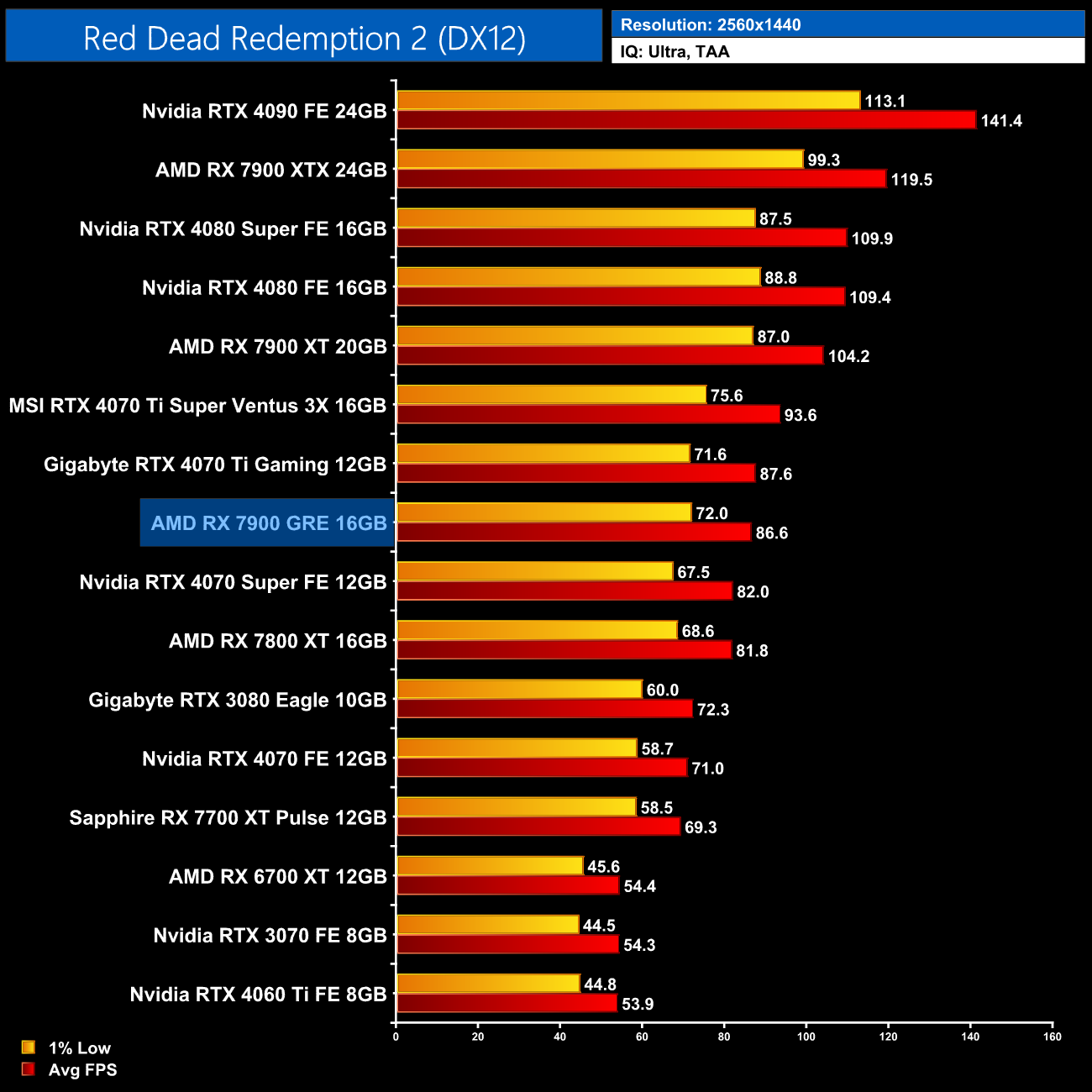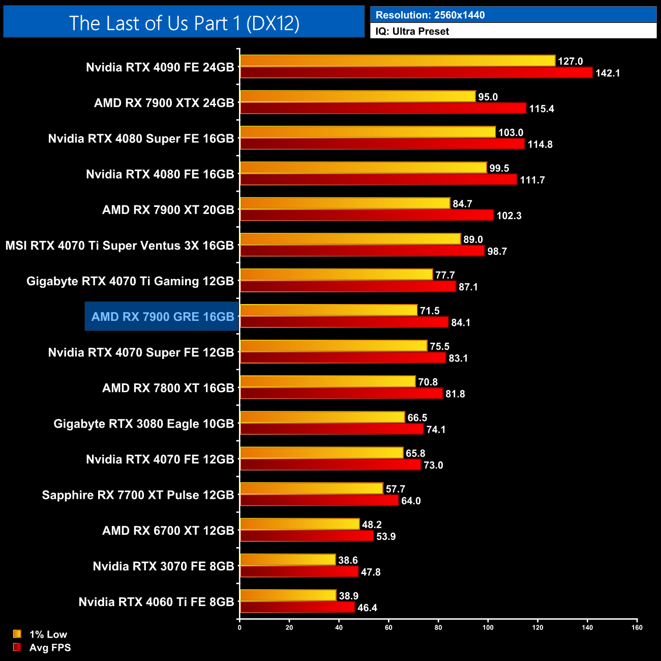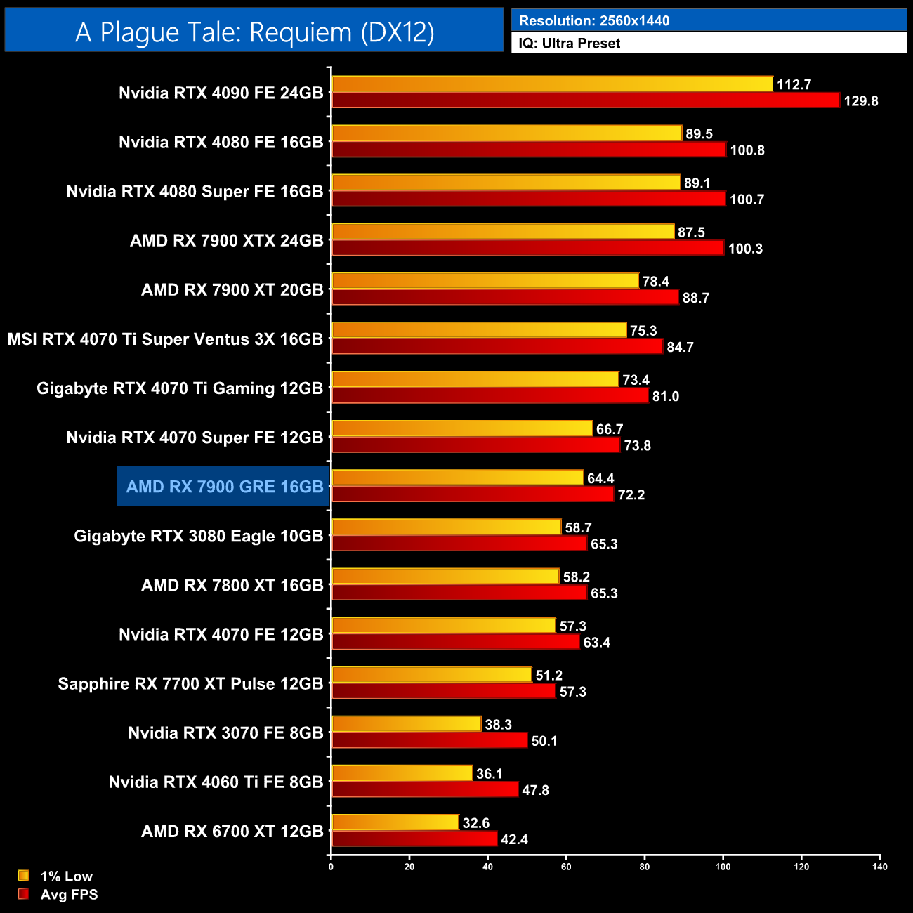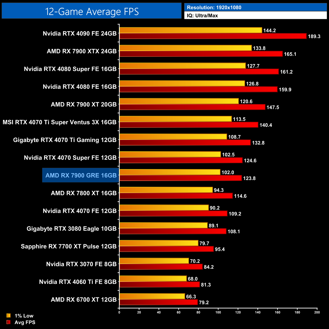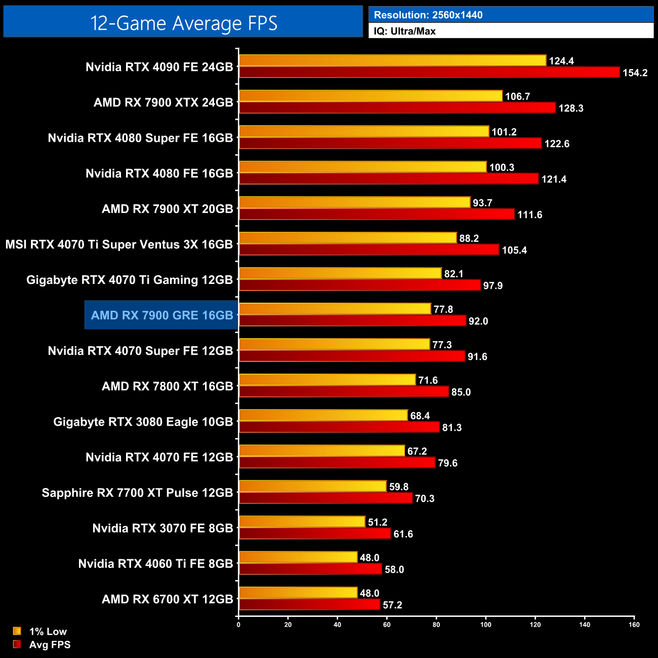 Overall, across the 12 games tested, the RX 7900 GRE averaged 92FPS at 1440p, putting it neck-and-neck with the RTX 4070 Super, as there's less than a 1% difference between the two. This means the GRE is 8% faster than the RX 7800 XT, which isn't a massive difference considering the fact it has a third more cores, while it is 18% slower than the RX 7900 XT.